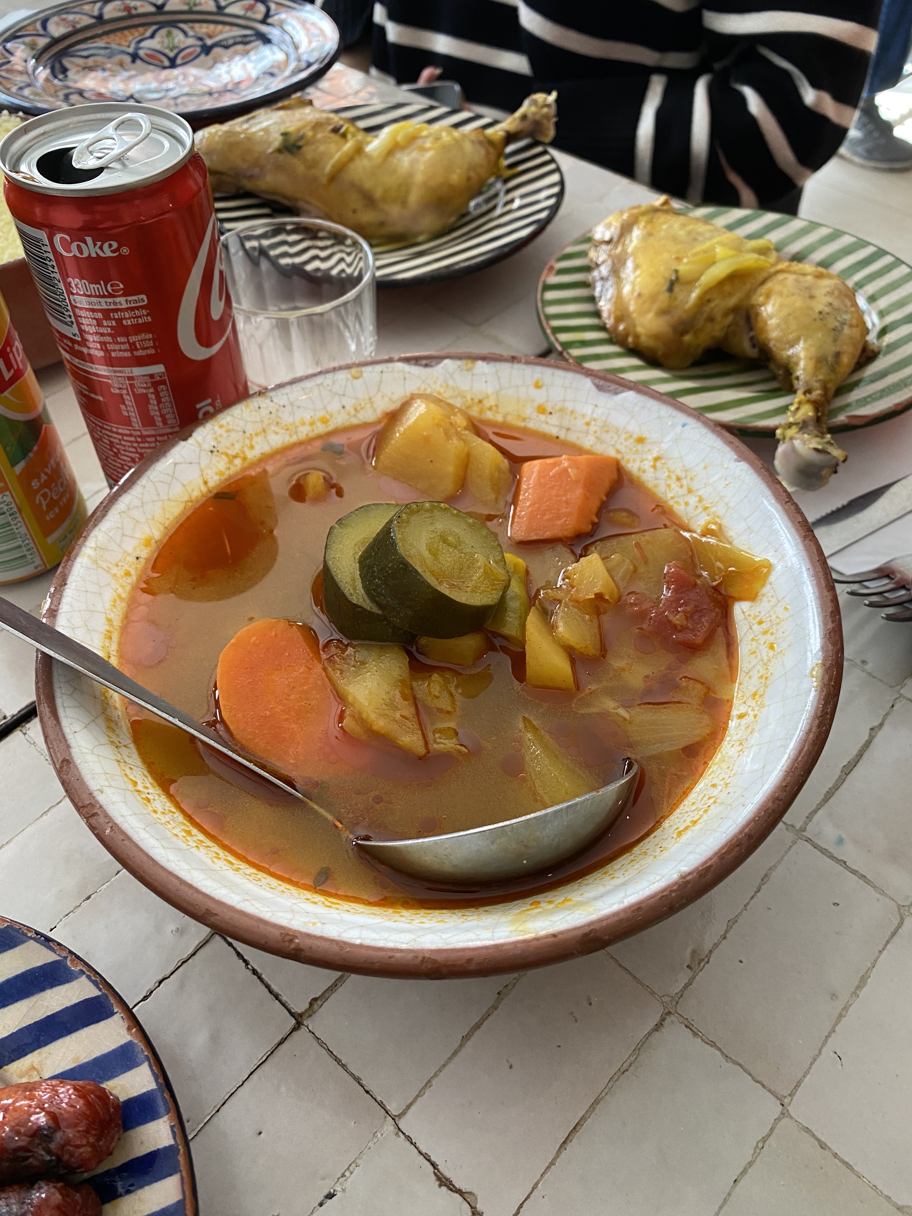 L’entrée ne paie pas de mine mais une fois dedans, ambiance très chaleureuse ! Le patron sait accueillir ses clients et nous mettre à l’aise à coup d’anecdotes. Nous étions un groupe de 8, il nous gentiment offert un zaalouk et une soupe en plus afin que nous puissions goûter, offert du thé à la menthe… Nous avions pris plusieurs types de couscous, un tajine d’agneau, tout était vraiment délicieux et la semoule incroyable 😍 Adresse à garder précieusement, je reviendrais c’est sûr !