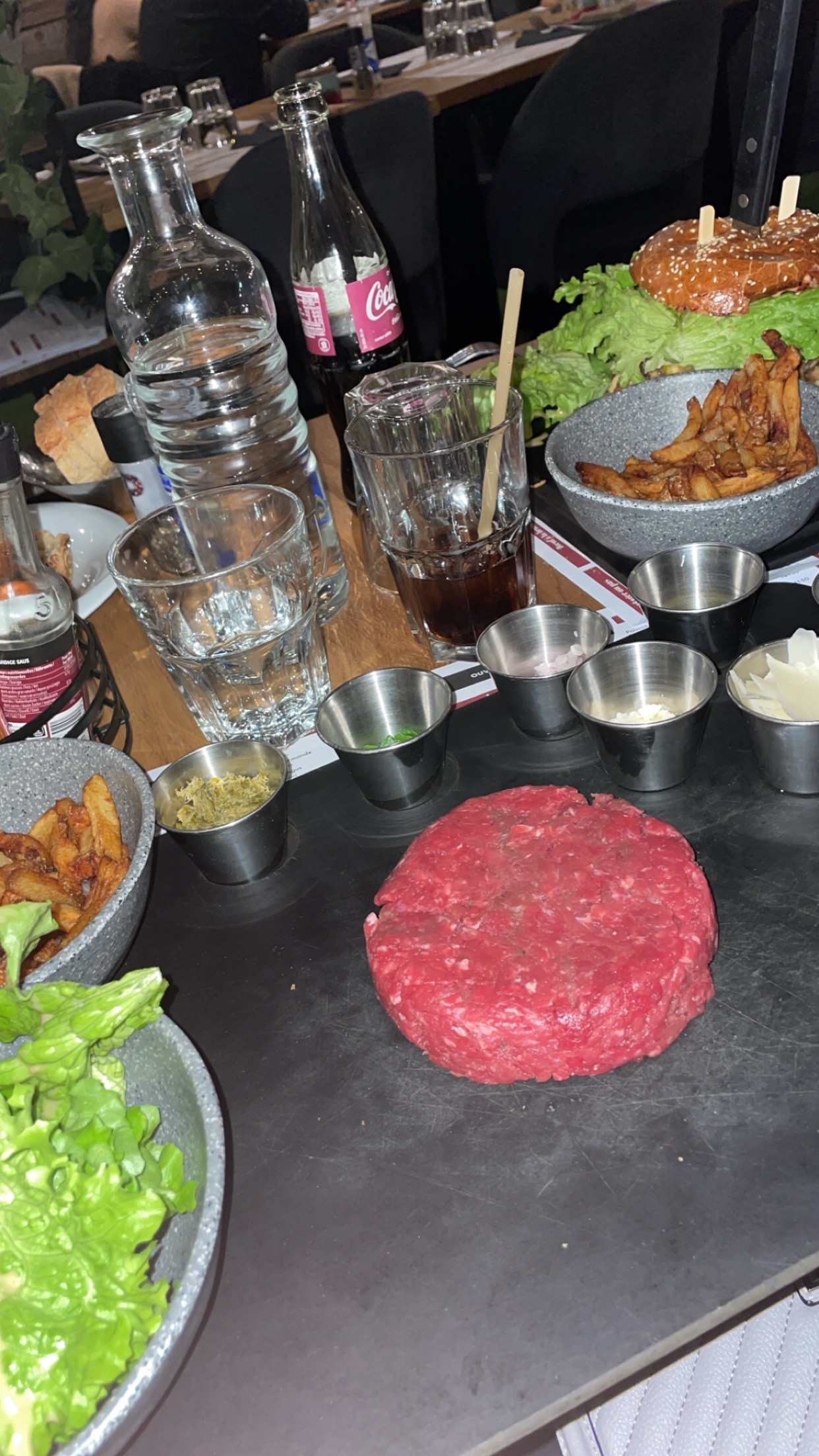 Du bruit, du bruit... Les chaises hautes sont très inconfortables Le prix pour 4 personnes 182 euros : 3 pièces de viande de 350 gr, 3 suppléments sauce, 1 double hamburger (600gr steak haché), 2 cocktails, 1 bière, 1 coca, 1 tarte au citron La serveuse d'une gentillesse extrême et très à l'écoute fait de son mieux mais, on nous a servi les cocktails et presque directement les plats C'est dommage car les viandes ne se mangent pas avec les cocktails sucrés qui étaient excellents ainsi que la viande, mais ça ne s'accordait pas du tout, gâchant le goût des deux La remarque a été entendue, et la serveuse réactive à proposer un geste commercial à la fin du repas : digestif et café... Très appréciable Il est à noter également qu'une viande pas assez cuite, a été retournée en cuisine pour être plus cuite, ce qui est très professionnel La note la plus juste serait 3,5 étoiles Expérience mitigée qui nécessite un autre essai