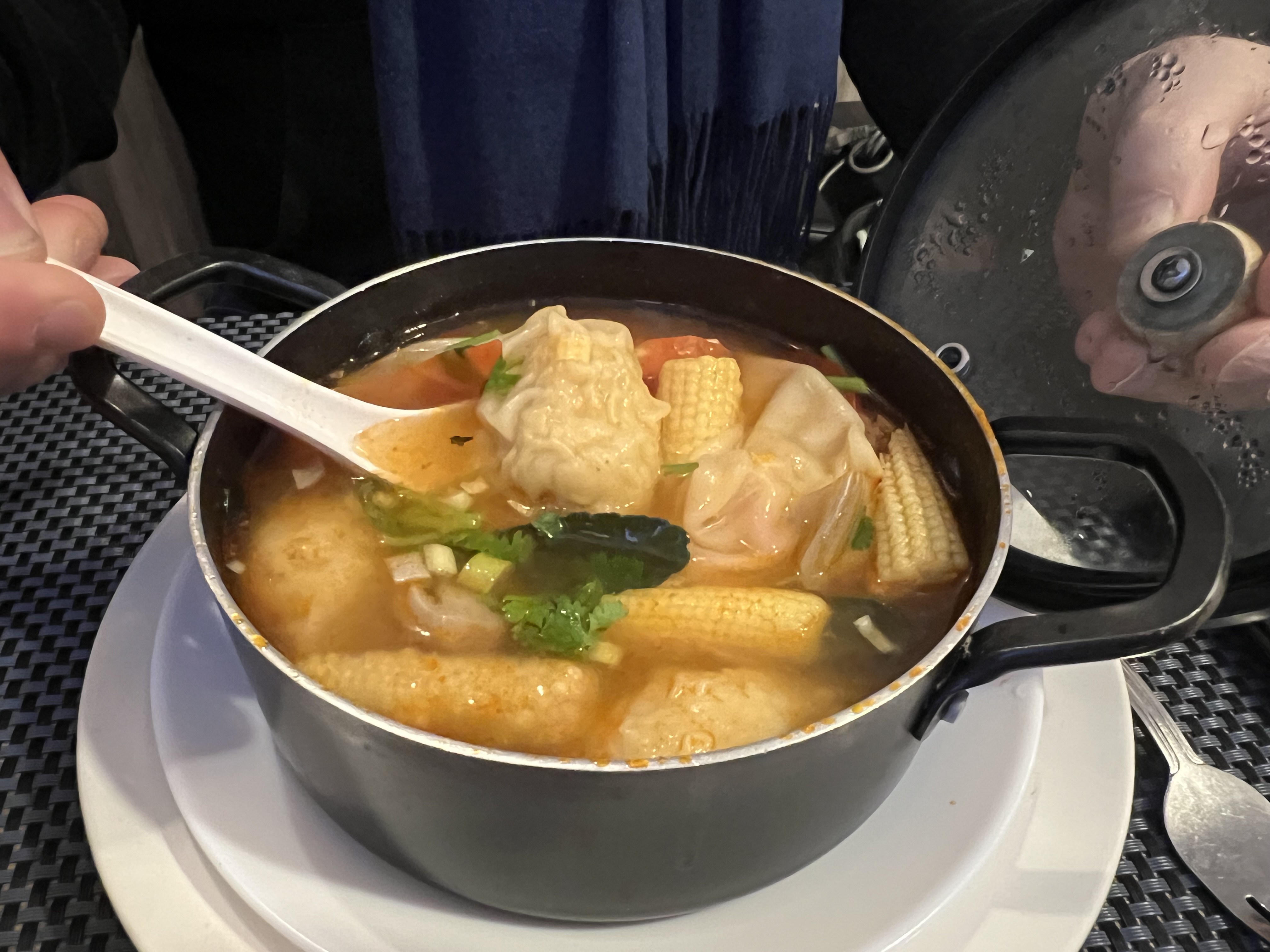 La soupe thai tom yam trop transparente c'est plus un bouillon le kao pat kaï pas trop de gout le riz est trop blanc pas assez sauté et melangé.