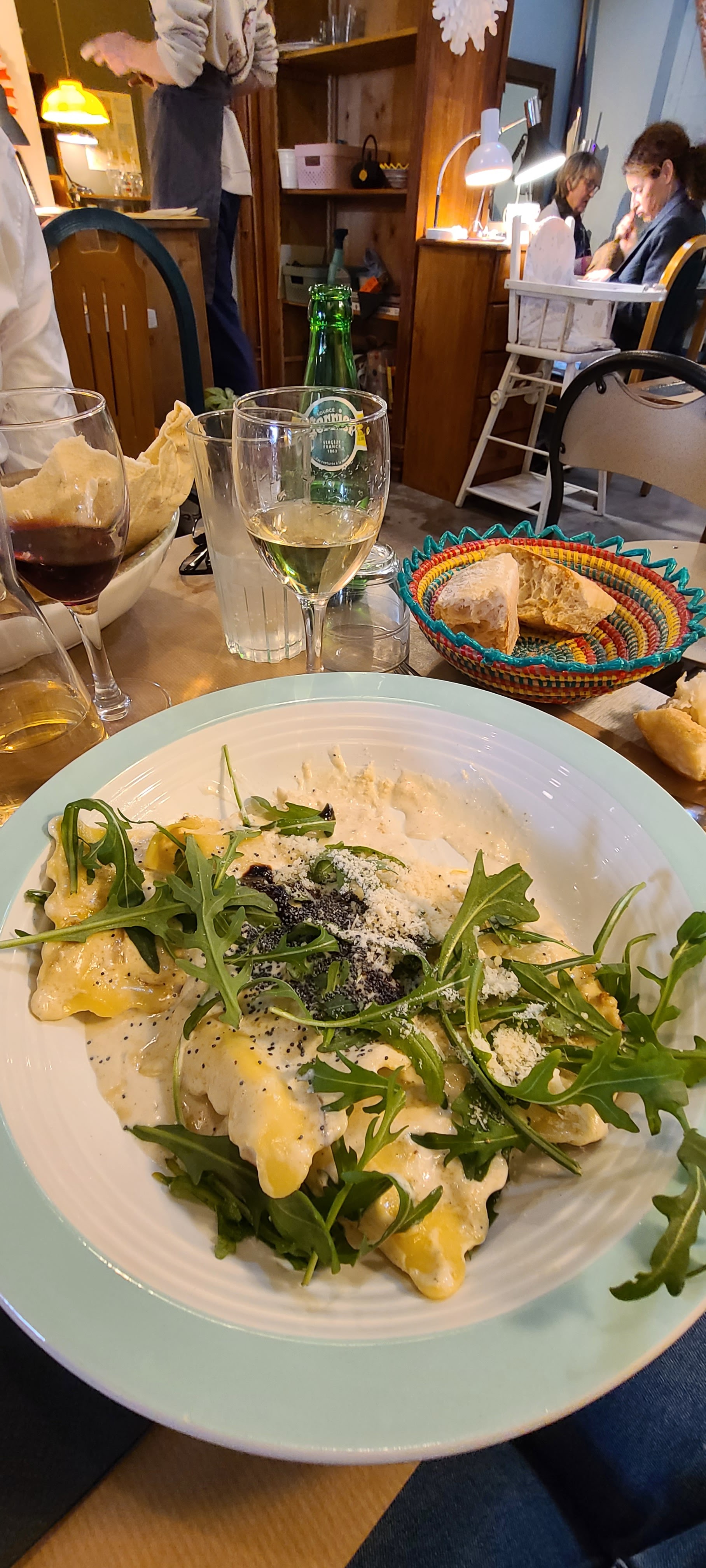 Lieu étonnant où on se sent tout de suite bien. Très bon accueil. Les raviolis à la truffe blanche étaient fantastique et la tarte tatin ,une tuerie