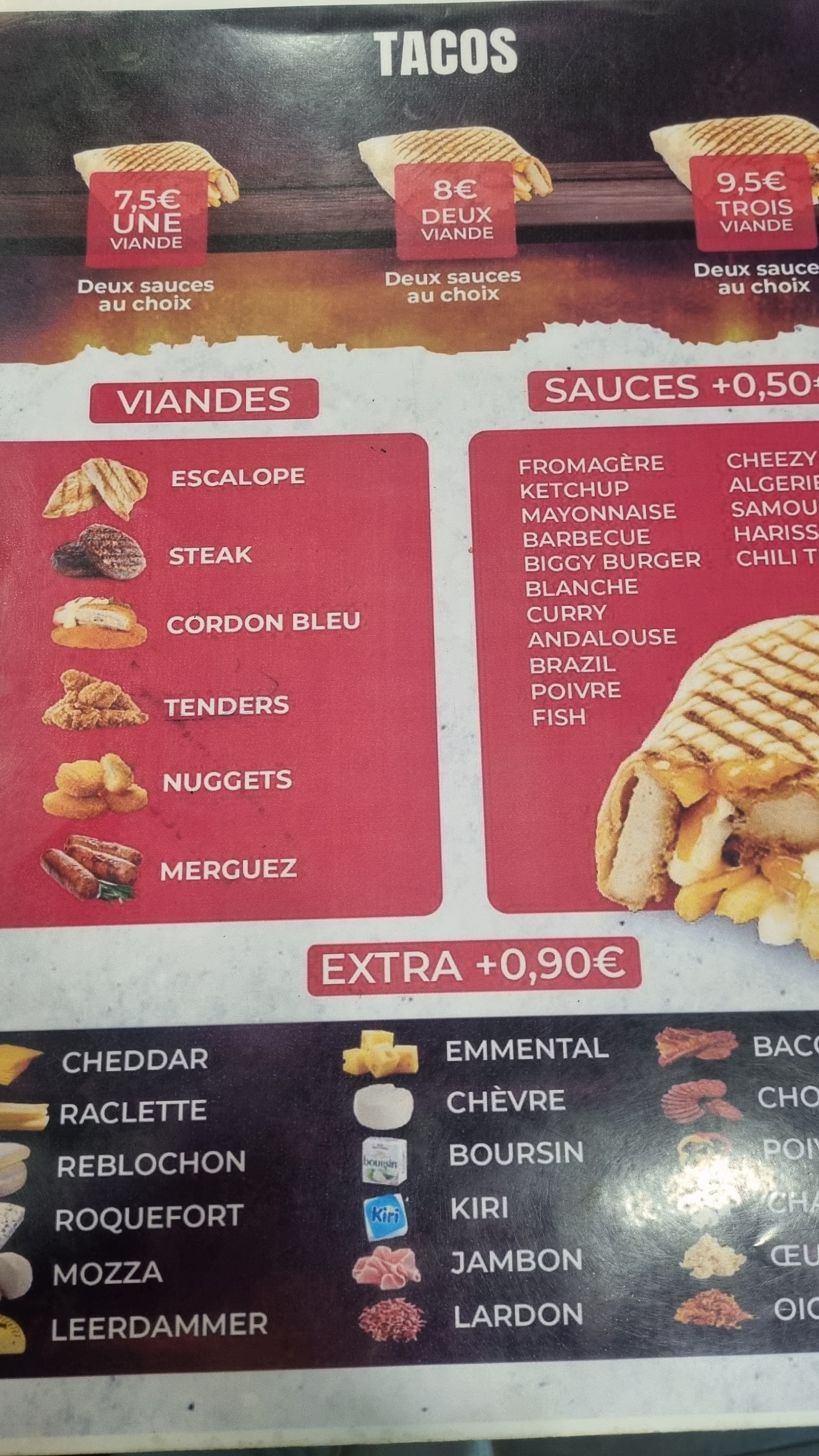 Fast food ouvert durant la nuit , les box composées je conseille, les burgers vraiment originaux , tacos bien faits ! Prix interessant, service rapide ! 👍🏻👍🏻👍🏻