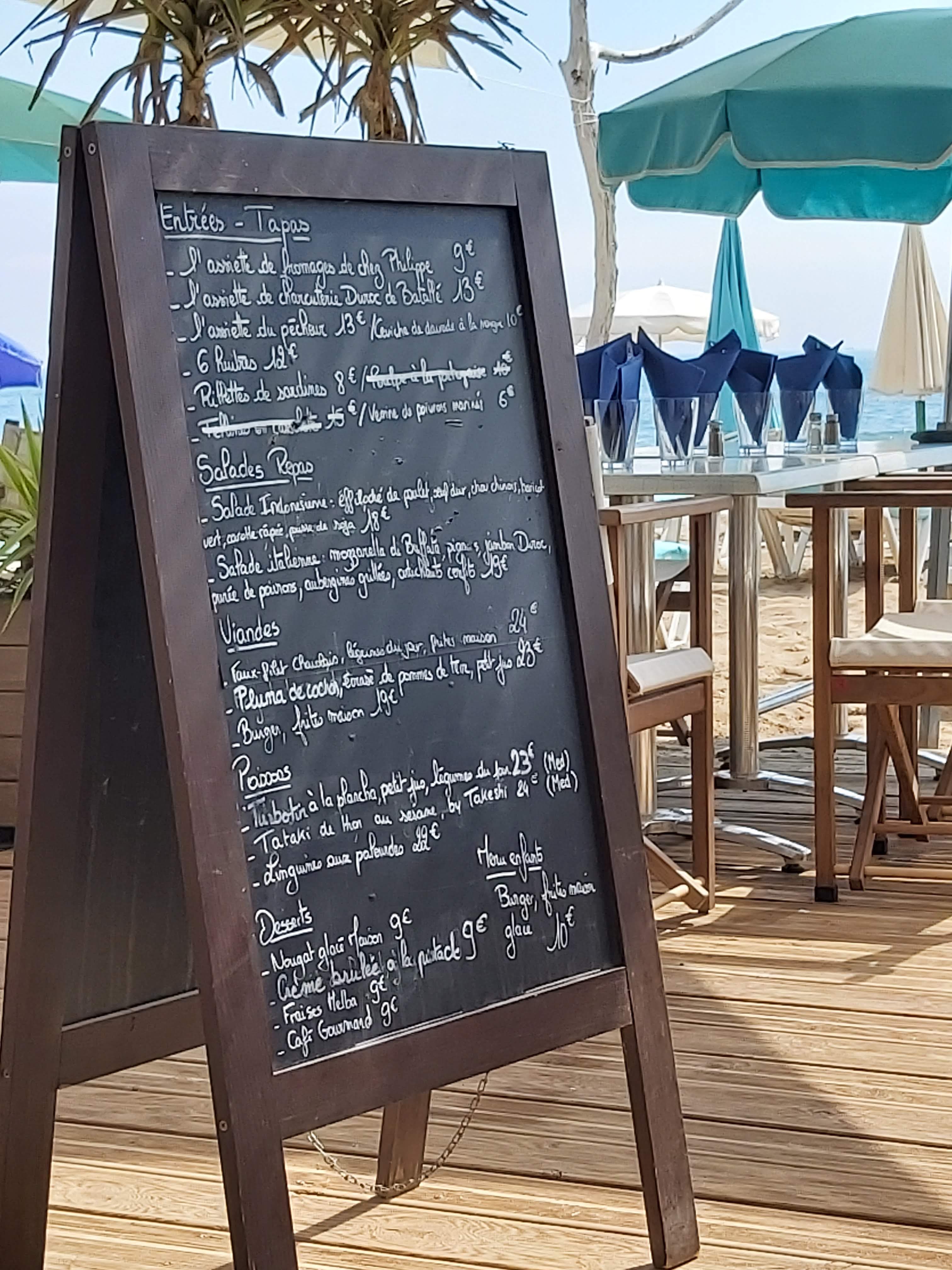 Évidemment très cher car c'est un restaurant de plage mais la qualité des plats et du service est au rendez-vous. Pour le service du midi, il faut penser à réserver quelques heures avant l'heure du repas, et sinon des chaises et des petites tables sont disponibles pour des glaces (très bonnes) et des tapas. J'ajoute que la plage est une des rares autorisées aux chiens.