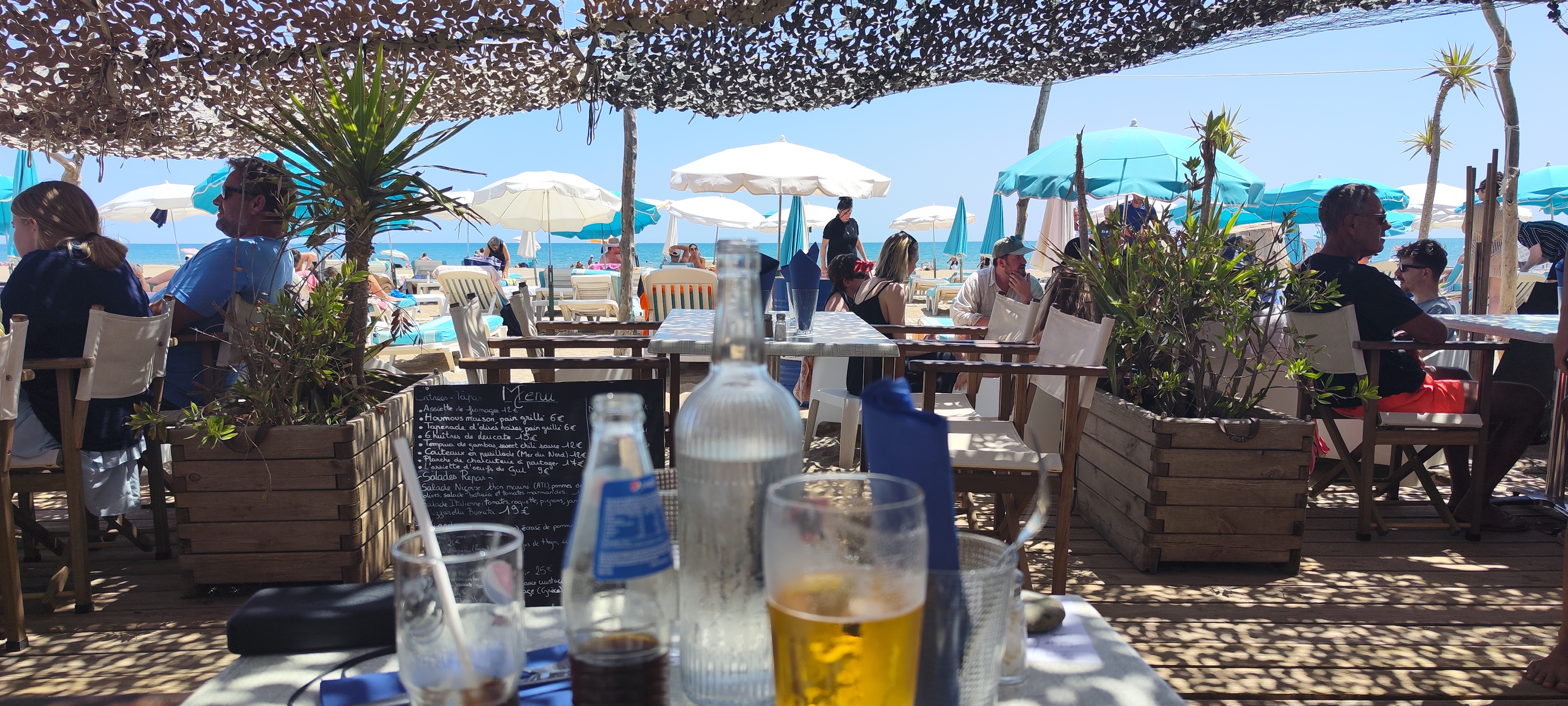 enfin une plage agreable et reposante,le bruit des vagues,petite musique d ambiance,pas de dj semi-nazes,ou de chanteurs vociferants pendant que tu tries ta daurade... une equipe sympathique et performante... des produits et une cuisine dignes de ce nom... a decouvrir ou a refaire ou ce que vous voulez,c est bien++