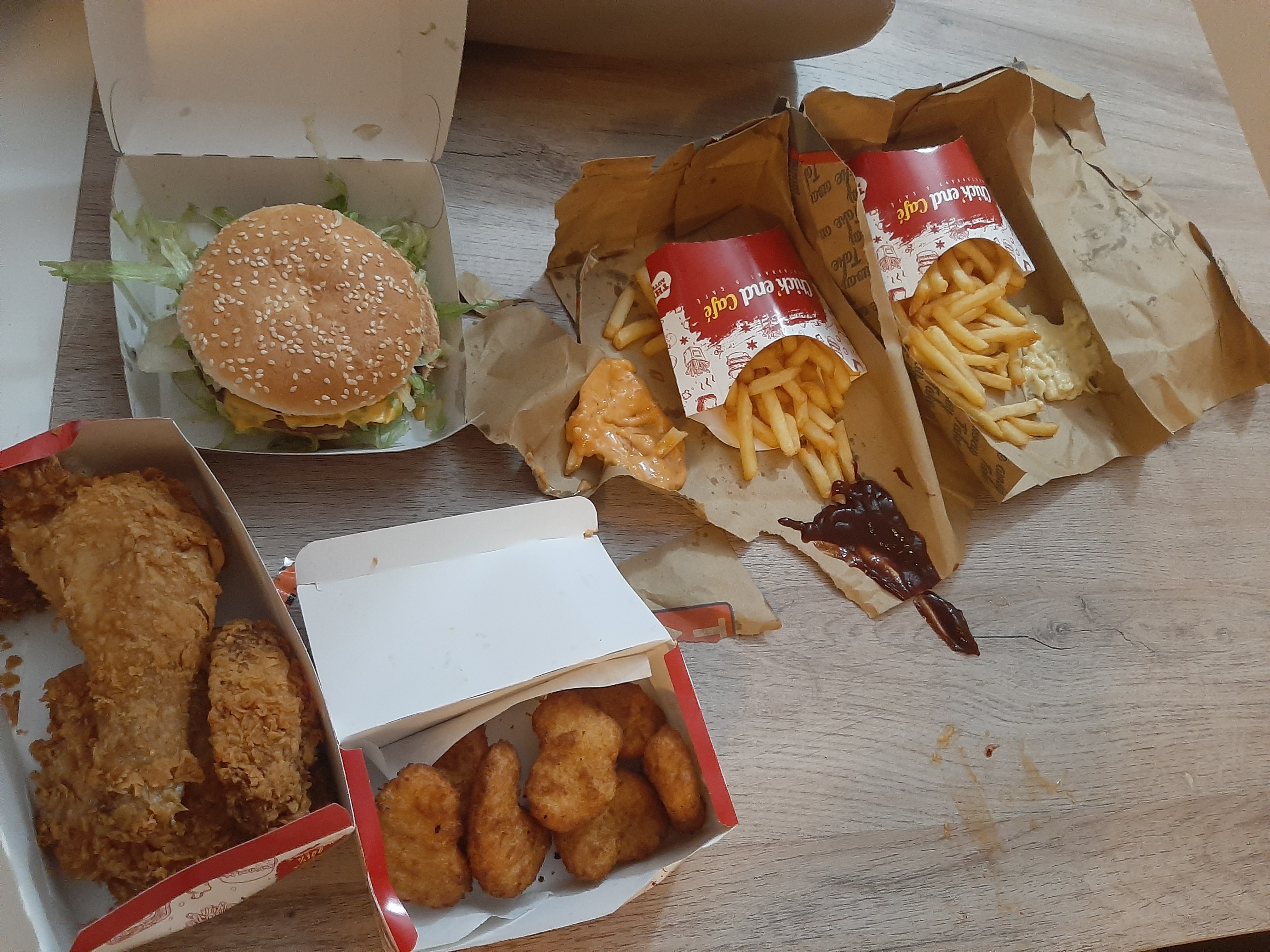 Un jour en fin d'après midi, j'ai pris un Menu Méga familly au tarif de 24.90 Euros au Chick'end café de Cergy Préfecture. Le serveur, un jeune homme hésitait de nous remettre la bouteille de boisson qui est inclus dans le menu, en nous stipulant qu'il nous l'avait déjà donné, après qu'on lui prouve qu'on ne l'avait pas, il nous remet le menu dans un emballage en nous disant après paiement qu'on ne pouvait pas manger sur place puisqu'il allait fermer pour des raisons de travaux. En sortant, on pouvait que manger les frites en marchant jusqu'au parc situé à 2 minutes du Chick'end Café. Sur 4 sachets de frites une seule était chaude, les 3 autres étaient froide et pas bonne, on n'a pas pu les manger. Sur le coup, je n'ai pas pensé à faire demi-tour pour me plaindre au serveur, mais je n'irais plus manger dans ce Chick'end café de Cergy.