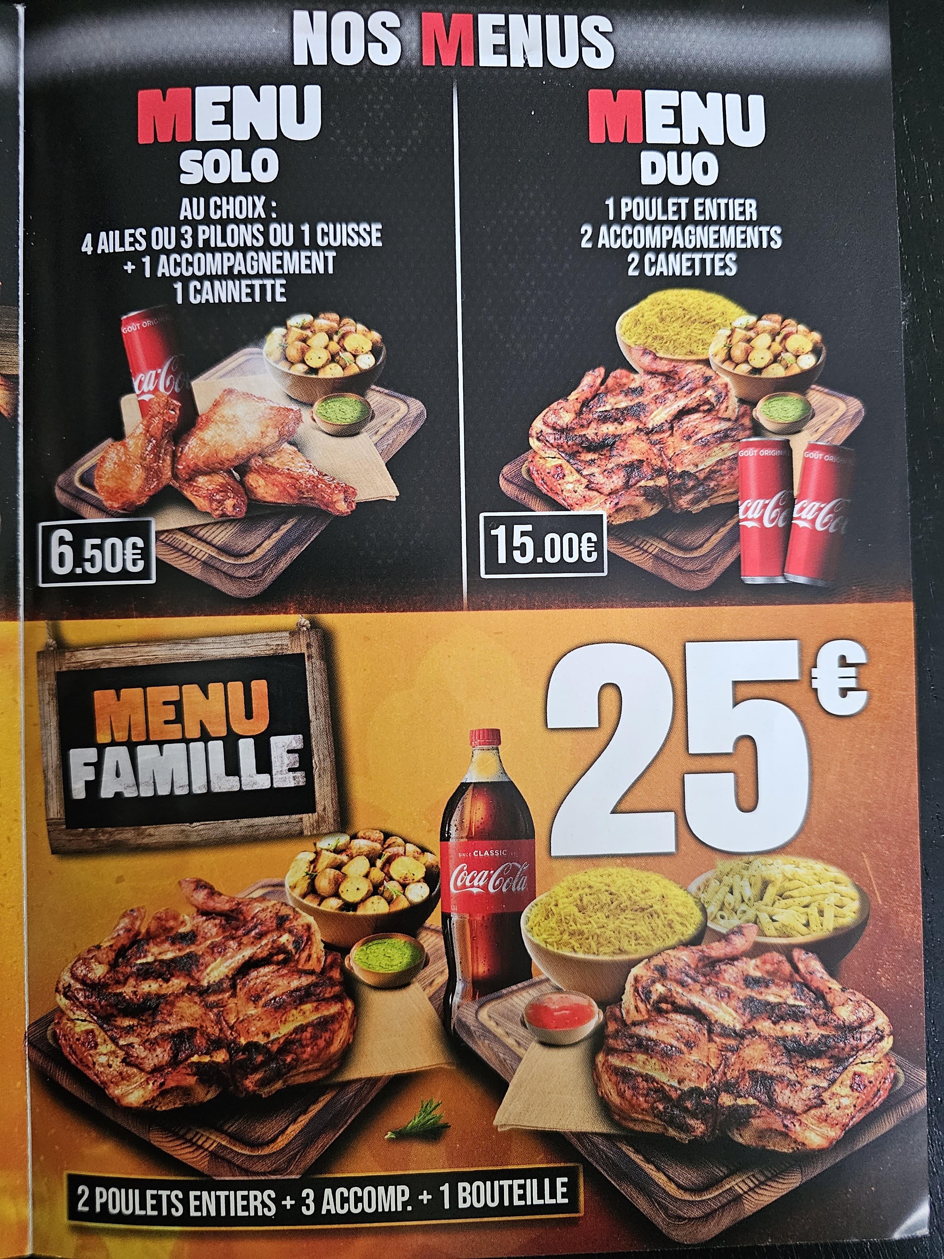 Le poulet est délicieux et Halal certifié. Les accompagnements sont très bons. Rapport qualité prix très bon.