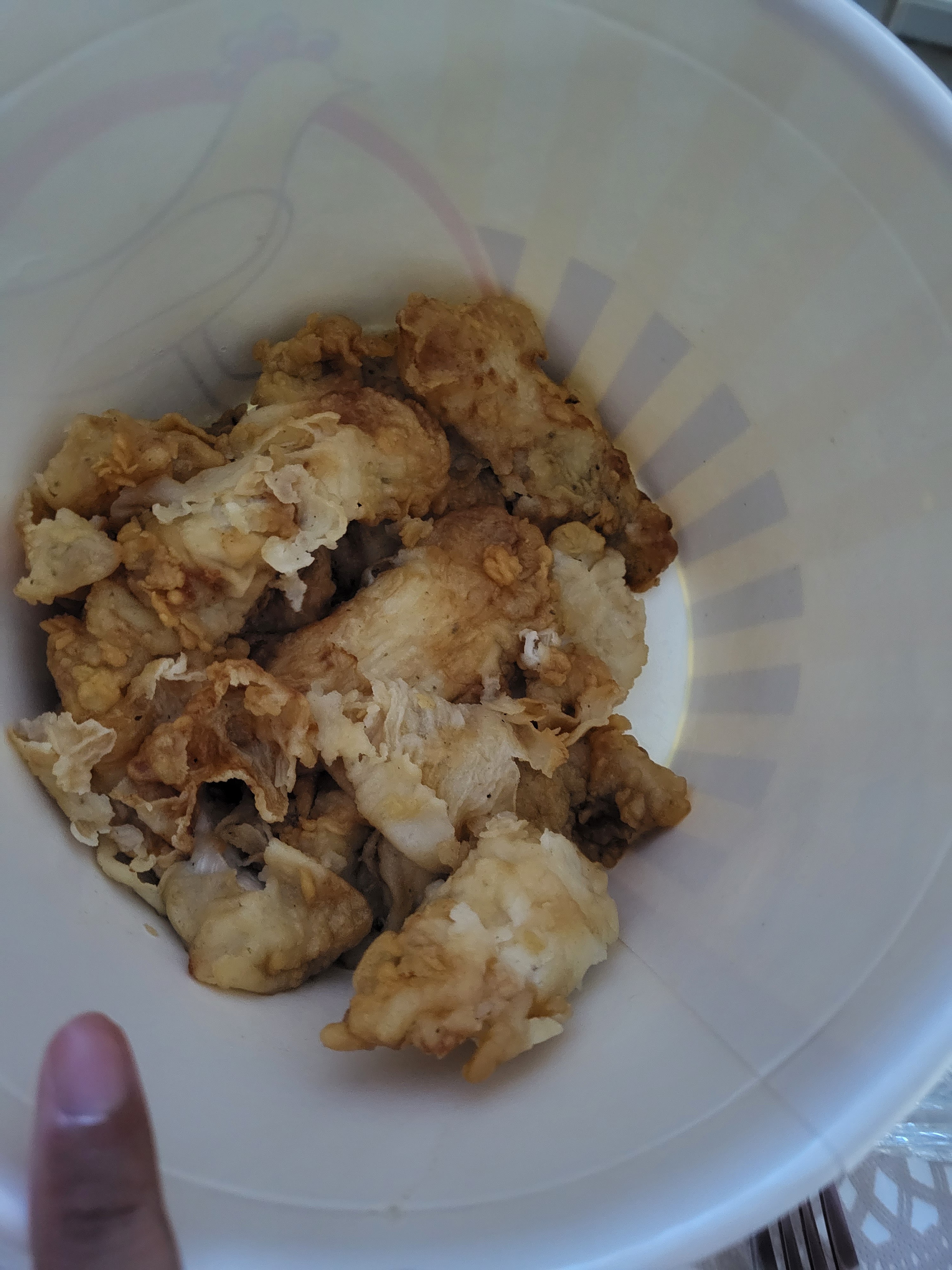 J’ai voulu me prendre un truc rapide en allant au boulot et du coup j’ai opté pour le bucket mix… Résultat ?! Très déçue Les tenders ressemblaient à des nuggets tellement ils étaient petit. Ça ressemblait plus à des morceaux de tenders plutôt que plusieurs… Le poulet n’était même pas cuit, imbibé d’huile et la panure dessus était encore quasiment crue Seules les frites était mangeable, j’ai dû jeter le reste