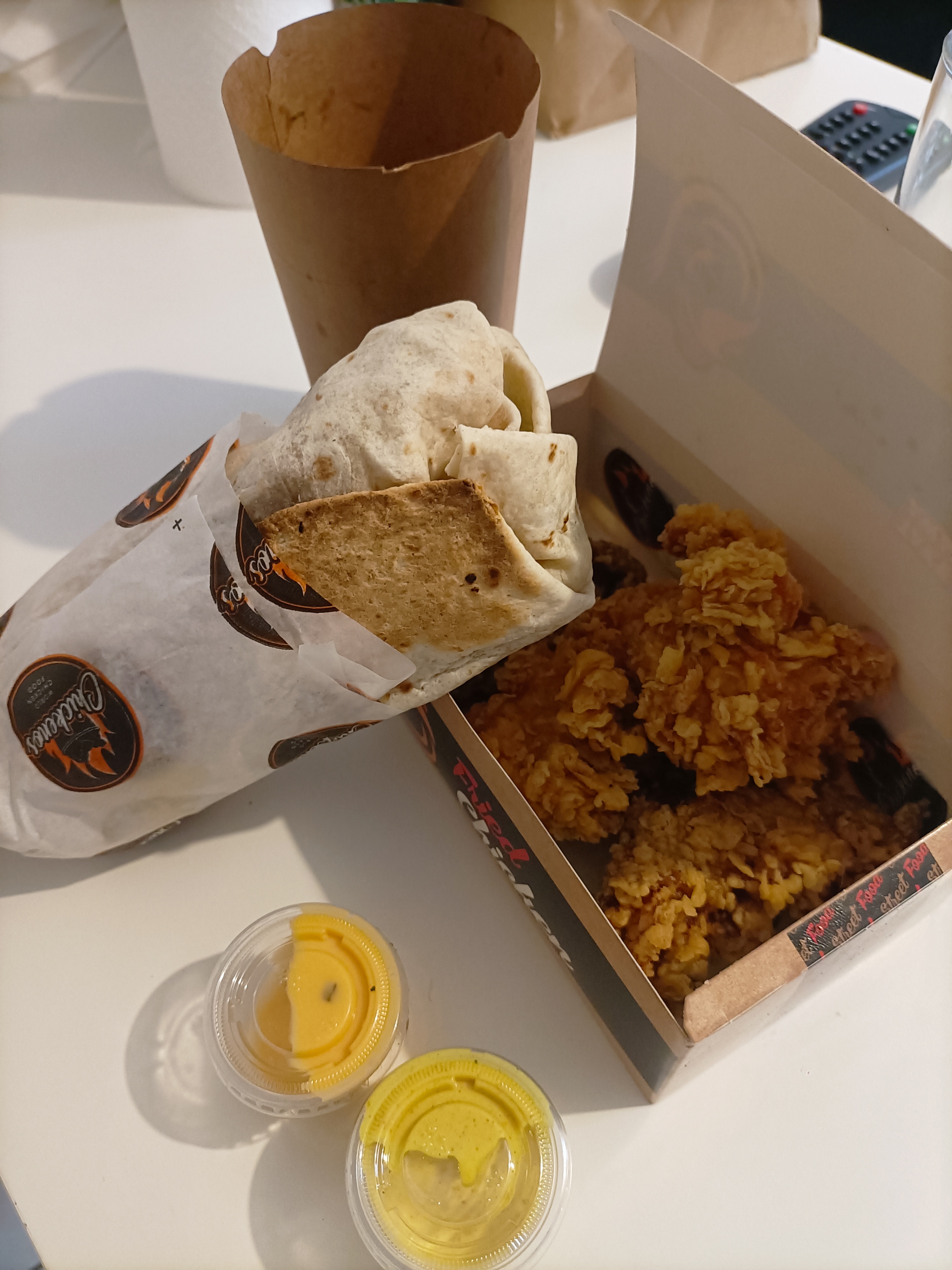 Horrible expérience le poulet n’est même pas cuit ( je doute qu’il soit périmé car c’était le jour d’ouverture), on a faillit vomir avec les collègues (Une veine de poulet dans le tenders) et l’assaisonnement des Dynamite Chicken est à revoir .