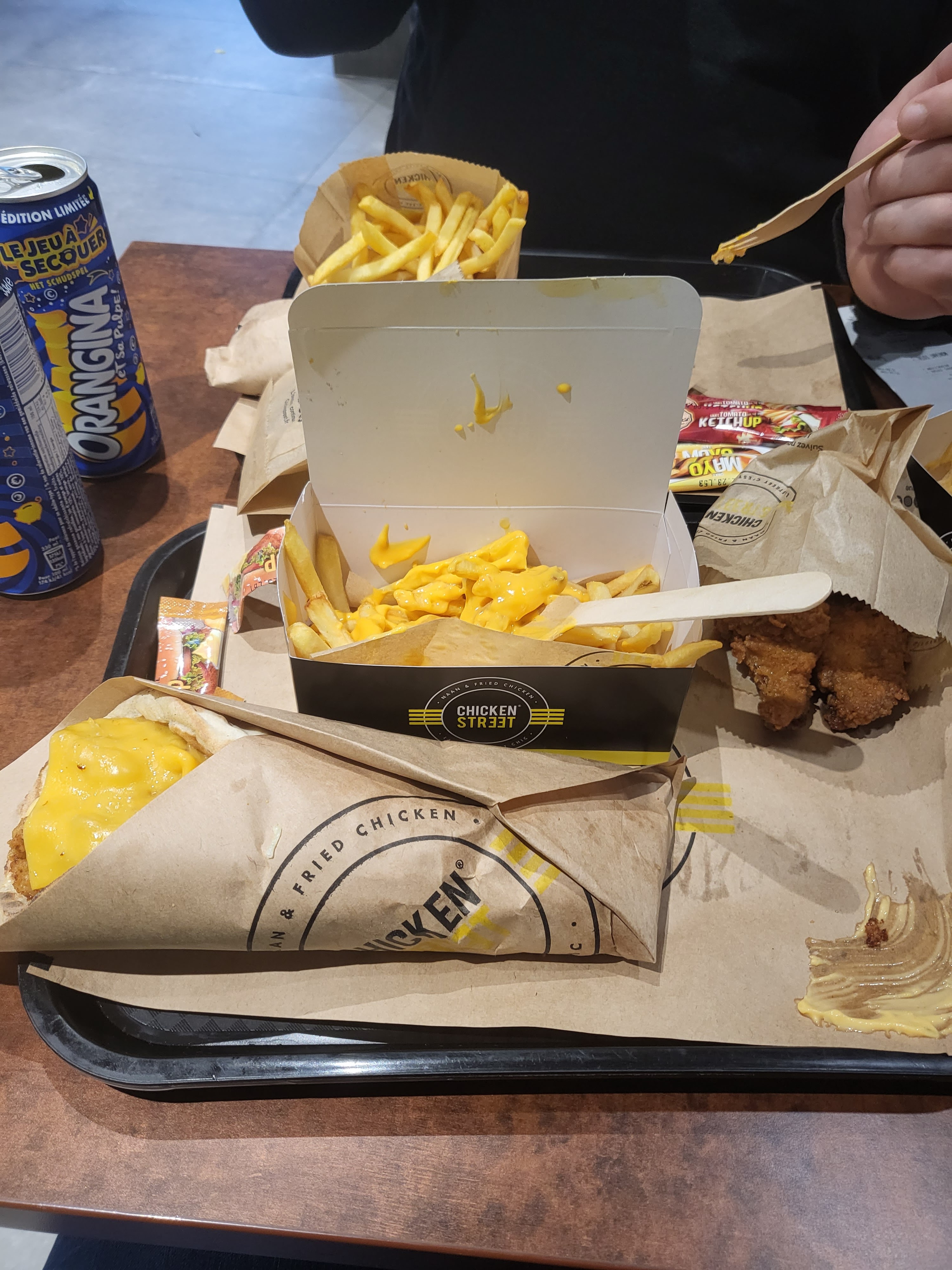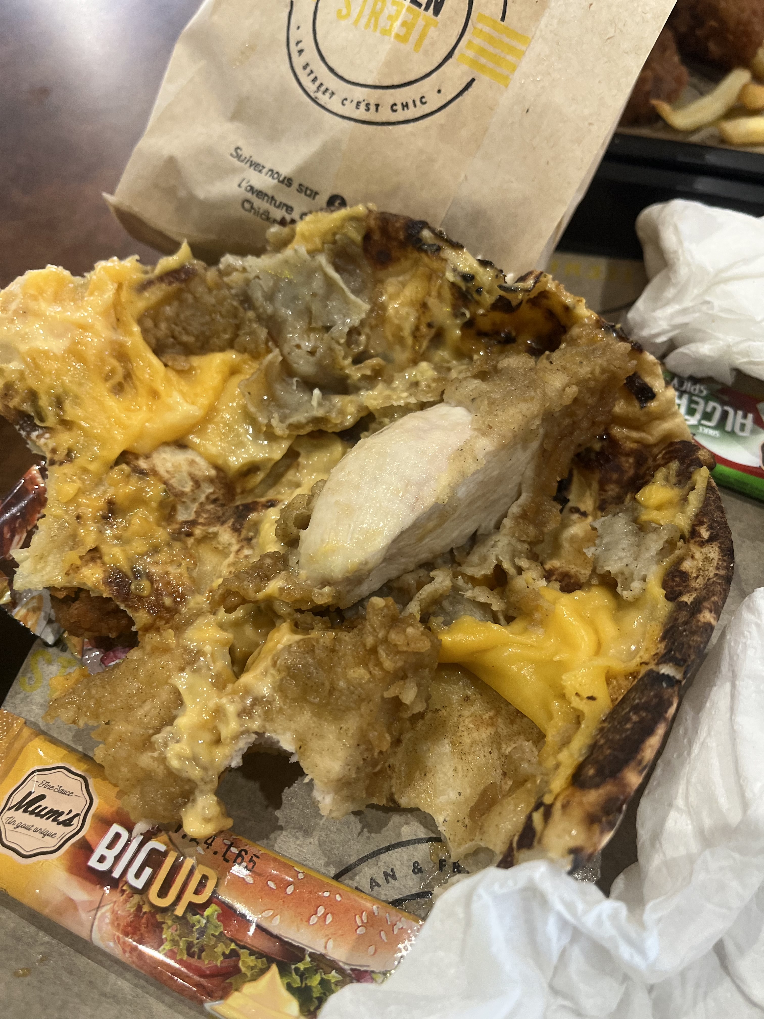 Faut dire ce qui est le poulet c'est maîtrisé . Vraiment bon avec des super Naan. On a bien mangé. J'ai voulu essayé pas mal de choses. J'ai pris un naan suprême, un naan tenders et des wings. Franchement un délire j'ai aimé et je recommande chicken street. Les frites cheddar c'est un délire simple mais efficace.
