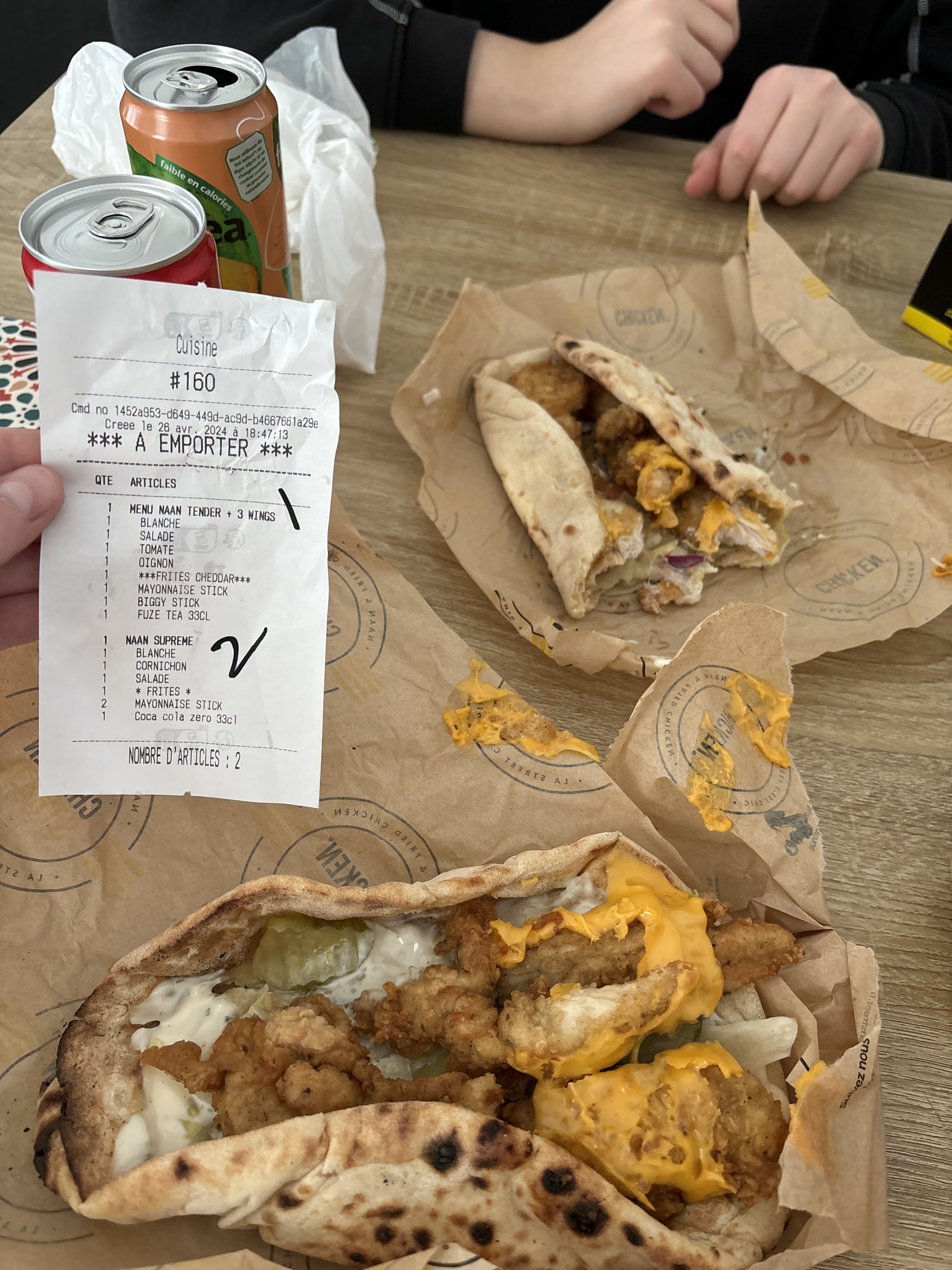 Commande à emporter sur place, arrivée à domicile, pas de sauce, et la naan ne correspond pas à ma commande pourtant sur les deux tickets de caisse c’est bien écrit ce que je souhaitais. Commandé un naan suprême (œuf steak boursin) je me retrouve avec des tenders et du cheddar…. Pourtant il n’y avait pas foule (j’étais la seule à commander)