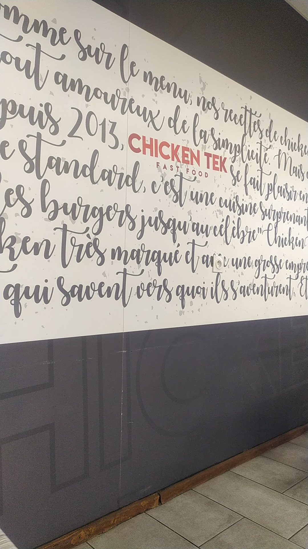 Je passe toujours à chicken tek, très bon wrap, des tenders épices délicieux, les wings également, bon tacos. Personnel très sympa.