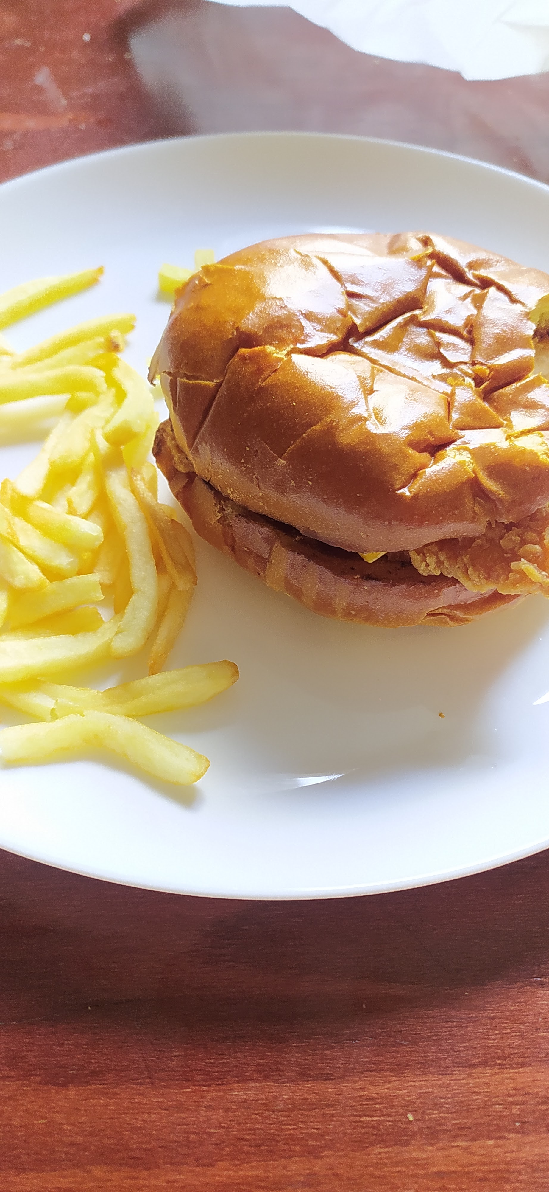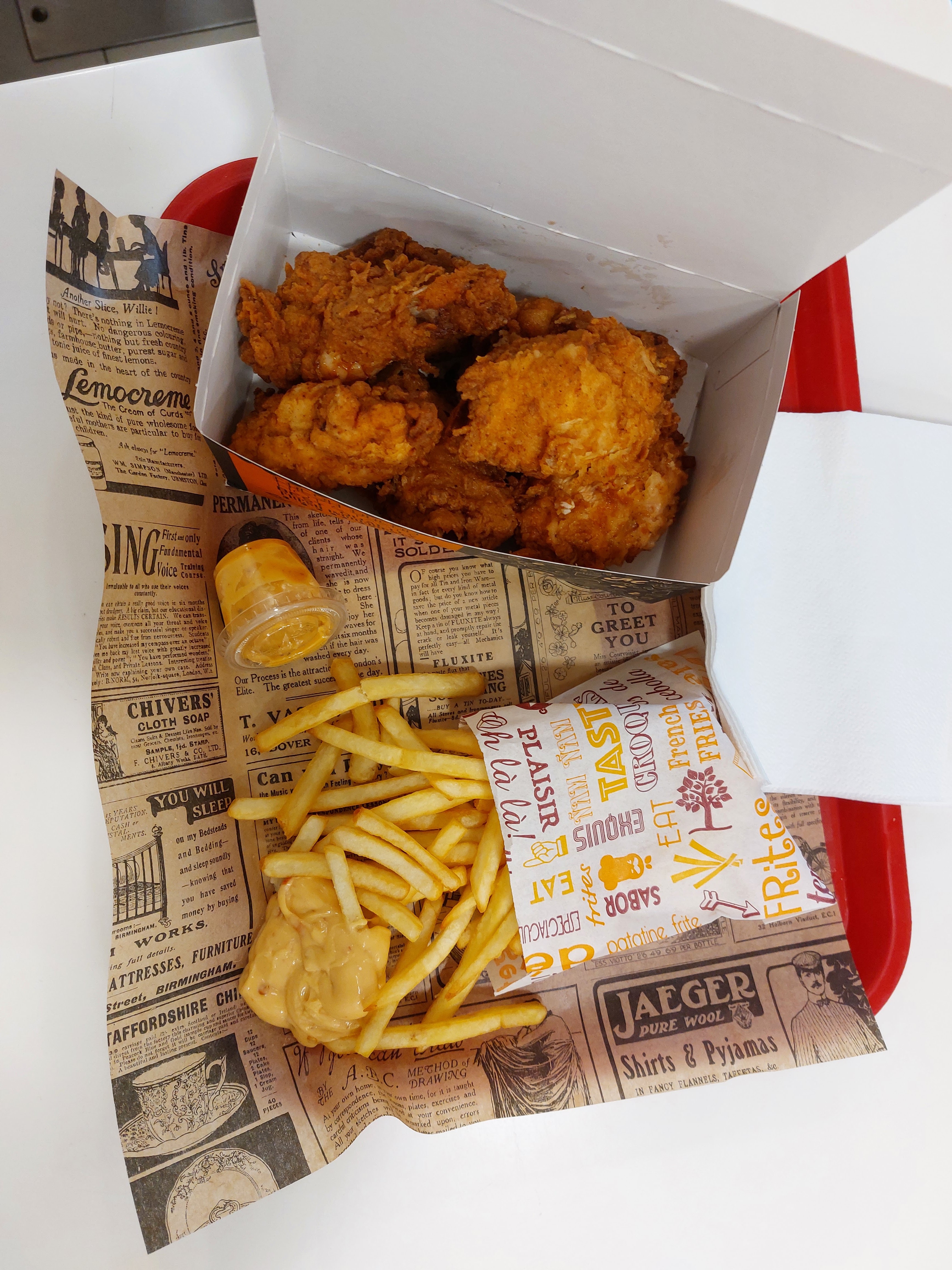 Frites un peu grasses et poulet frit manque un peu de panure, mais le poulet est vraiment bon et juste piquant comme il faut 👌