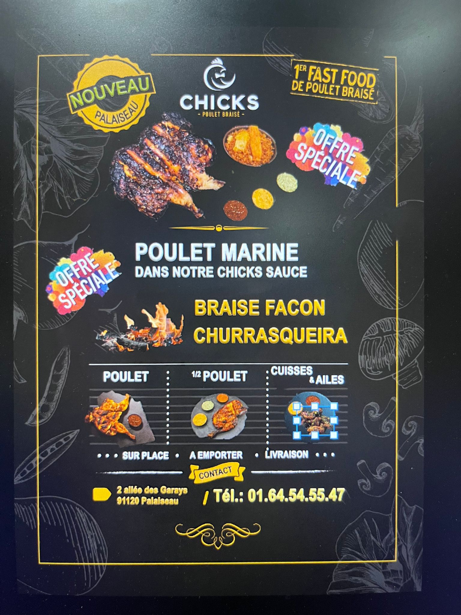 J'ai commandé pour la première fois chez Chicks et je vous conseille absolument d'en faire autant ! Le patron est très très sympa et prend vraiment en compte l'attente de ses clients. Nous avons mangé du poulet braisé, des nuggets, des wings et leurs patates sautées à l'ail.... une tuerie!!!!! On sent que leur poulet est vraiment frais ! Leur sauce verte est vraiment incroyable et se marie absolument avec tout, bien que tout soit suffisamment mariné avec goût ! Merci pour votre gentillesse et votre savoir faire qui a su nous ravir !