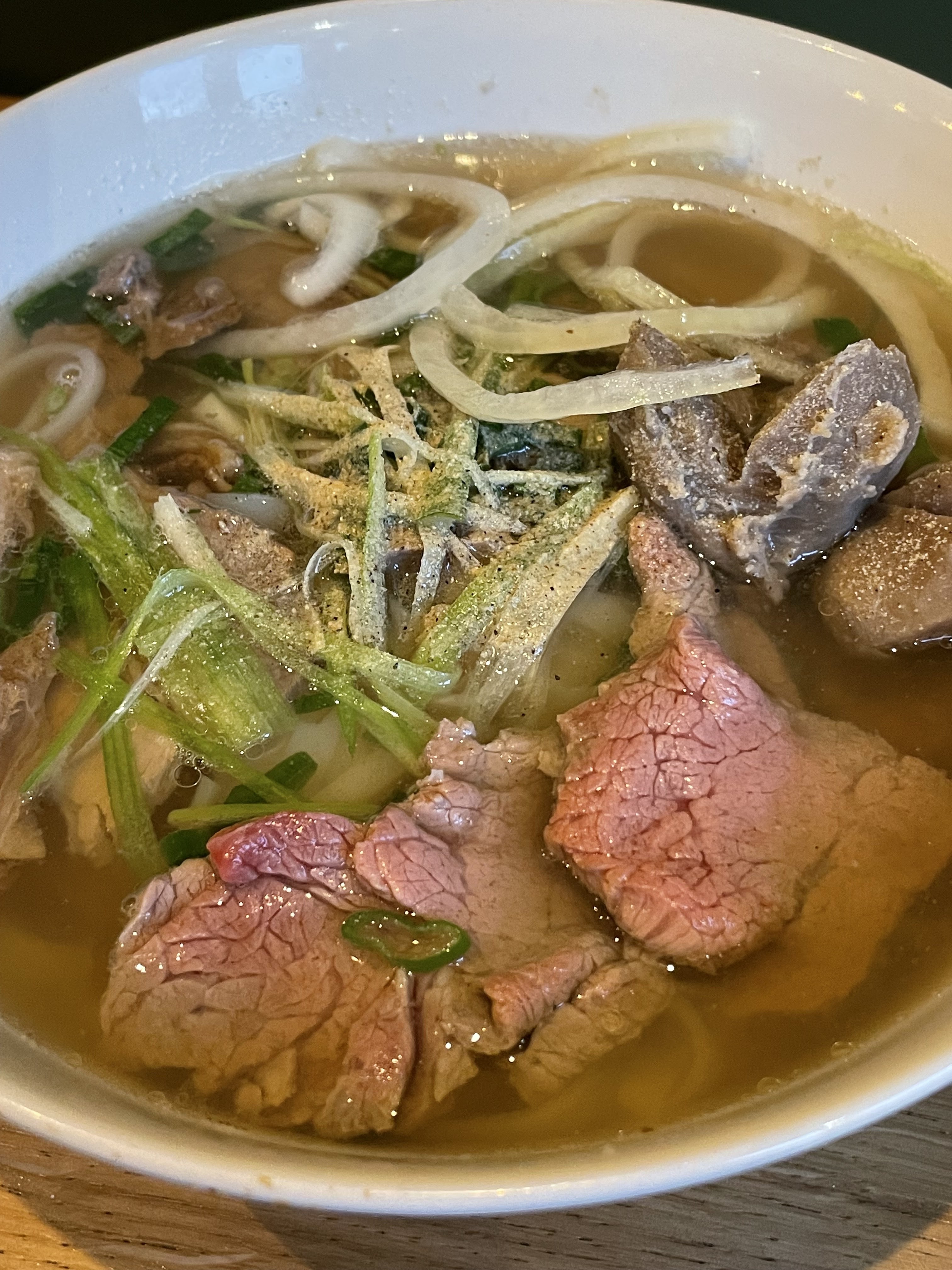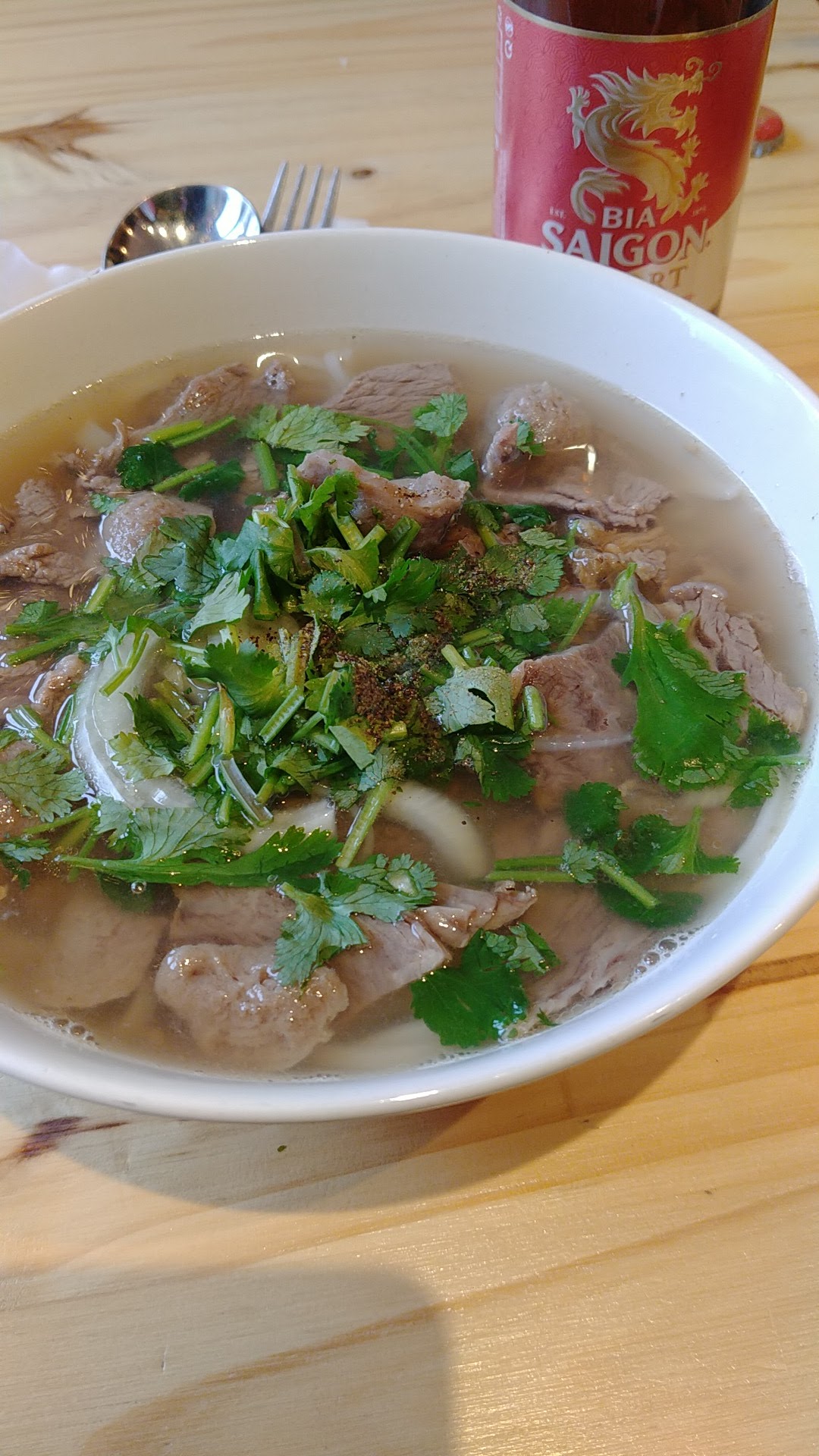 La soupe Pho ici est très délicieuse, légère, sans MSG, mais sucrée grâce à sa cuisson avec beaucoup d'os