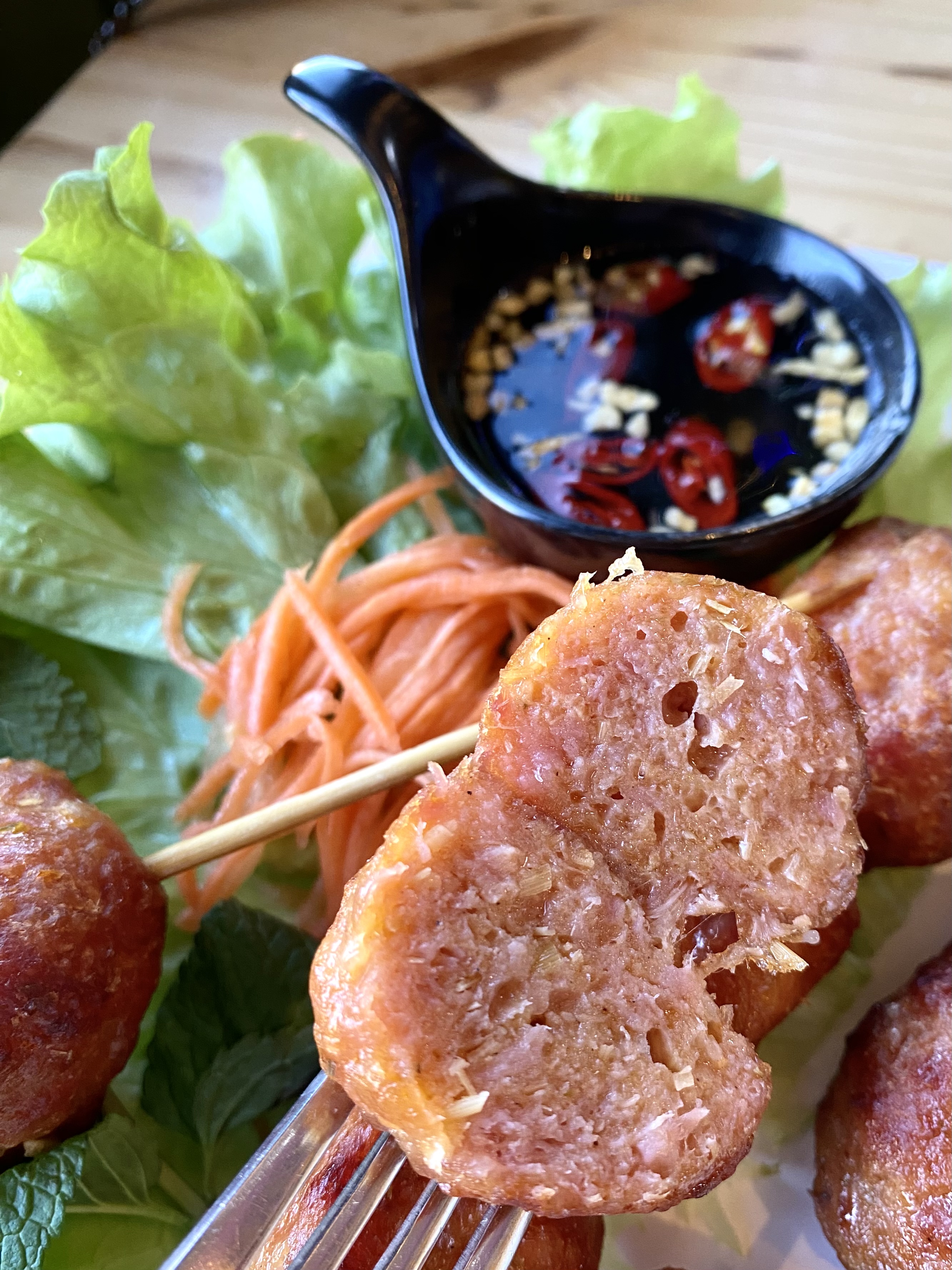 Je suis venu à Chi Hai un samedi pluvieux, un peu froid mais l'ambiance conviviale du personnel m'a réchauffé. On m'a servi des Chạo Tôm qui sont 3 brochettes de crevettes grillées à la canne à sucre servies sur un beau plateau traditionnel vietnamien en bambou. En tant que vietnamien, je confirme que la saveur est authentique, on sent la tendreté de la viande relevée en la mangeant avec la sauce Nuoc Mam. N'oubliez pas de les goûter avec toutes les herbes, vous pourrez vous immerger dans la culture gastronomique vietnamienne unique. Je reviendrai certainement. P/s : Il est fortement recommandé de commander une boisson supplémentaire comme une tasse de thé glacé à la pêche avec des boules de tapioca.