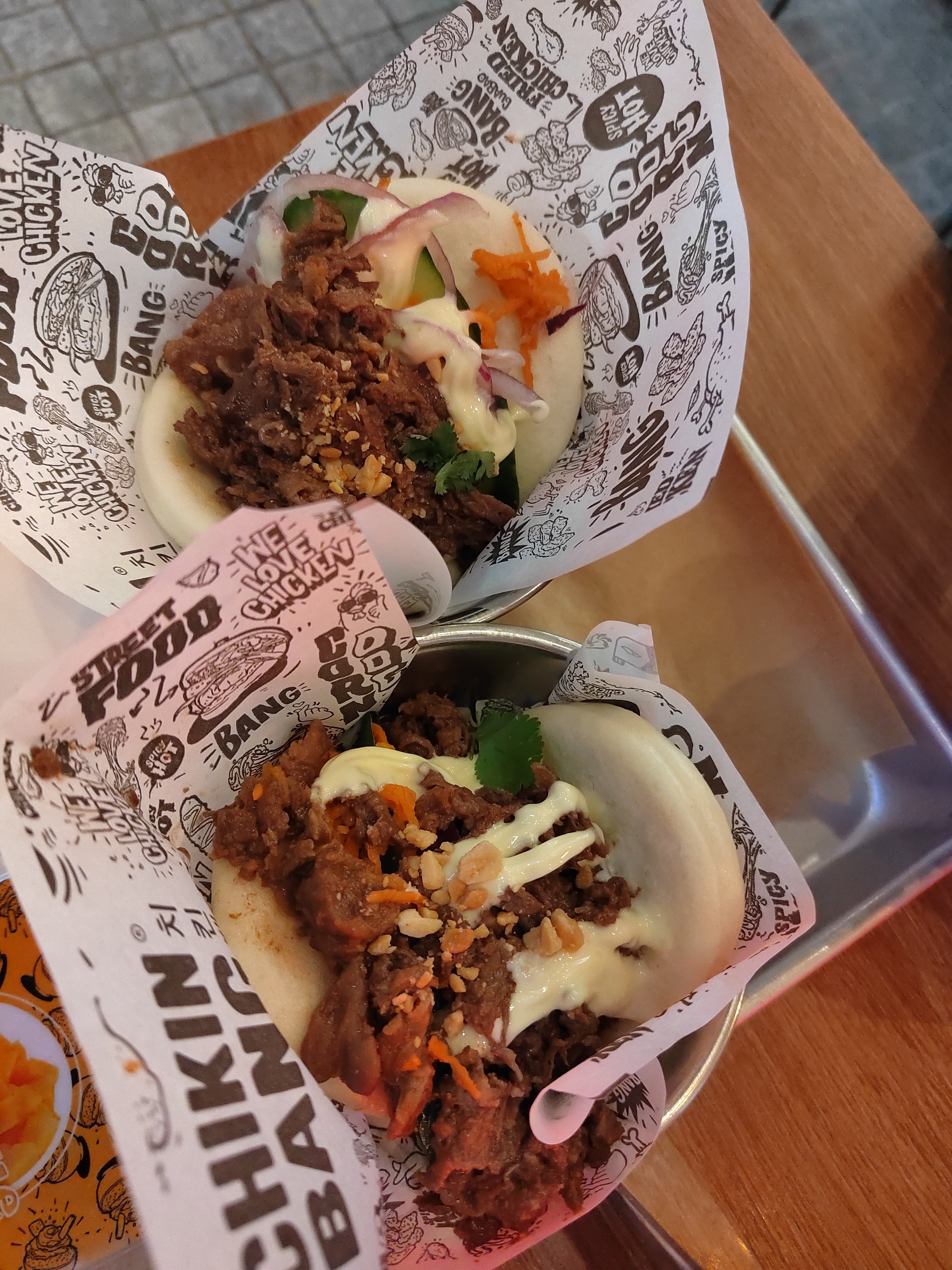 Super expérience en général, l'ambiance et la déco sont top 👍 cependant les bao aux poulets ne sont pas du tout pratique à manger, les poulets dedans sont trop gros, et rien qu'en les prenant presque tous les légumes sont tombés. Mais sinon pas de problème au niveau du goût, c'est très bon