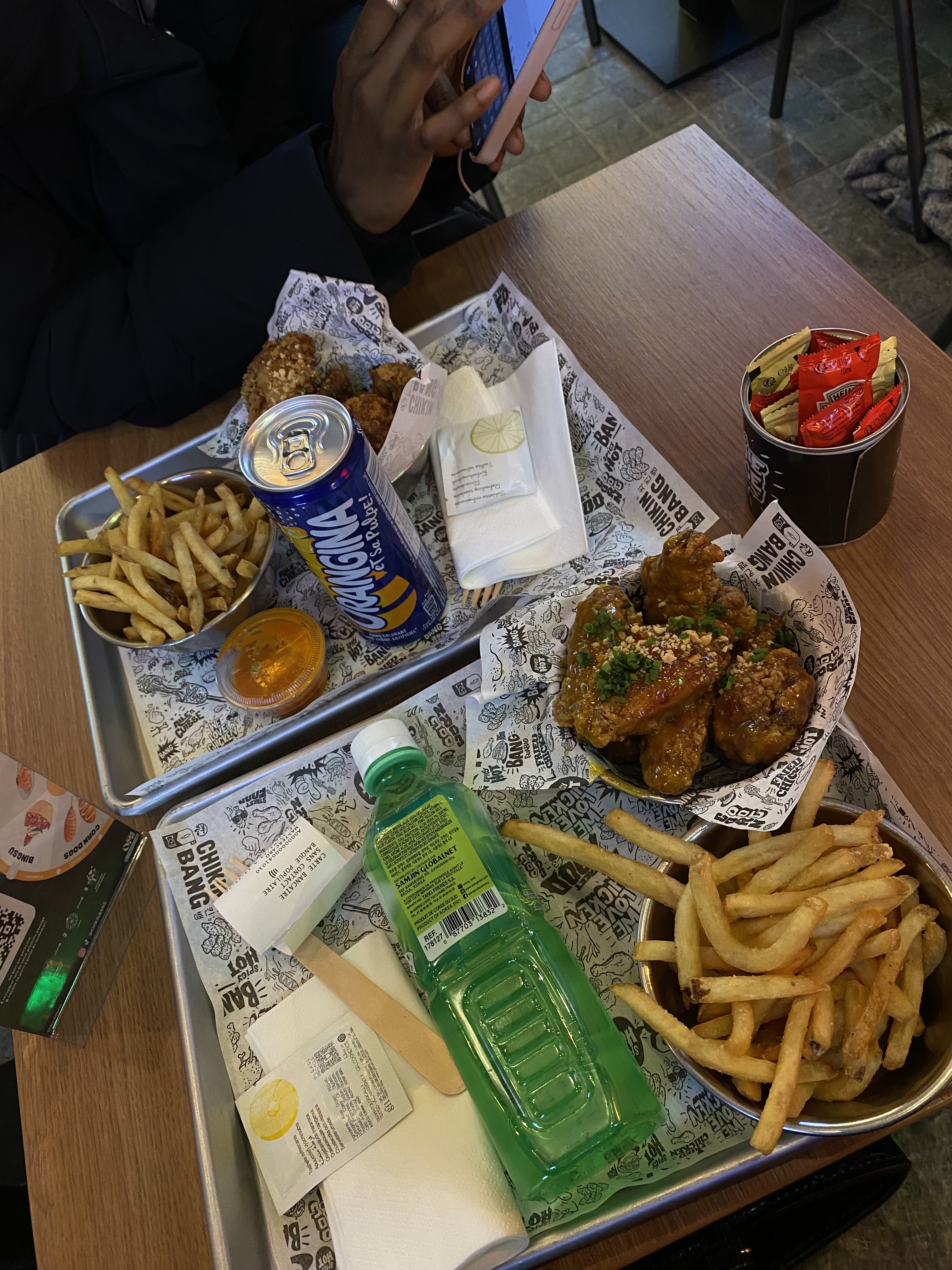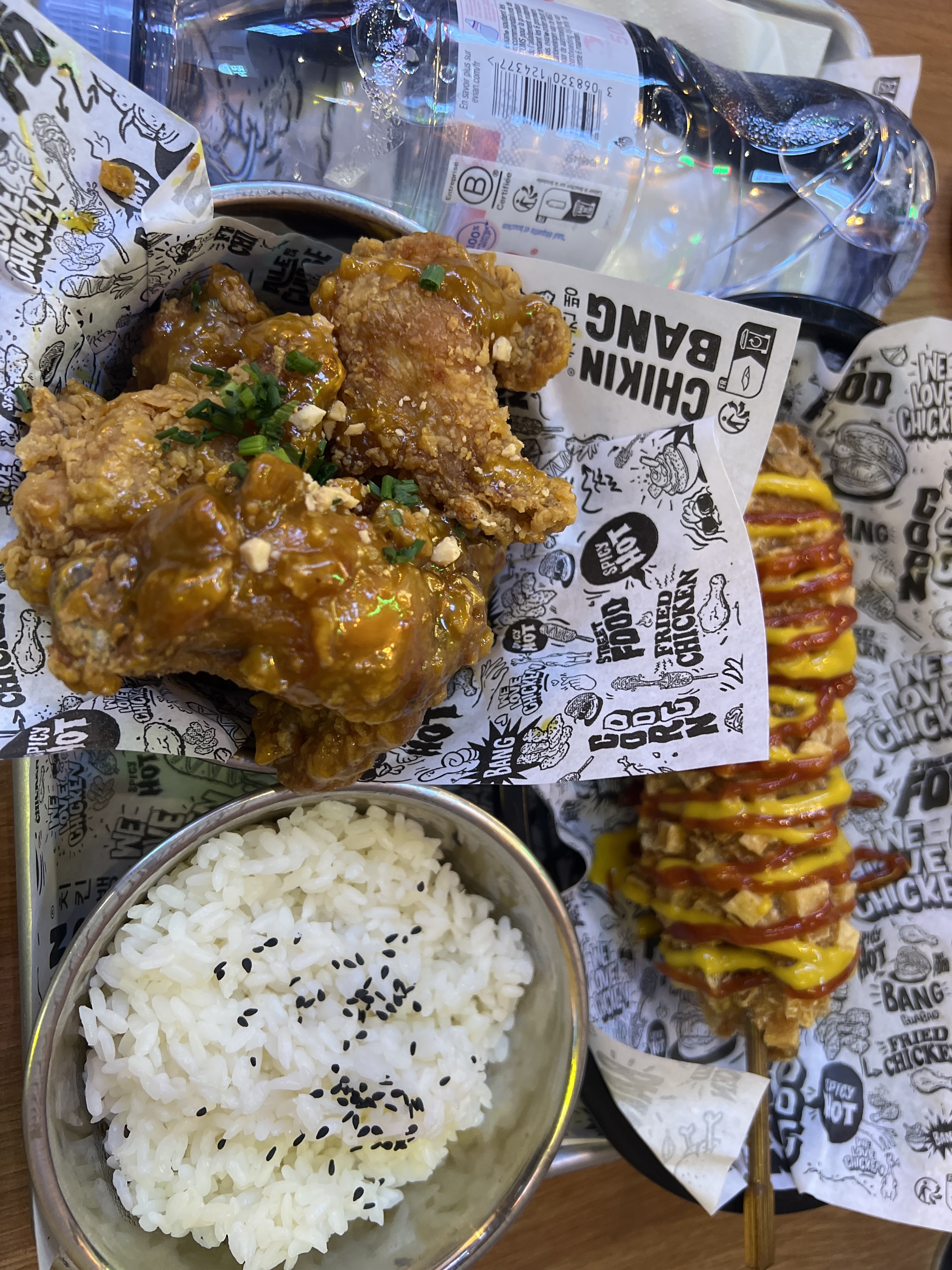 Chikin Bang, comme l’enseigne en face et à gauche, offre une expérience axée sur le poulet, et j'ai apprécié la variété des saveurs, en particulier la version épicée et ail/soja du poulet. Le supplément de 1,50 € pour apprécier le poulet sans s'en mettre partout en vaut la peine. 😅 Les bowls sont généreusement garnis, que vous optiez pour une base de riz ou de salade. Les corn dogs et les tteokbokki sont satisfaisants, (la version mac and cheese ne soit pas disponible à La Défense). Les guabaos n'ont pas été à la hauteur de mes attentes. Le service est très efficace et en plus, sympathique.