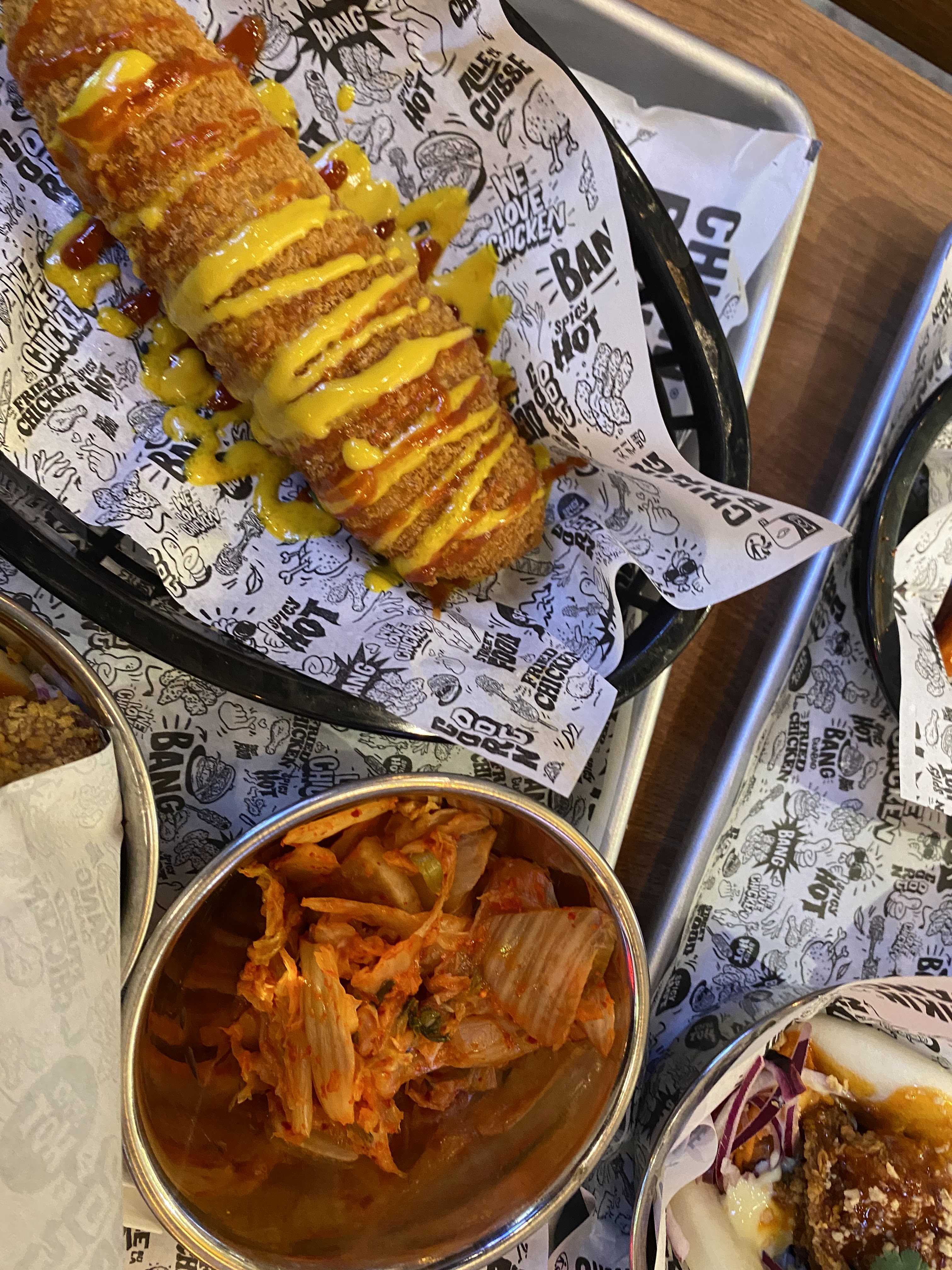 La déco est sympa et miam on s'est régalé ! Corn dog, chicken avec différentes sauces, la panure est bien croustillante et pas trop épaisse ni fine. Les pickles de radis blancs sont top pour accompagner. On y retournera pour tester les autres sauces notamment !