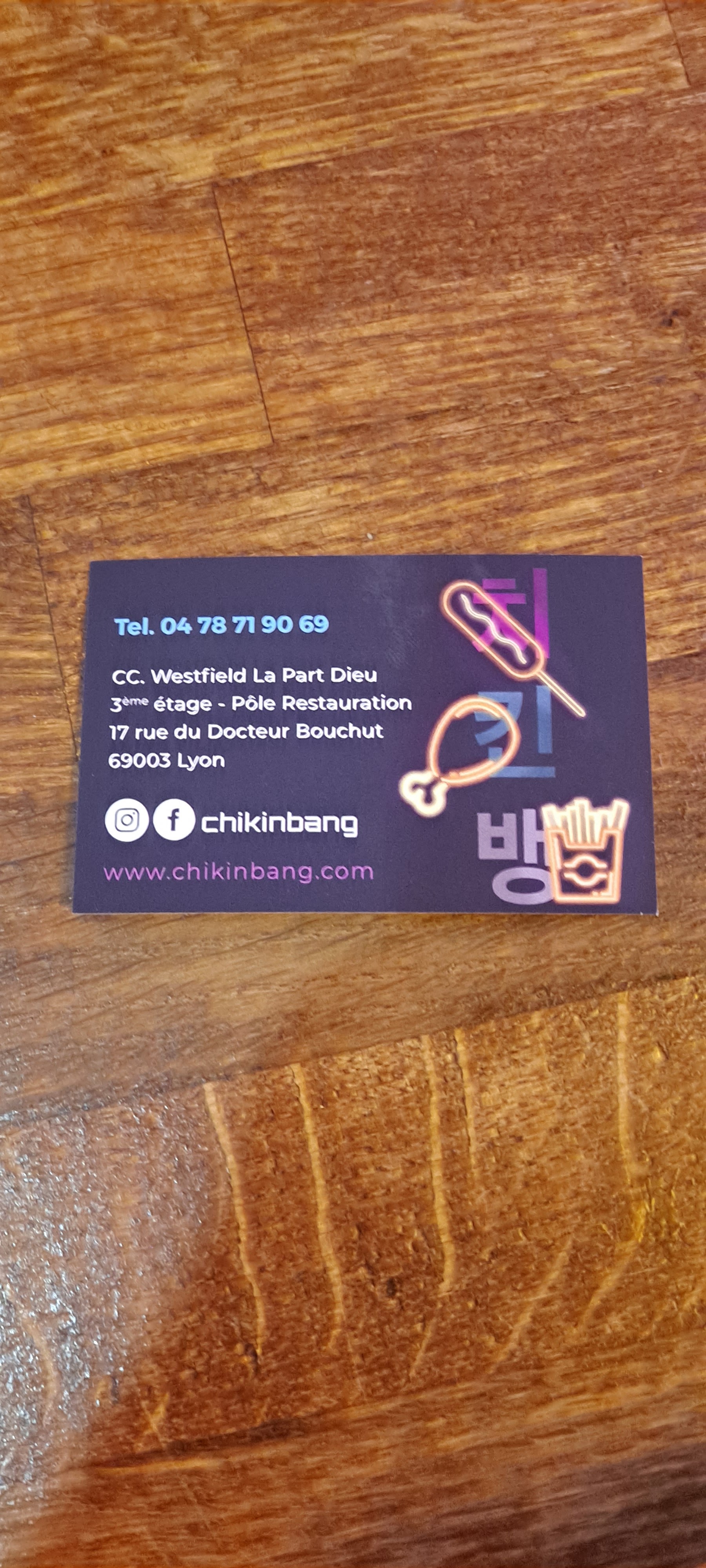 Que dire de Chikin bang seulement que c'est excellent !! J'ai tellement attendue ce concept là à Lyon,j'en ressors que satisfaite ✨ Ce qui m'a subjugué avant tout c'est la déco, on se croirait vraiment en pleine rue à Séoul.Avec de la K-pop c'est encore mieux 🎶. Concernant la cuisine, j'ai goûté de tout.Je vous conseille le chicken avec sa sauce gochujang, un délice ! J'ai apprécié le corn dog, les tteokbokki... Bref il y a du choix et de la qualité :) Ceux qui n'apprécient pas sont ceux qui ne comprennent pas le principe. Un 5/5 bien mérité Michel ⭐⭐⭐⭐⭐