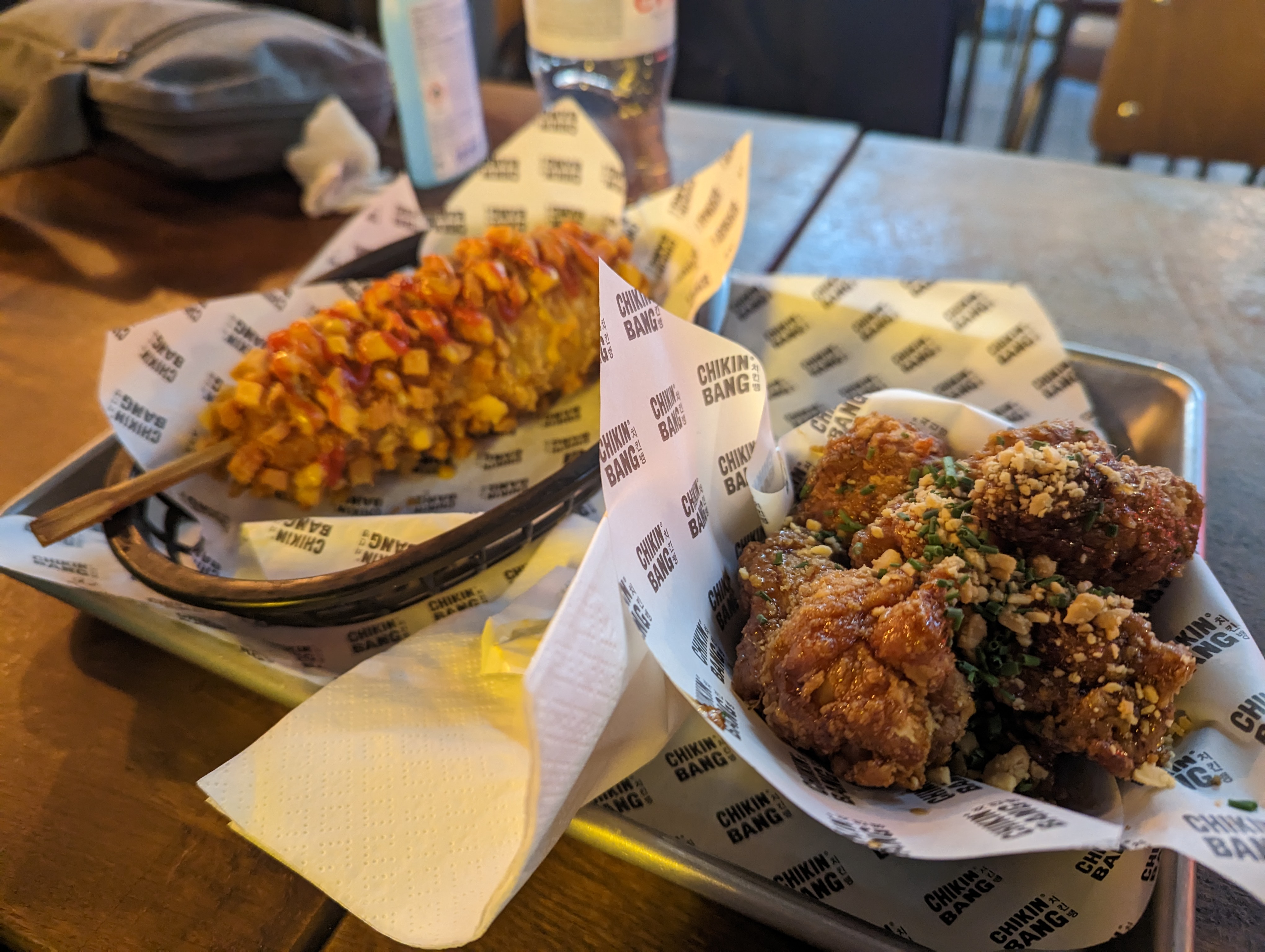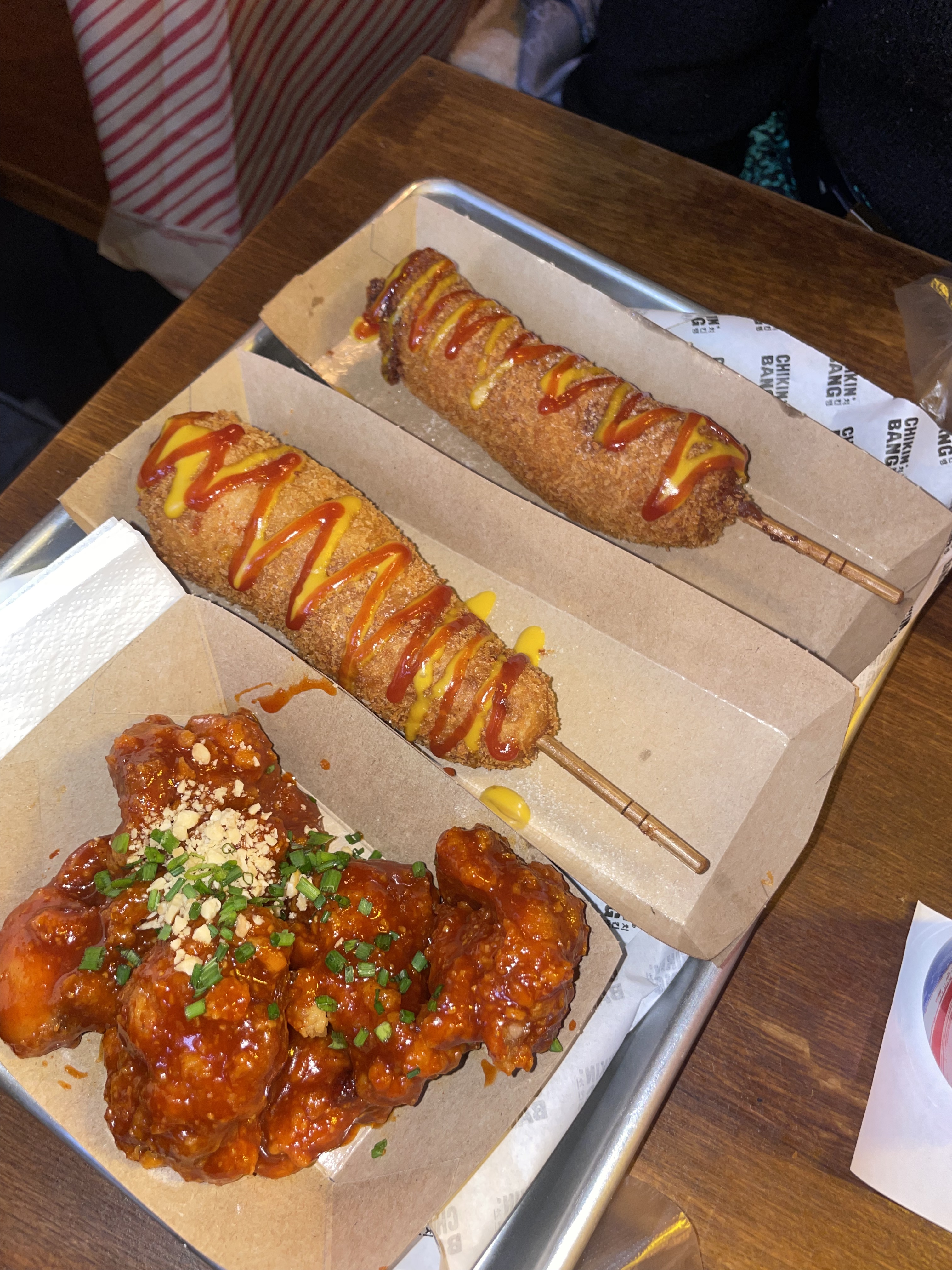 Le Corn-Dog est vraiment incroyable ! Ce qui est craquant c'est aussi les poulets frits ! Niveau ambiance aussi on s'y croit : décor et Kpop en fond. Personnel super sympa aussi. Je reviendrai goûter à chaque plat de la carte