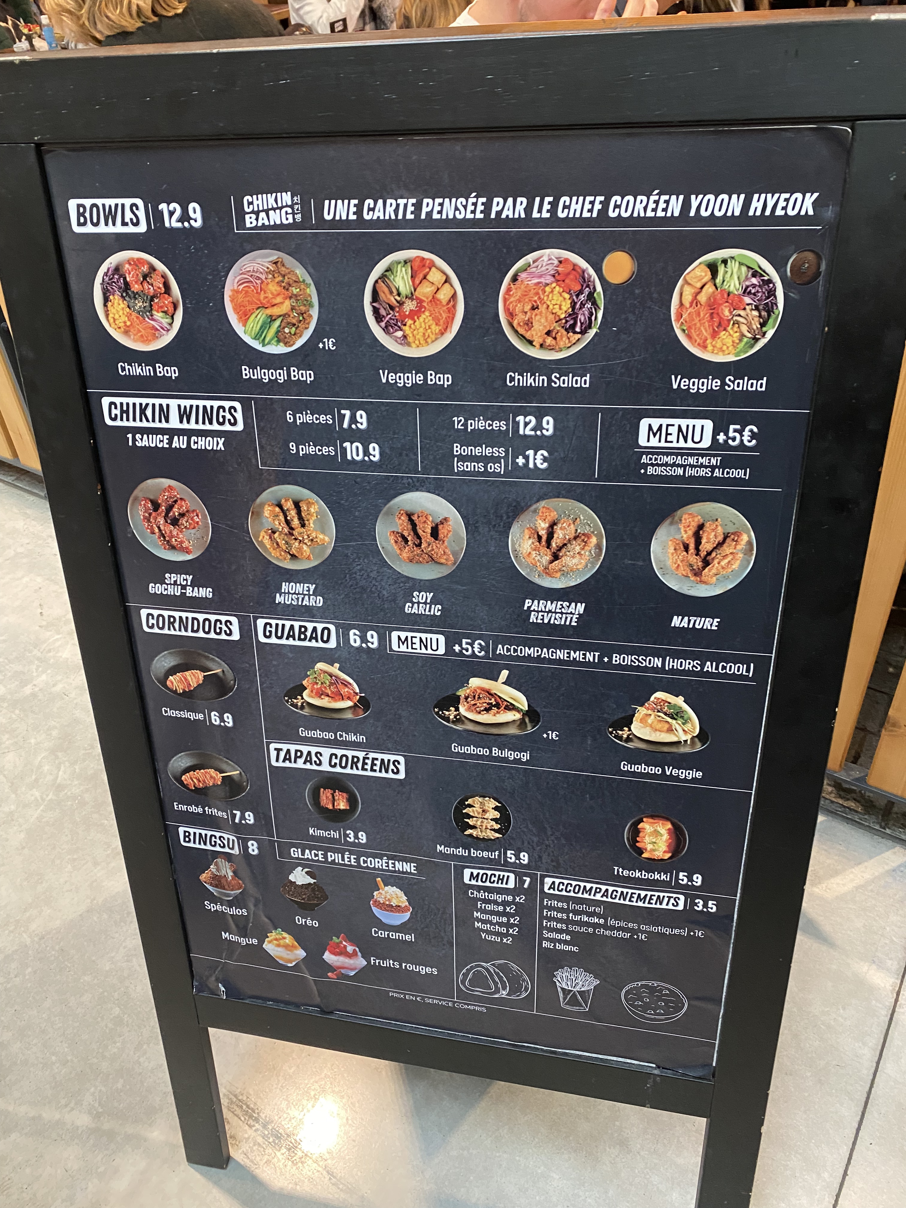 Je me suis rendue à Chikin Bang afin de tester la « street food » coréenne. Malgré les plusieurs avis positifs je n’ai pas trouvé ça vraiment goûteux.. plutôt même gras et sans saveurs. J étais un peu déçu du kimchi et radis marinée. Je pourrai y revenir si on me le propose mais pas de mon plein grès je pense. La décoration est superbe !