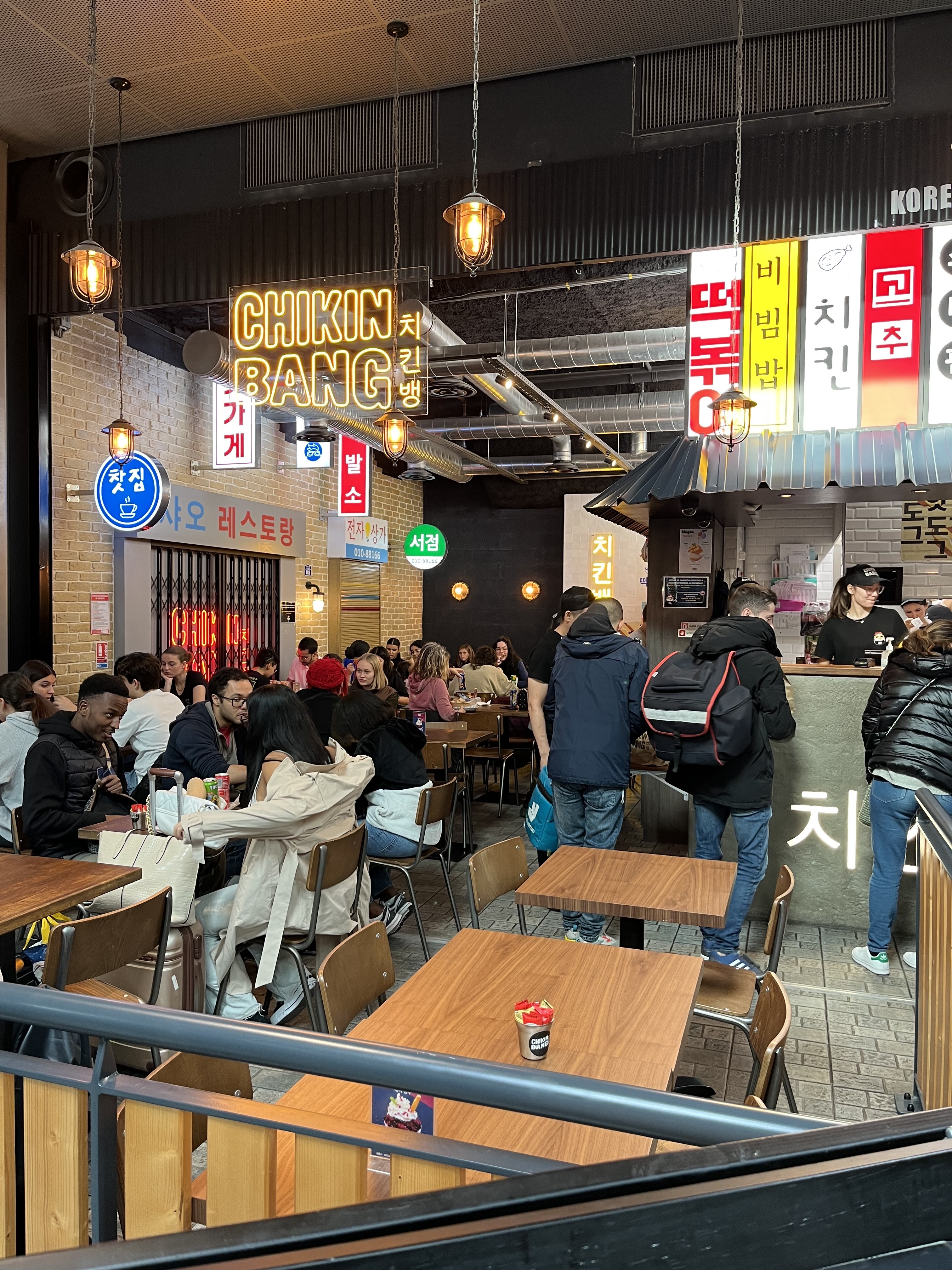 On y retrouve les odeurs et les goûts de la street food coréenne. Victime de sa popularité, vous vous devez d'arriver dans les premiers pour être assis confortablement. Un passage plutôt restreint entre l'entrée, la sortie et pour jeter vos ordures / plateau. Un peu cher mais le prix comprend la location de l'emplacement du site. A tester !