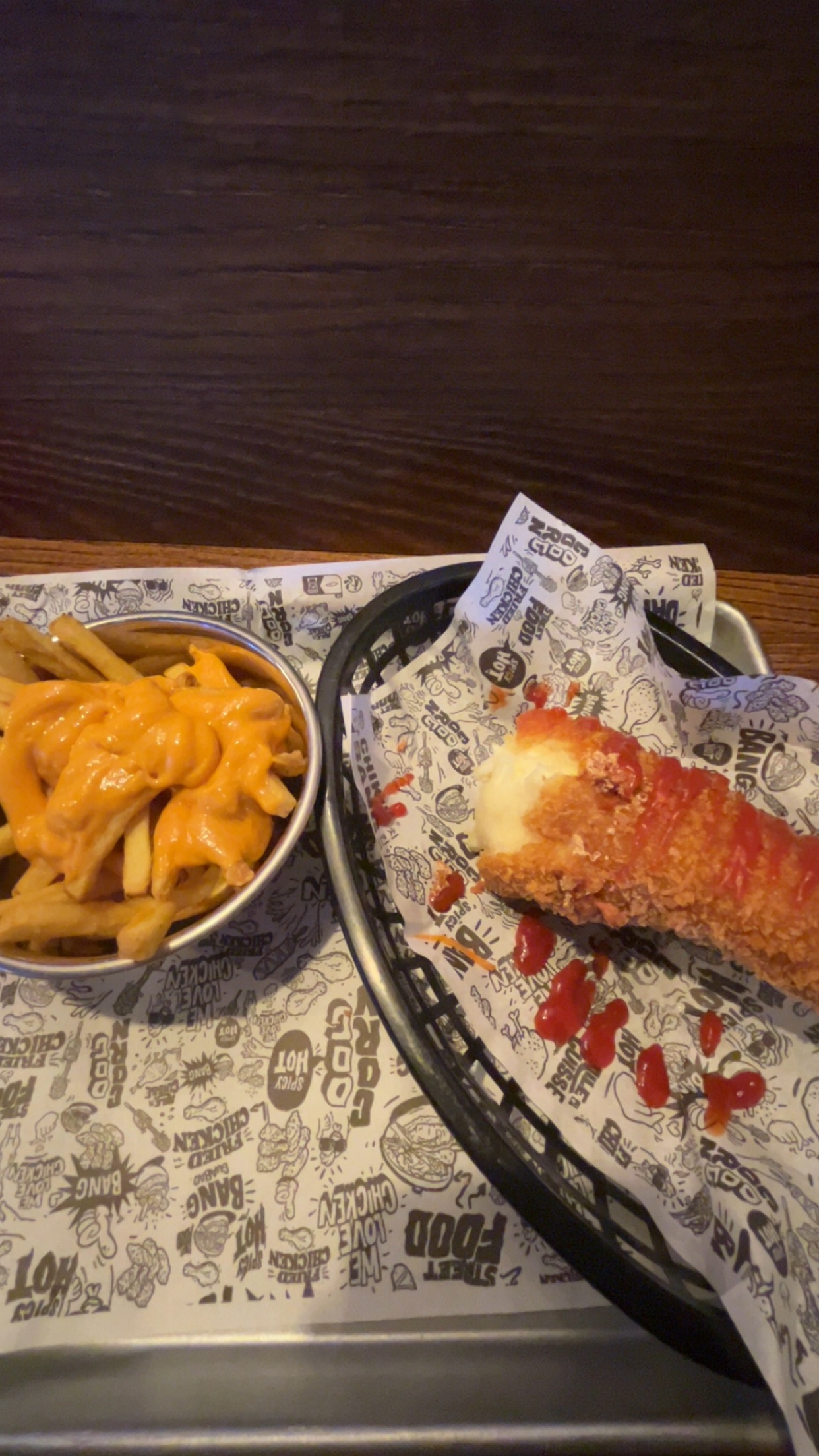 Bonne portion,les morceaux de poulets sont énormes. La déco est sympa,on se croirait presque dans les quartiers coréens. J'aime l'ambiance et le fait que ce ne soit pas trop illuminé. Petit bémol le prix 😅 cela reste quand même assez cher mais bon ça fait plaisir d'avoir un resto street food coréenne ici 😊