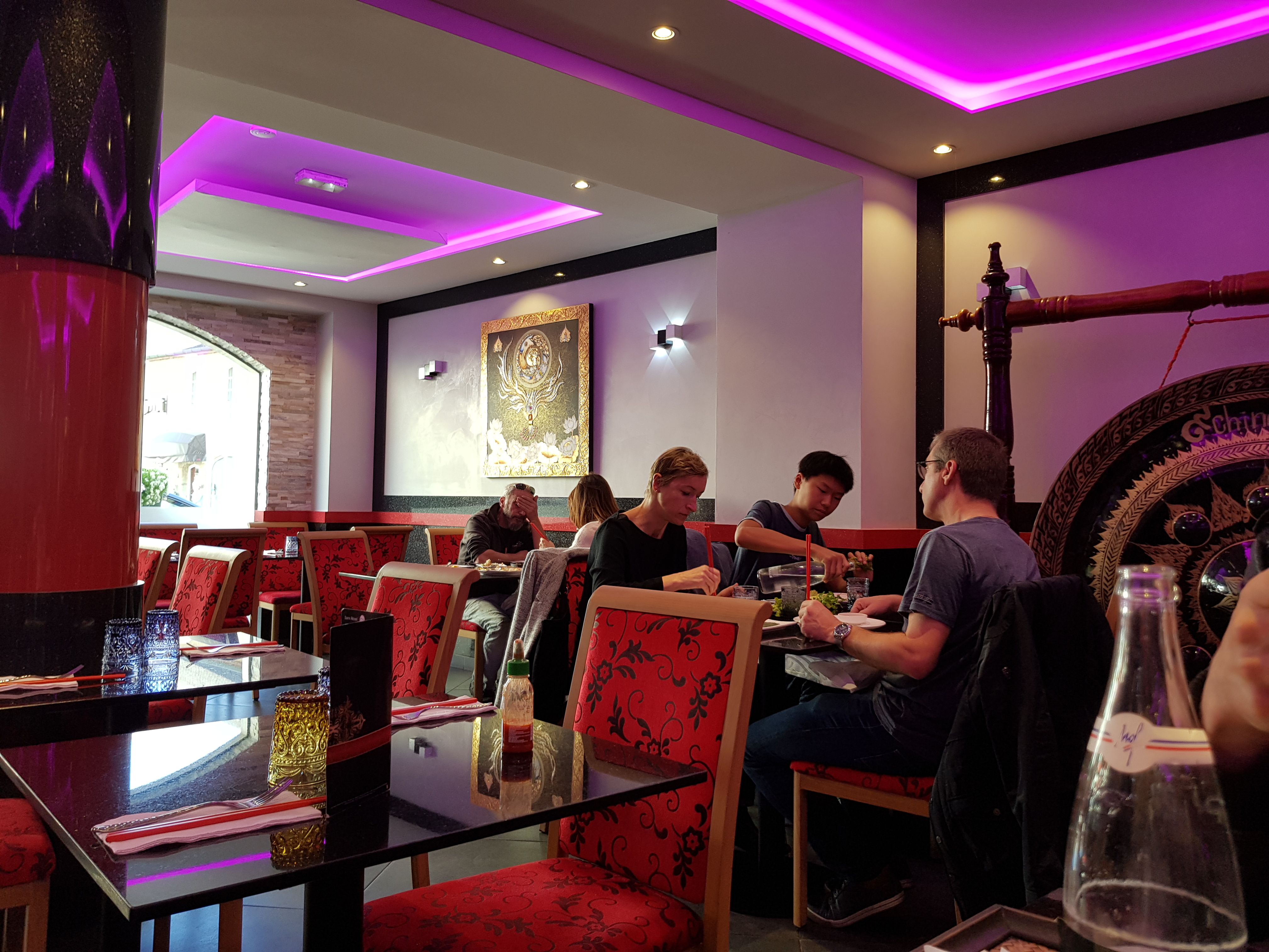 Mise a jour 2022: Je suis fatigue de ces restaurants qui font de la cuisine soit disant asiatique, mais aussi d'une clientele qui ne fait aucun effort pour s'eduquer et trouve tout merveilleux et fait du fast food une cuisine rafinee et authentique. Le decor a change, plutot brut, decoration directe de JJ Market, bruyant. La prise de commande fut high speed. C'est tout juste si on a eu le temps de commander les plats qui nous interessaient sur un menu concu graphiquement par un enfant de 10 ans (impression jaune sur fond blanc peu lisible, inkjet). La serveuse ne parle pas Thai, pas un probleme du tout, mais une solution pour ne pas demander en cuisine si un plat dont je ne connais le nom qu'en Thai pourrait etre fait. L'attente fut par contre un peu longue. Le pad thai, au ketchup, le curry vert (fluo) et les crevettes Hong Khong style tres, mais tres, caramelisees. Pas de quoi tomber en pamoison. C'est du fast food. Bref, nous sommes bien a Ferney, pas en Thailande, ou en Asie (ou j'ai vecu et beaucoup voyage) ... Il y a mieux ailleurs (meme si ce sont les memes proprietaires!) Revue 2019: China Thai is located at the heart of Ferney where it aims to offer an exotic culinary experience at the cross road of French and Switzerland. The decor hesitates between Thai and Chinese with the latter wining over the former. Welcome is warm even when the place is busy (and it is especially at the weekend) and service is fine, although a bit chaotic. The menu is somewhat comprehensive, offering a range of dishes mostly Thai, but beware if you are vegetarian, you will be rather restricted in your choice. The food definitively tries to express Thai flavours (the Chef is Thai) but very much tone down, probably due to the sensitive palate of many of the locals who could not cope with the level of spiciness that characterises Thai food. The Tom Yam is good (Soupe a la citronelle) but the Yam Woonsen (Vermicelli Salad) will leave you blandly disappointed. The red curry is average and so are a few other dishes who all fall for missing one of the four essential flavours at the heart of Thai food (sweet, spicy, salty, sour). Overall it is probably a great introduction to Thai food if you have never been to Thailand, but if you have and it you like spicy food, vous resterez sur votre faim. I will still go occasionally and ask for the food to be prepared like a local, a Thai local that is.