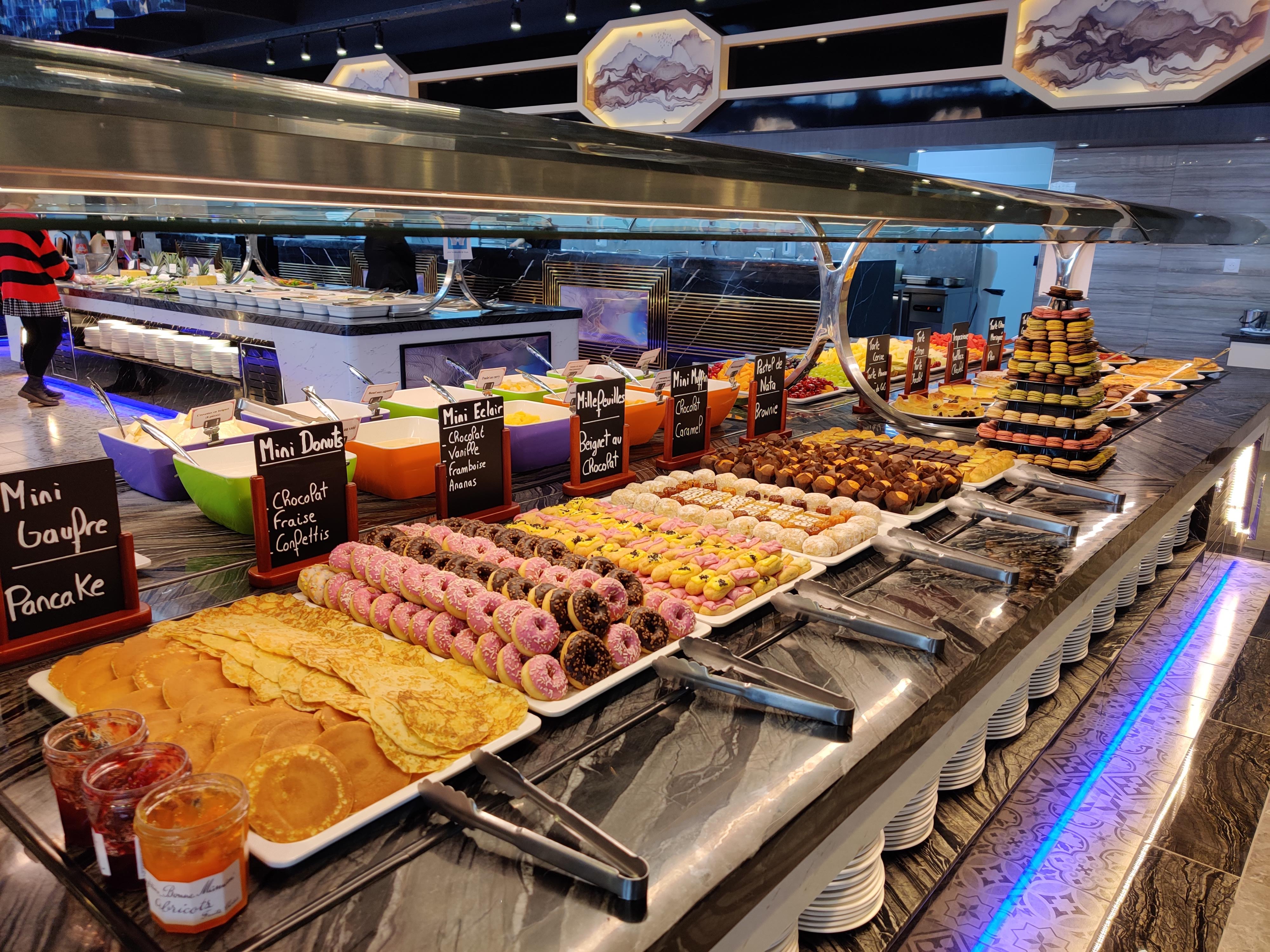 Buffet grand avec un large choix, espace énorme pouvant accueillir beaucoup de monde. La nourriture est assez bonne et fraîche. Seul bémol dans le restaurant, toilettes à revoir en urgence, pas normal d'avoir que deux WC côté homme, et en plus un était bouché. Pas de urinoir disponible . Grande fille d'attente côté hommes.