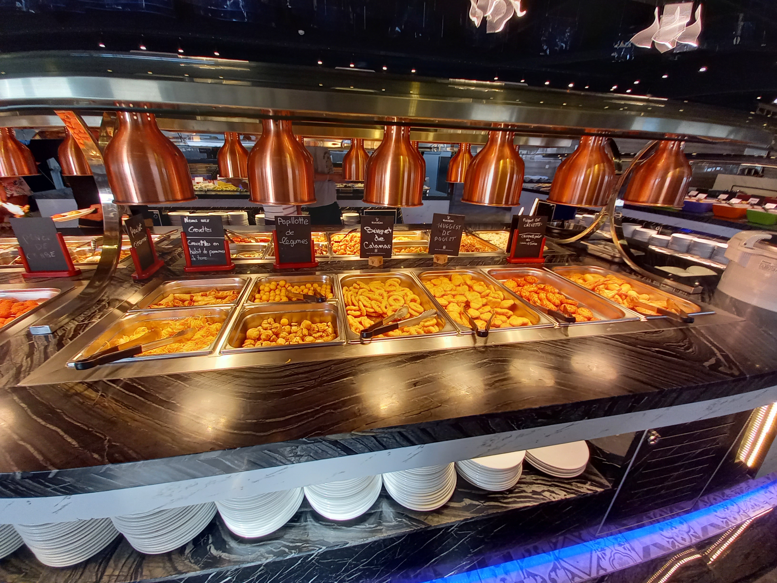 Beaucoup de choix... surtout à l'ouverture car après les choix sont restreints car les bacs sont peu garnis ou vides. Lieu pas très convivial car comme l'espace est immense donc beaucoup (trop) de monde (normal). Toutefois, les plats sont bons. Certains trop salés comme le saumon entier. Et en fin de soirée les bacs à glaces sont quasiment vides et vraiment crados. Dommage. Comme je l'ai dit faut venir dès l'ouverture.