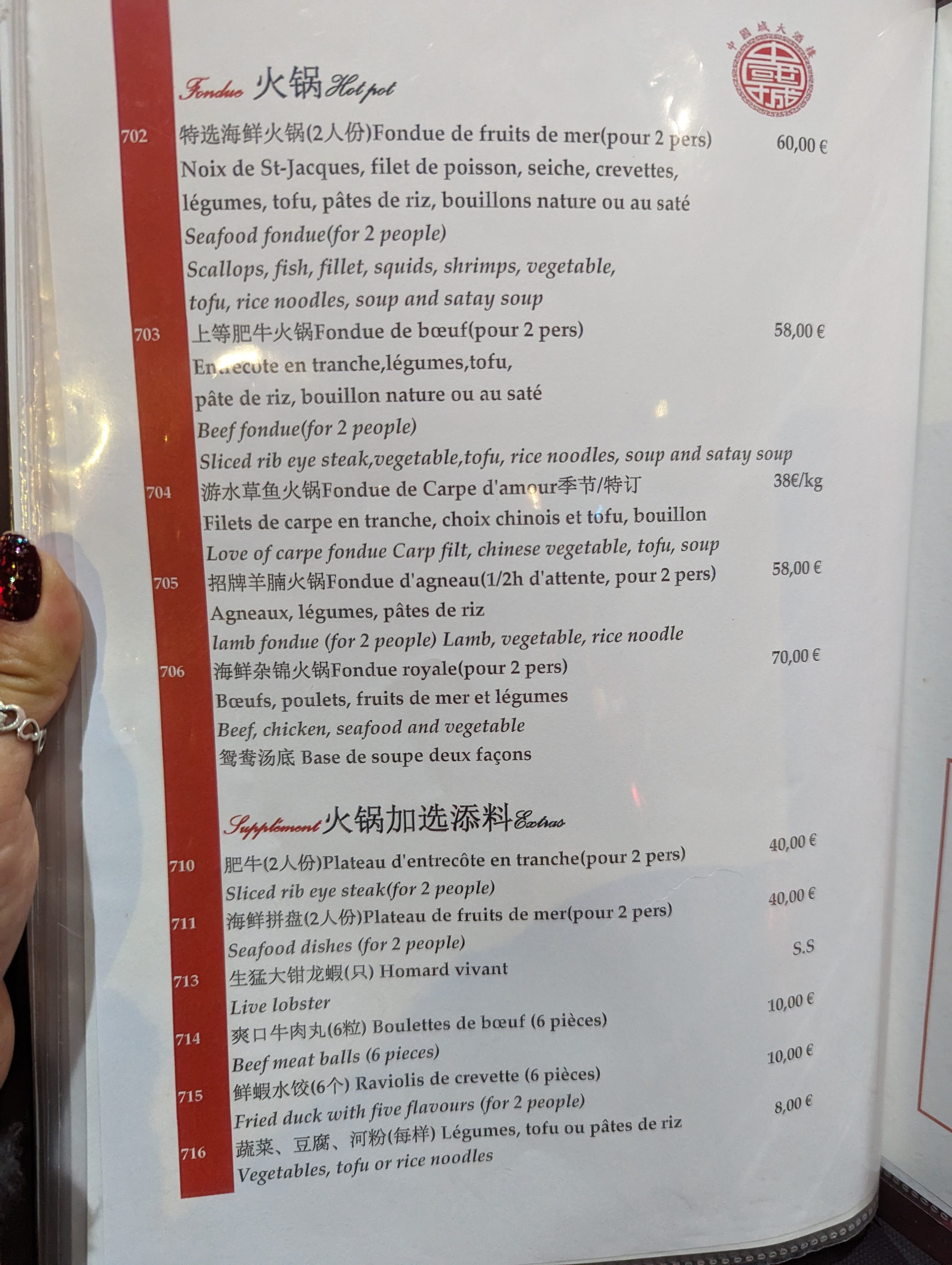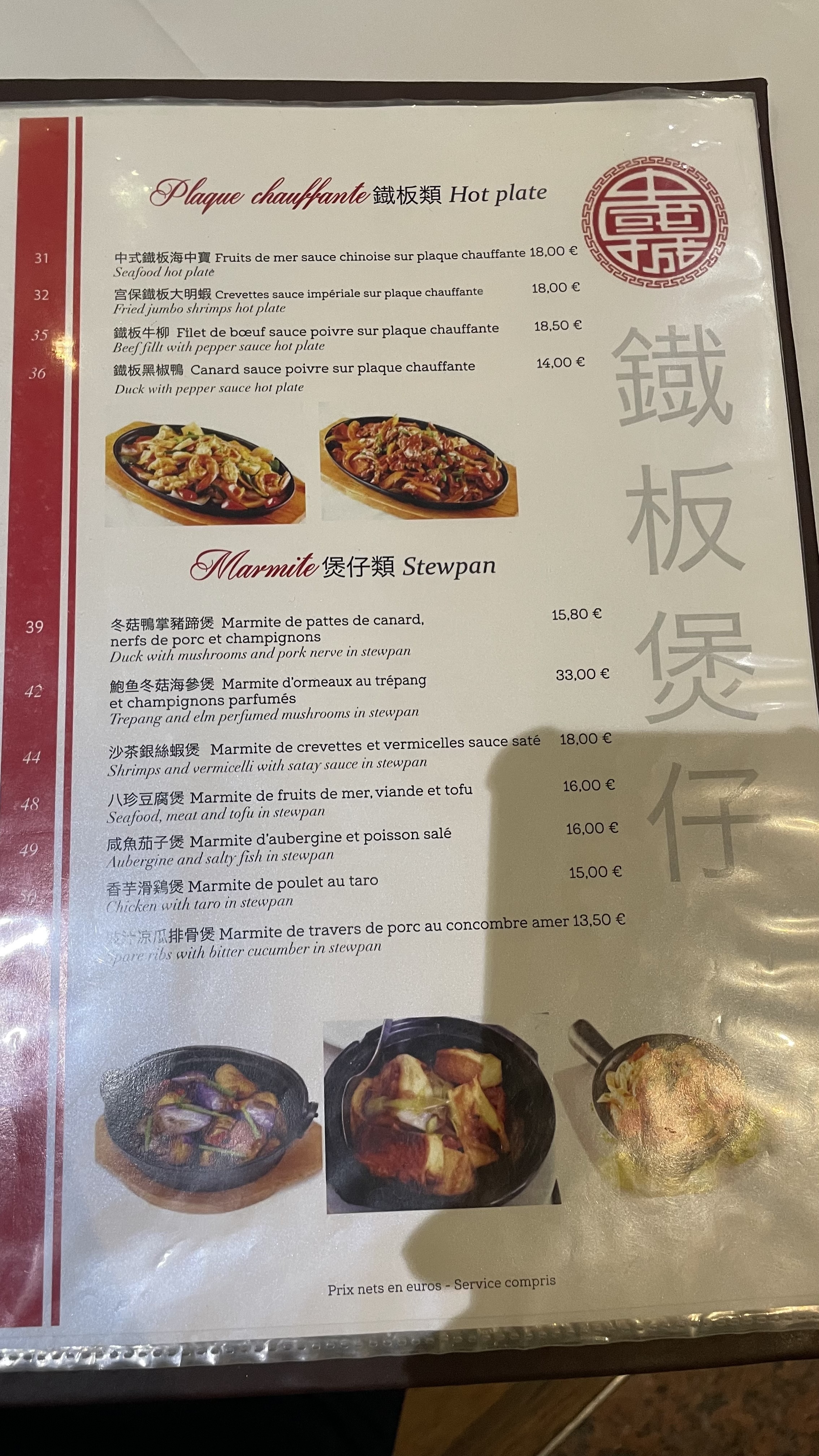 Français : Une expérience intéressante, le staff n'est pas spécialement sympa ou plaisant, mais il est rapide et efficace. Le restaurant joue de sa notoriété dans le quartier, étant le seul restaurant chinois un peu sophistiqué du quartier. La nourriture est plutôt bonne, sans être exceptionnelle non plus. Ce qui me laisse un peu dubitative est le prix. Les plats sont beaucoup trop chers pour la quantité qui est servie. 6 crevettes valent environ 15 euros. De plus attention a l'addition a la fin, elle a tendance à augmenter mystérieusement. A surveiller de très près. Recommandations : hookok, chang fen, boeuf sur plaque chauffante, soupe aux oeufs sales, canard au taro, riz sauté au poisson salé et poulet. English : An interesting experience, the staff isn't particularly kind, but they are fast and efficient. The restaurant is definitely aware of and abuse their popularity among the neighbourhood, because it's the only Chinese restaurant around that is a bit sophisticated. The food is good, without being incredible. The thing I do regret is their prices. The food is way too expensive, especially for the quantity they will give you. 6 shrimps are around 15 euros. Be careful to go through the bill at the end, there has been some instances where it has unexpectedly risen. Recommandations : hookok, chang fen, hot iron plate sauteed beef, salted eggs soup, taro fried duck meat, fried rice with chicken and salted fish.
