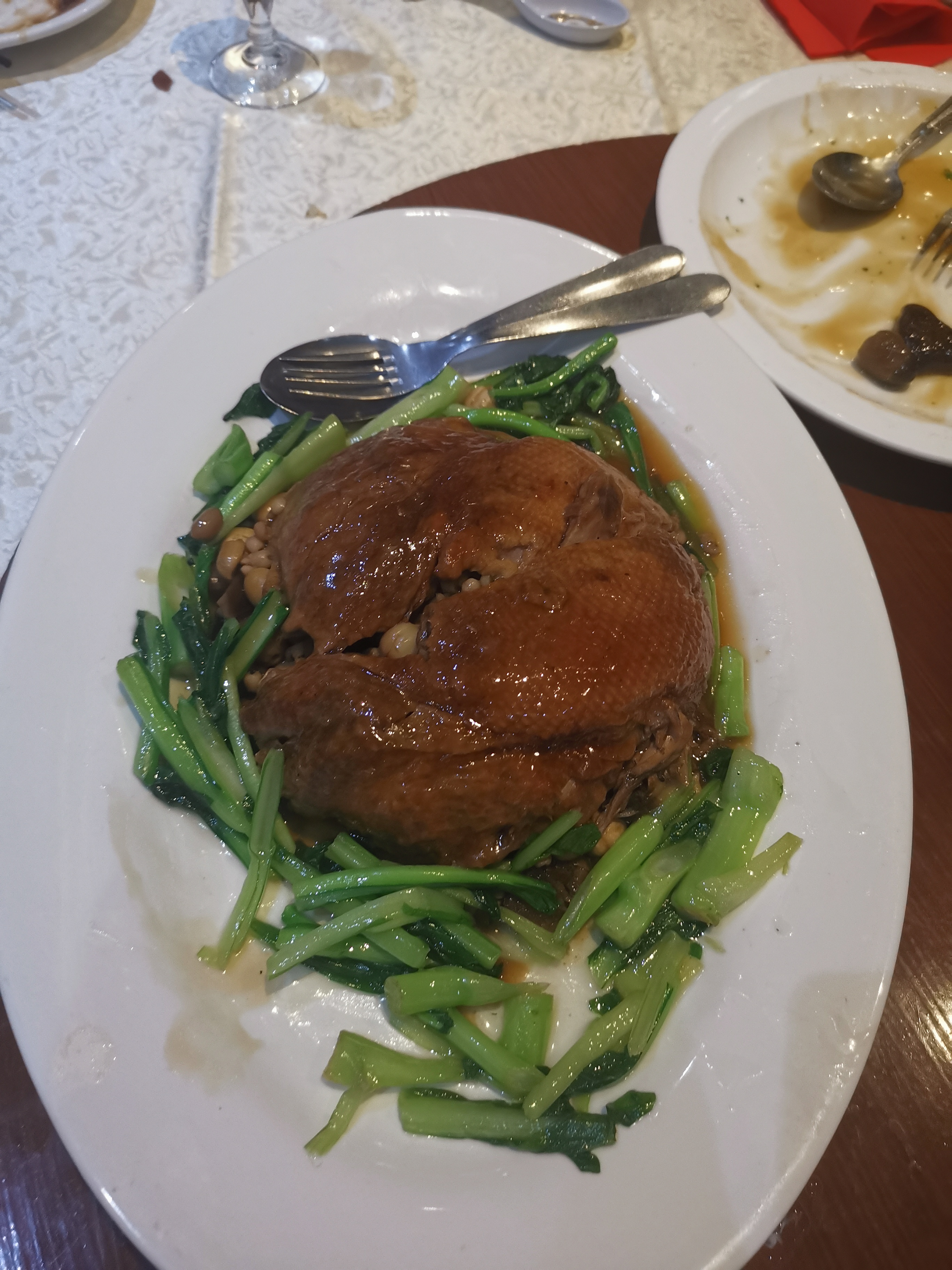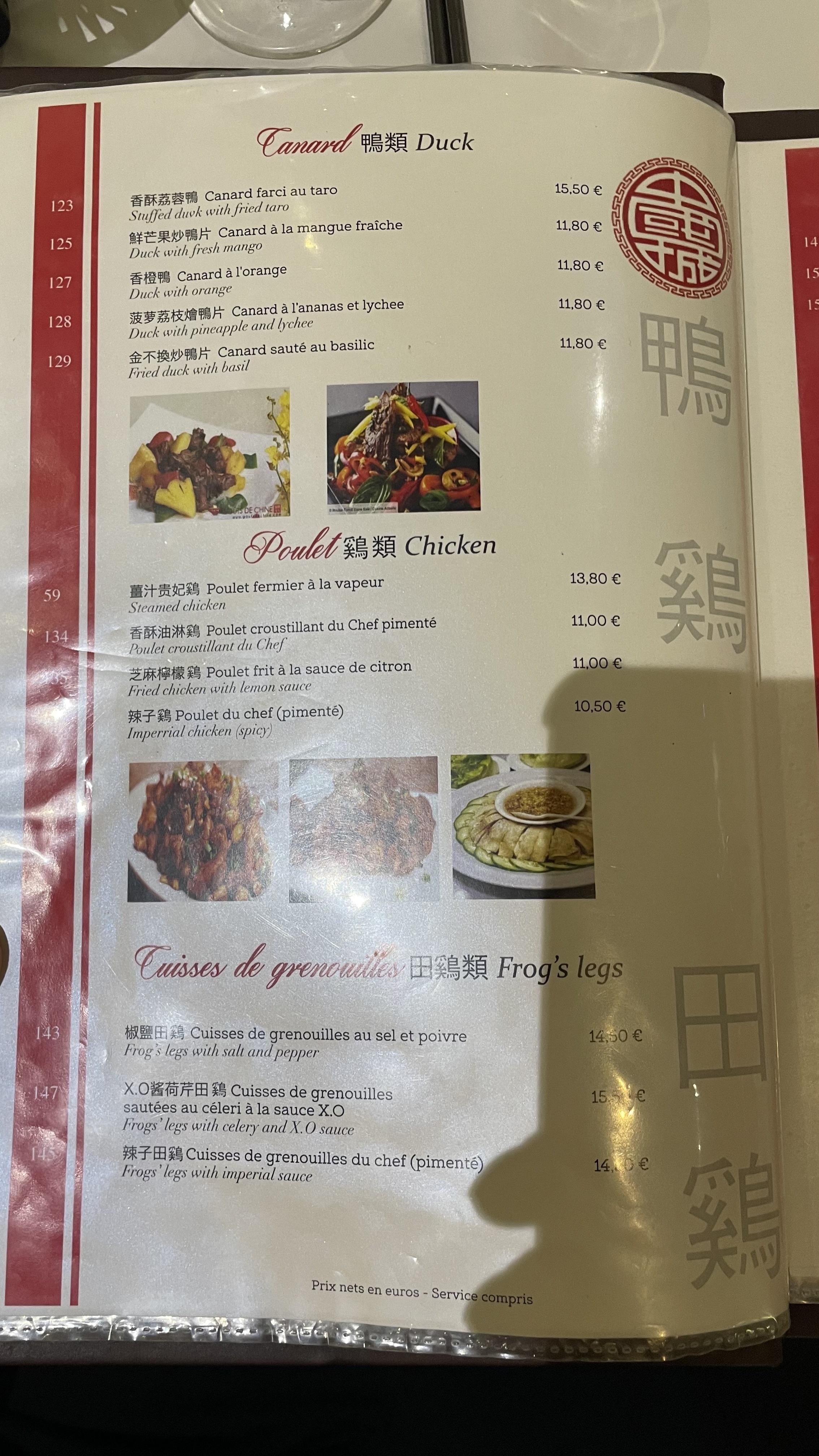 top. authentique, délicieux, service impeccable. le temple de gastronomie chinoise dans ce quartier chinois. alors - must see! on a eu le demi canard en 3 services pour deux, mais en fait il fallait prendre le canard entier. c'est très bon, parfaitement servi. le rose au pichet est bon, aussi. je recommande.