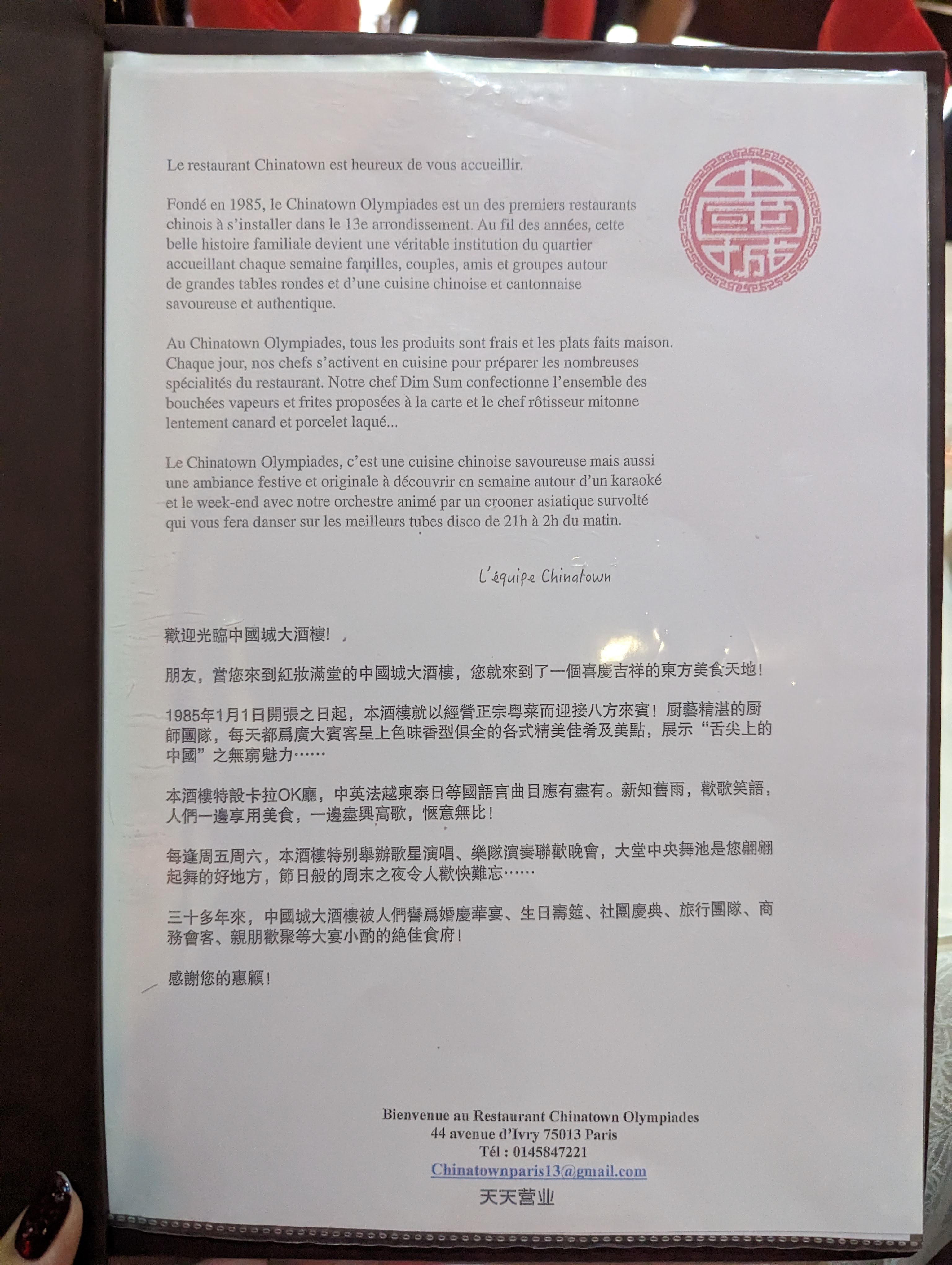 Un restaurant situé juste au dessus du magasin alimentation de Paris Store Avenue d'Ivry, proposant des spécialités chinoises et des soirées karaoké Mention spéciale au menu à 76 €, typiquement chinois, avec ses différents mets à partager entre convives 👍👍👍👍👍; à déguster de préférence sans être pressé 😉🙂