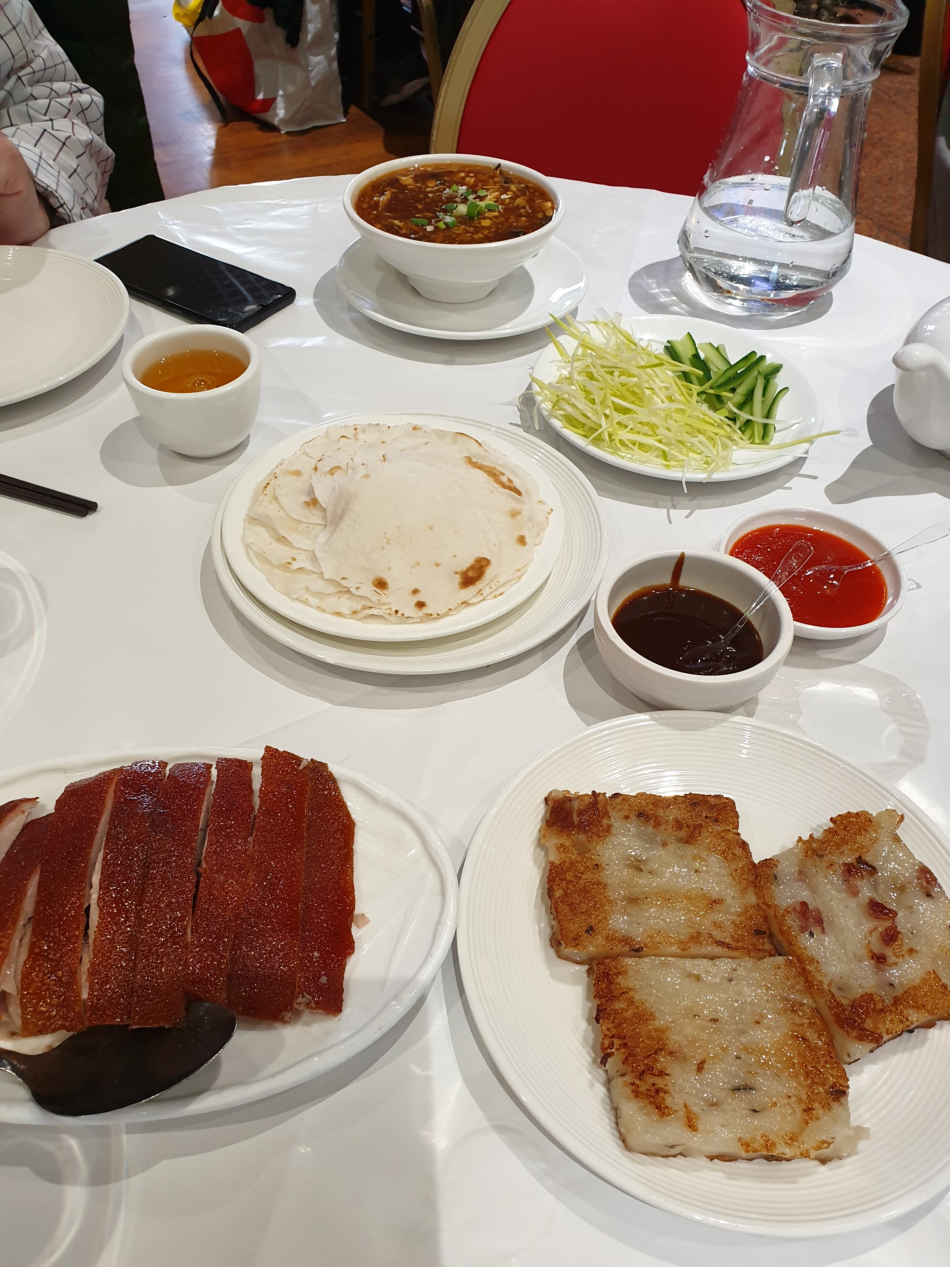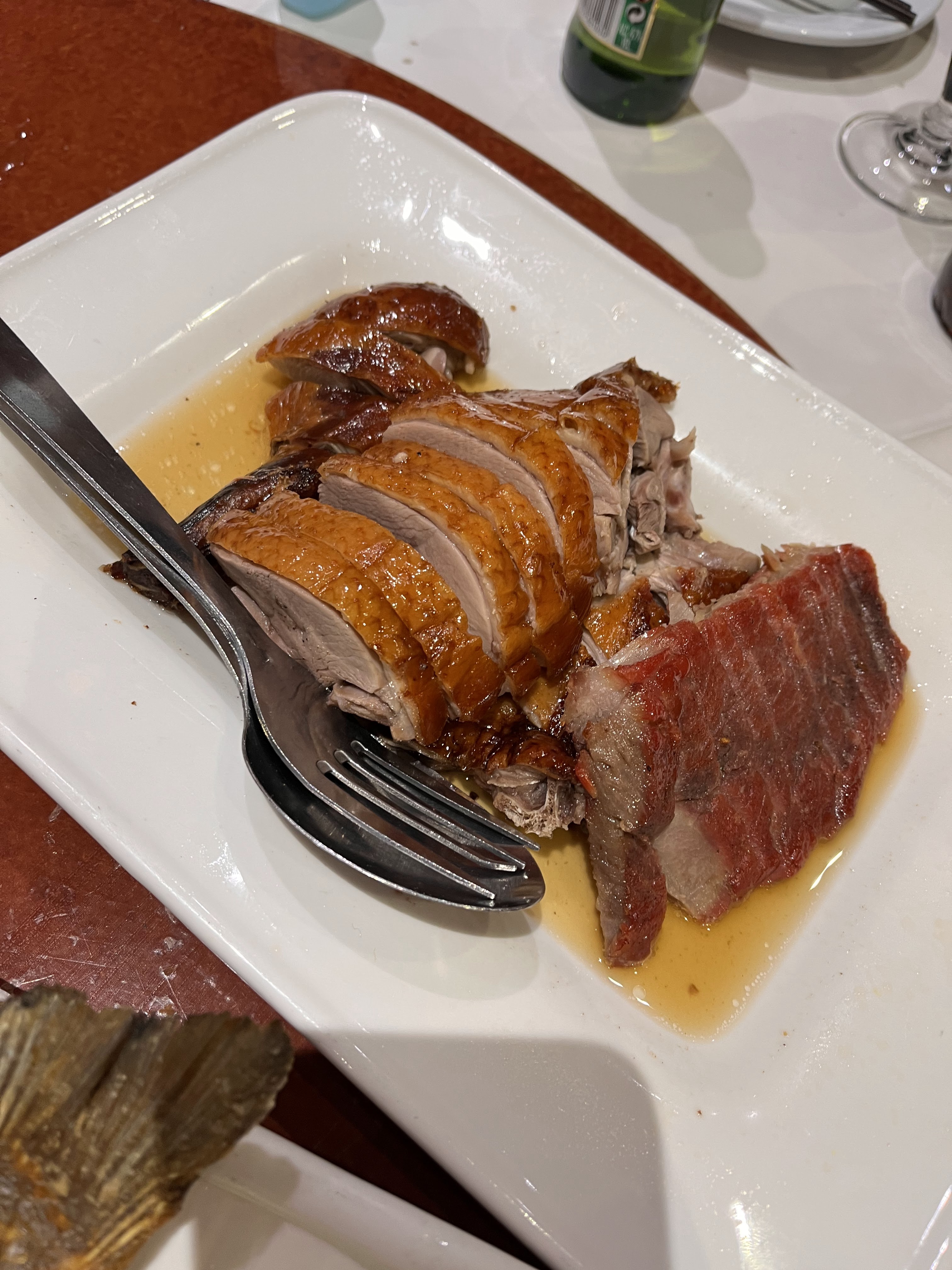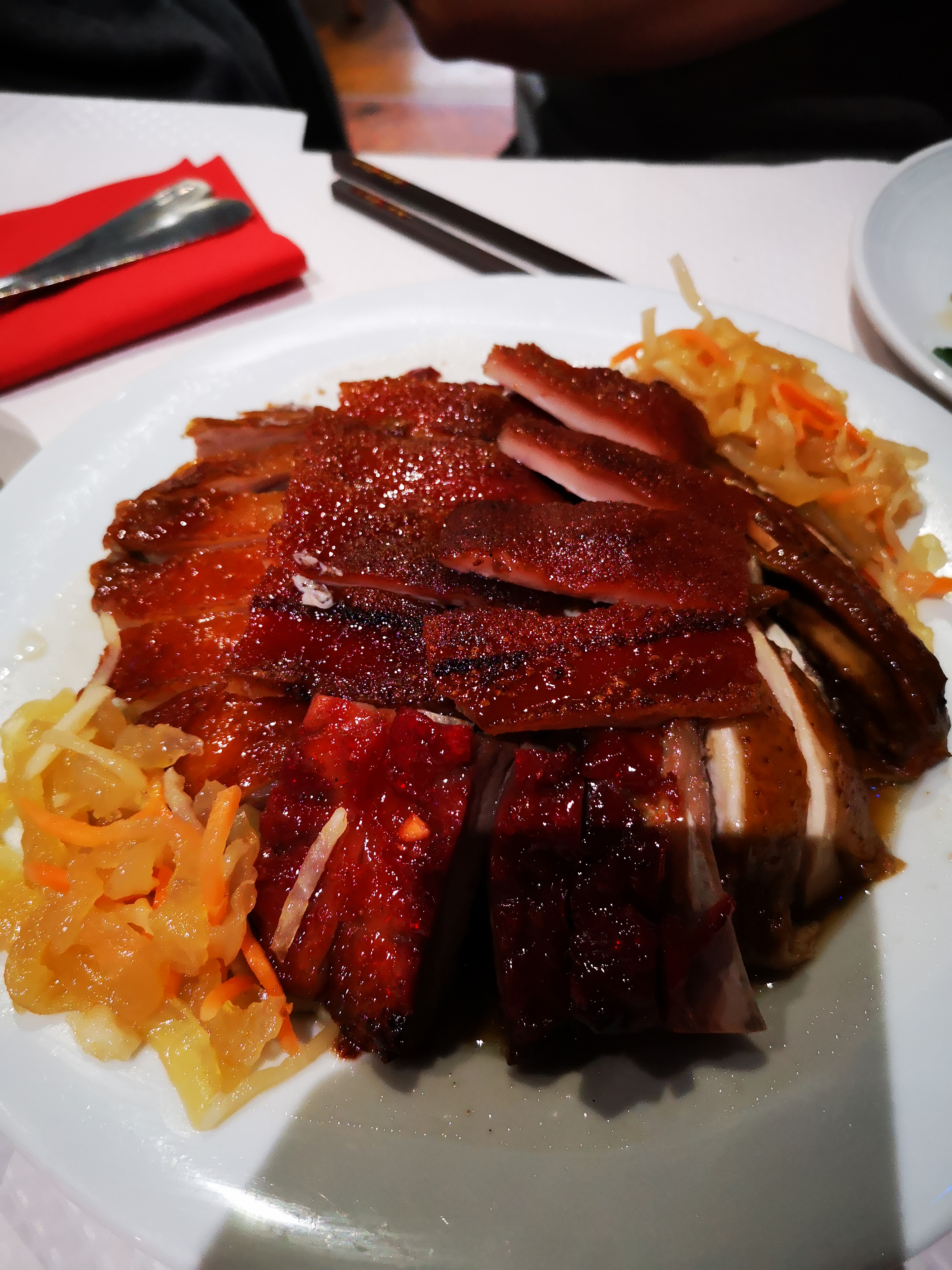 Nous avions commandé 4 entrées, 1 plat de légumes et 1 canard pékinois. Le serveur qui faisait la découpe de la peau du canard se sentait vraiment obligé. Les morceaux de peau de canard étaient de tailles énormes par rapport aux crêpes. Surtout, je tenais à laisser ce commentaire car, ce restaurant vole ses clients. Les cuisses et les ailes de canard n'étaient pas servies. Elles avaient tout simplement disparu. Car le peu de viande dans le potage (2ème service) et le riz sauté (3ème service) prouve que ce restaurant n'est pas très honnête !