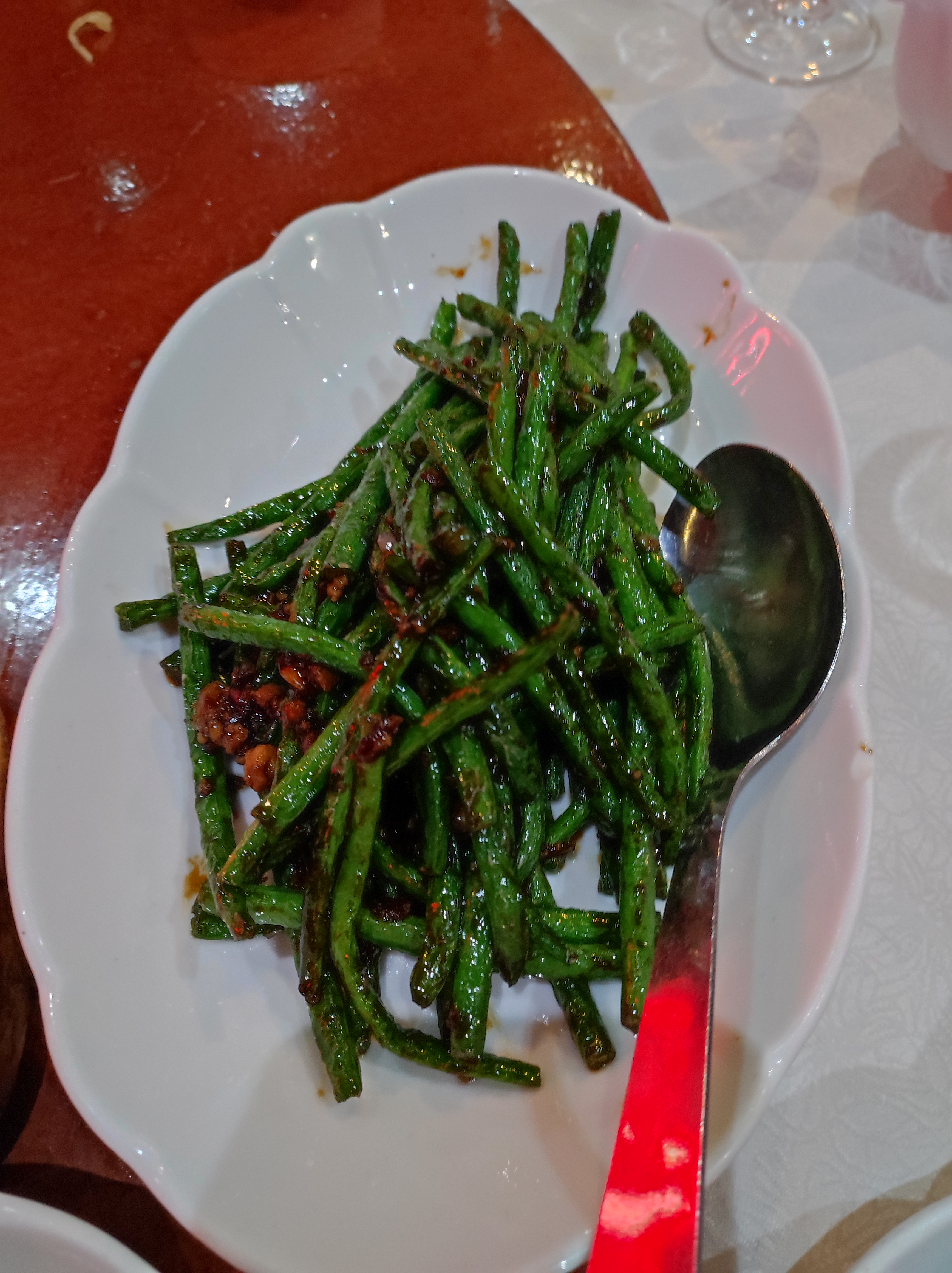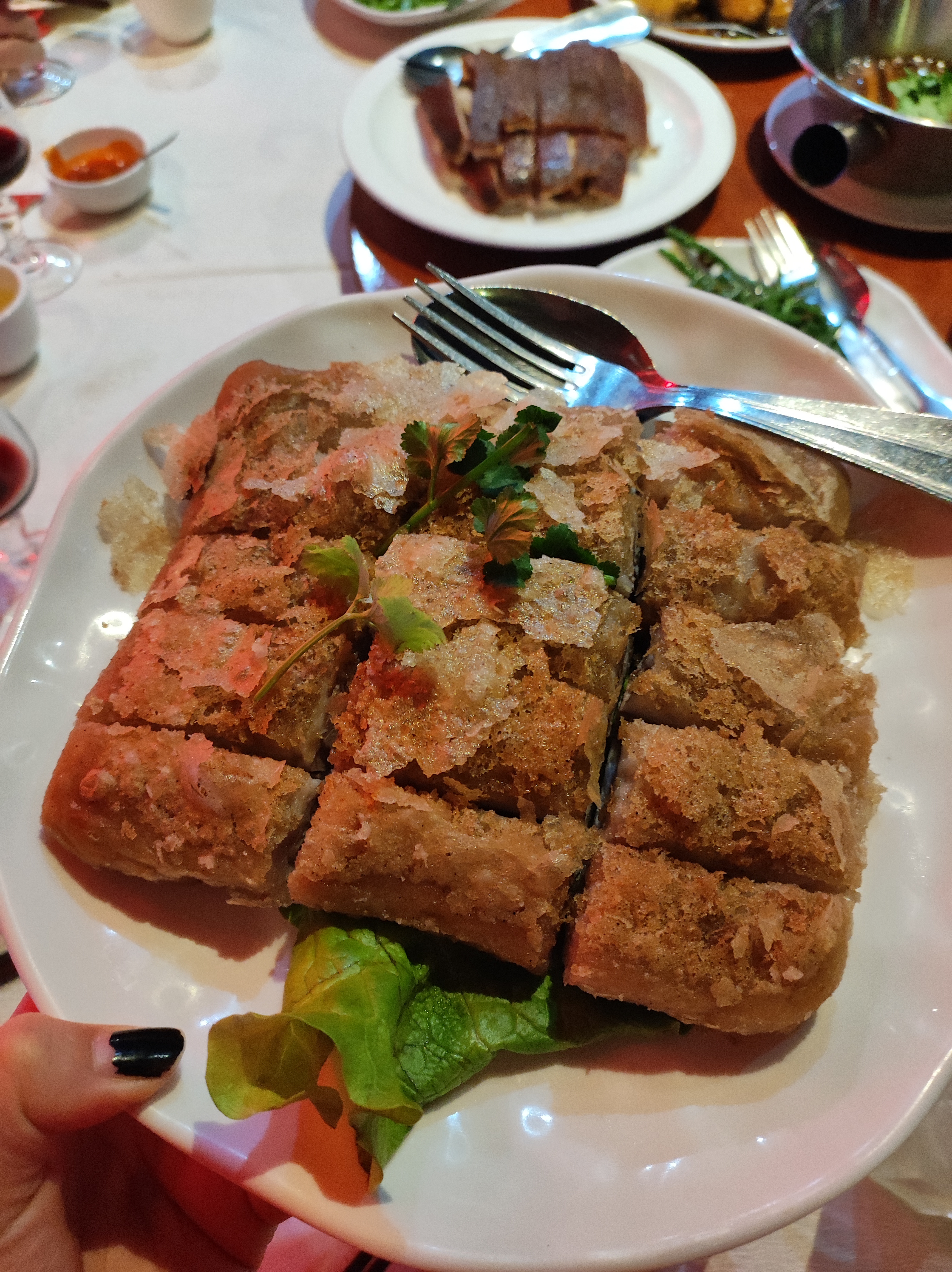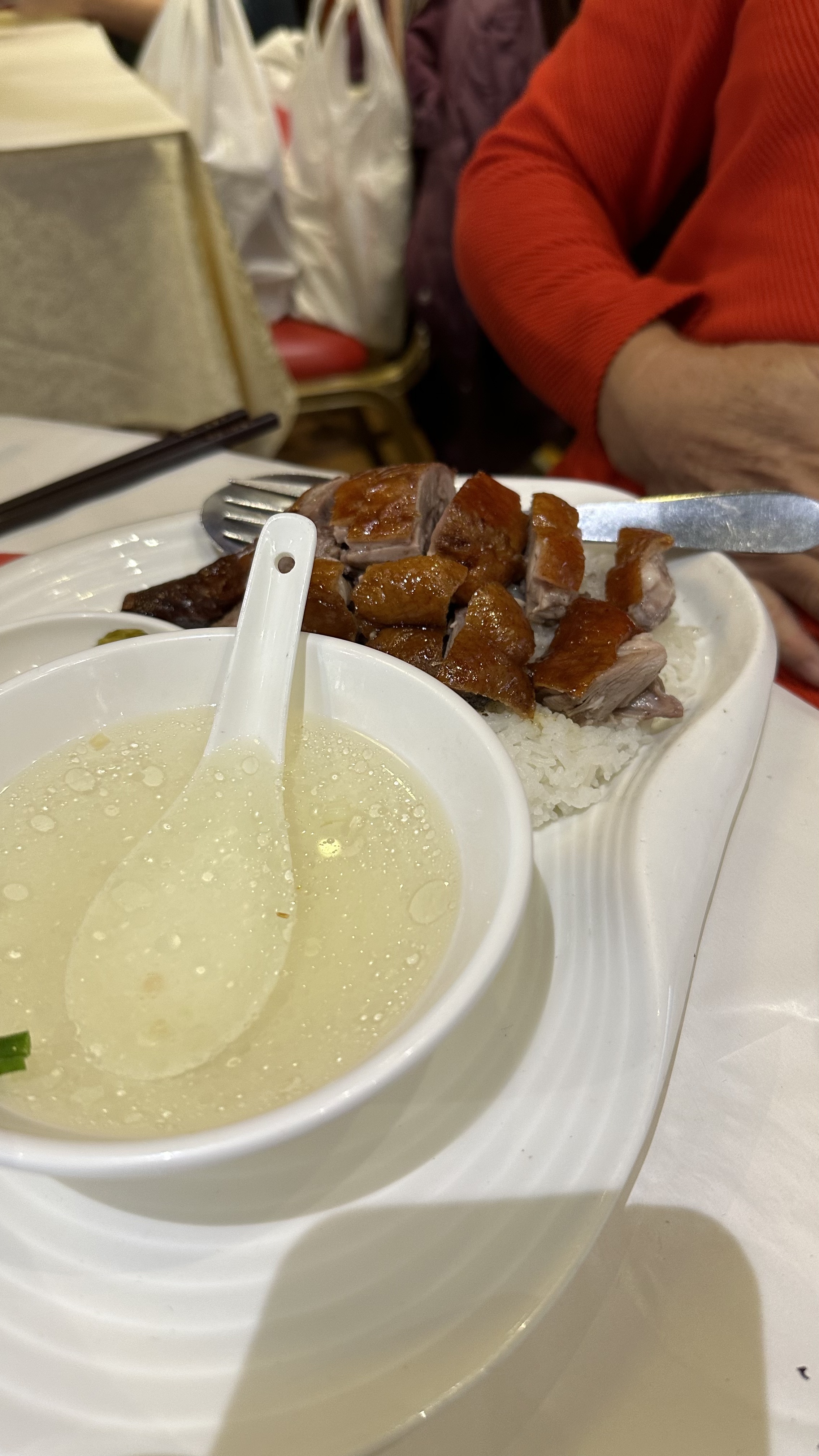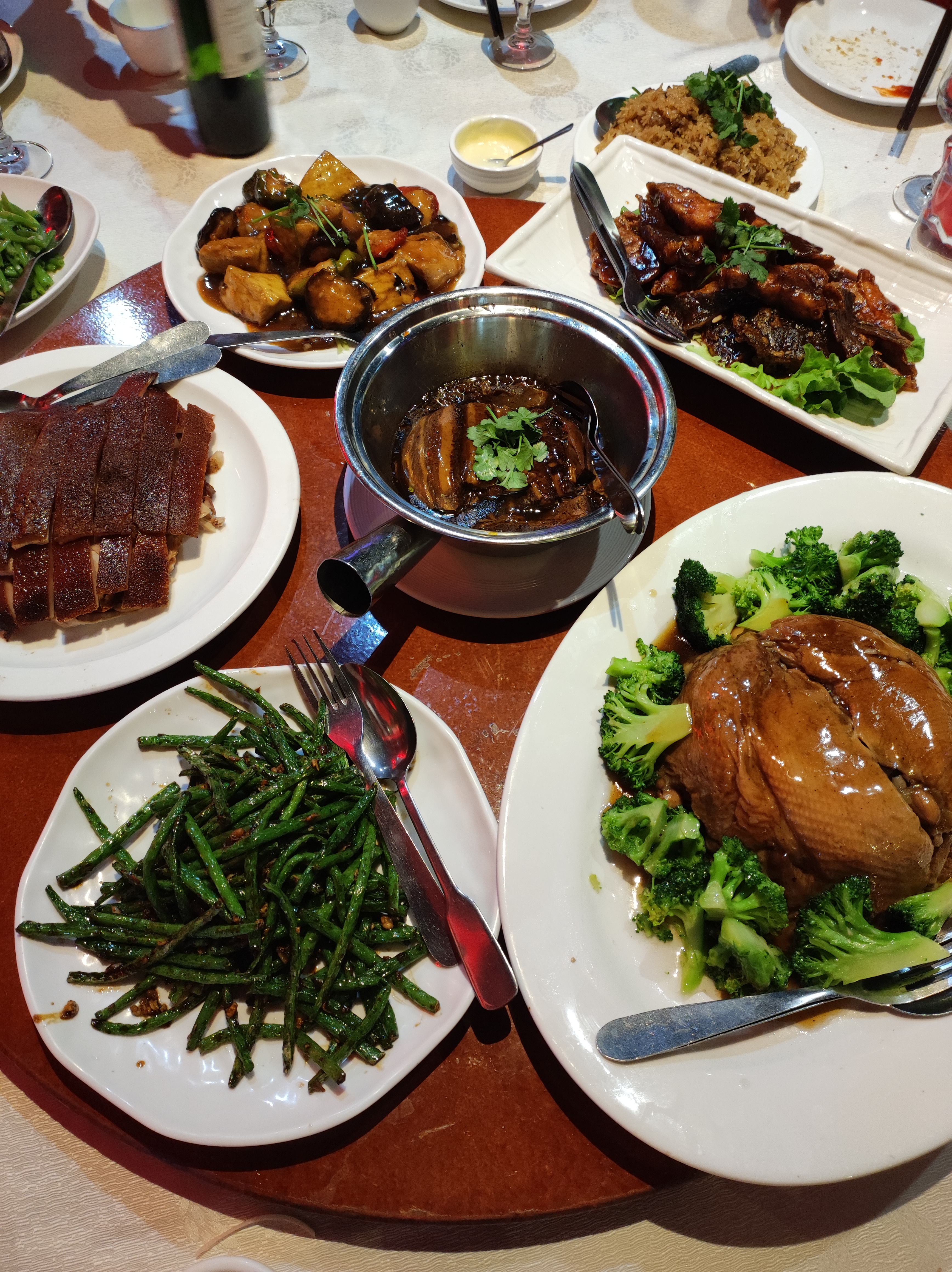 Nous avions commandé 4 entrées, 1 plat de légumes et 1 canard pékinois. Le serveur qui faisait la découpe de la peau du canard se sentait vraiment obligé. Les morceaux de peau de canard étaient de tailles énormes par rapport aux crêpes. Surtout, je tenais à laisser ce commentaire car, ce restaurant vole ses clients. Les cuisses et les ailes de canard n'étaient pas servies. Elles avaient tout simplement disparu. Car le peu de viande dans le potage (2ème service) et le riz sauté (3ème service) prouve que ce restaurant n'est pas très honnête !