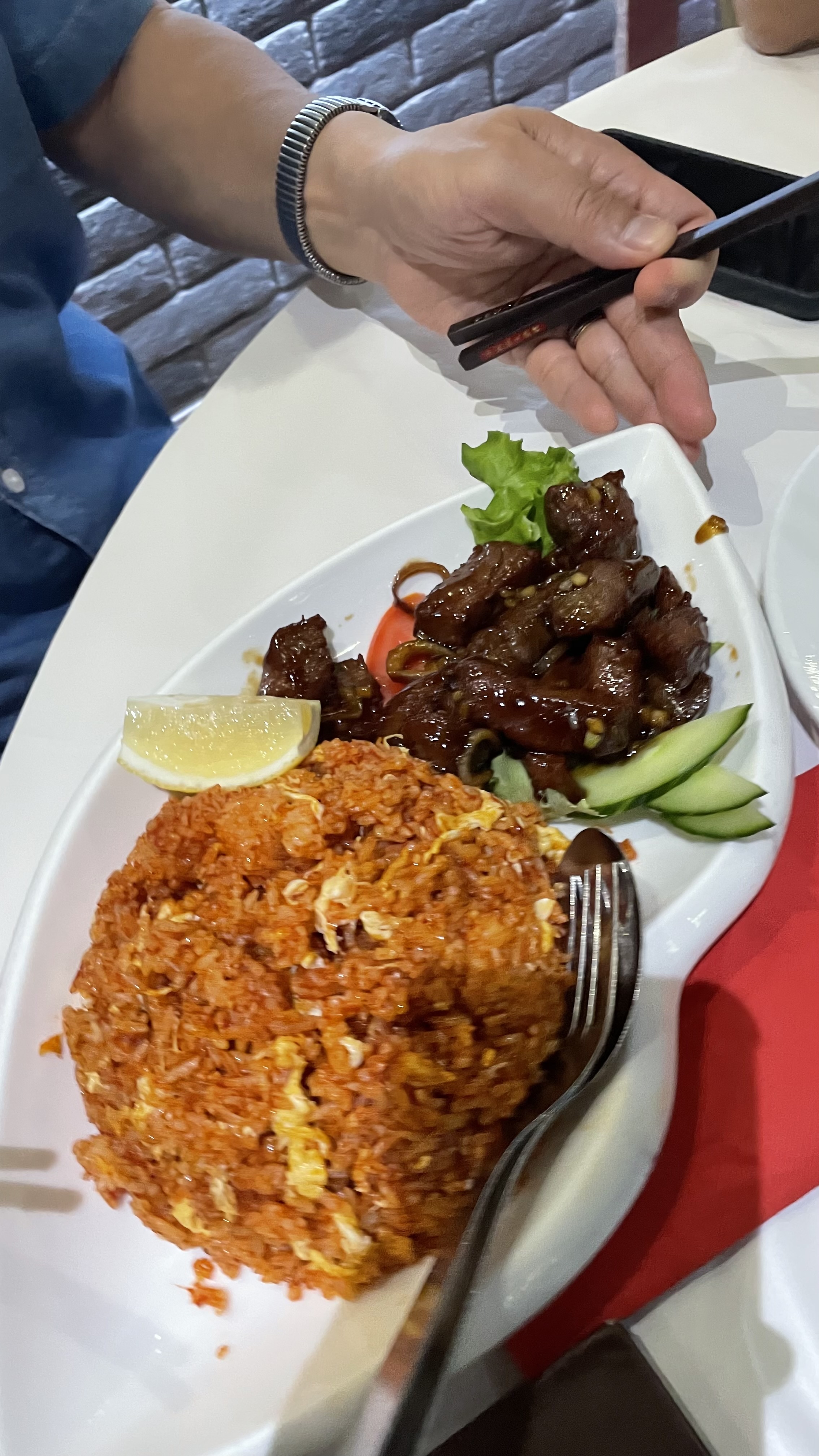 Je comprends pas les bonnes notes, le bœuf était tellement gras que j’avais l’impression de manger de la graisse en morceaux. Le riz était sans goût. J’ai demander un coca et évidemment on m’a donner la bouteille à 7€ et pas la canette à 4€. Bref j’ai trouver peu de points positifs. Au bout de 4 serveur qui sont venu nous demander si on avait finit ils ont finit par nous laisser boire le thé insipide tranquillement