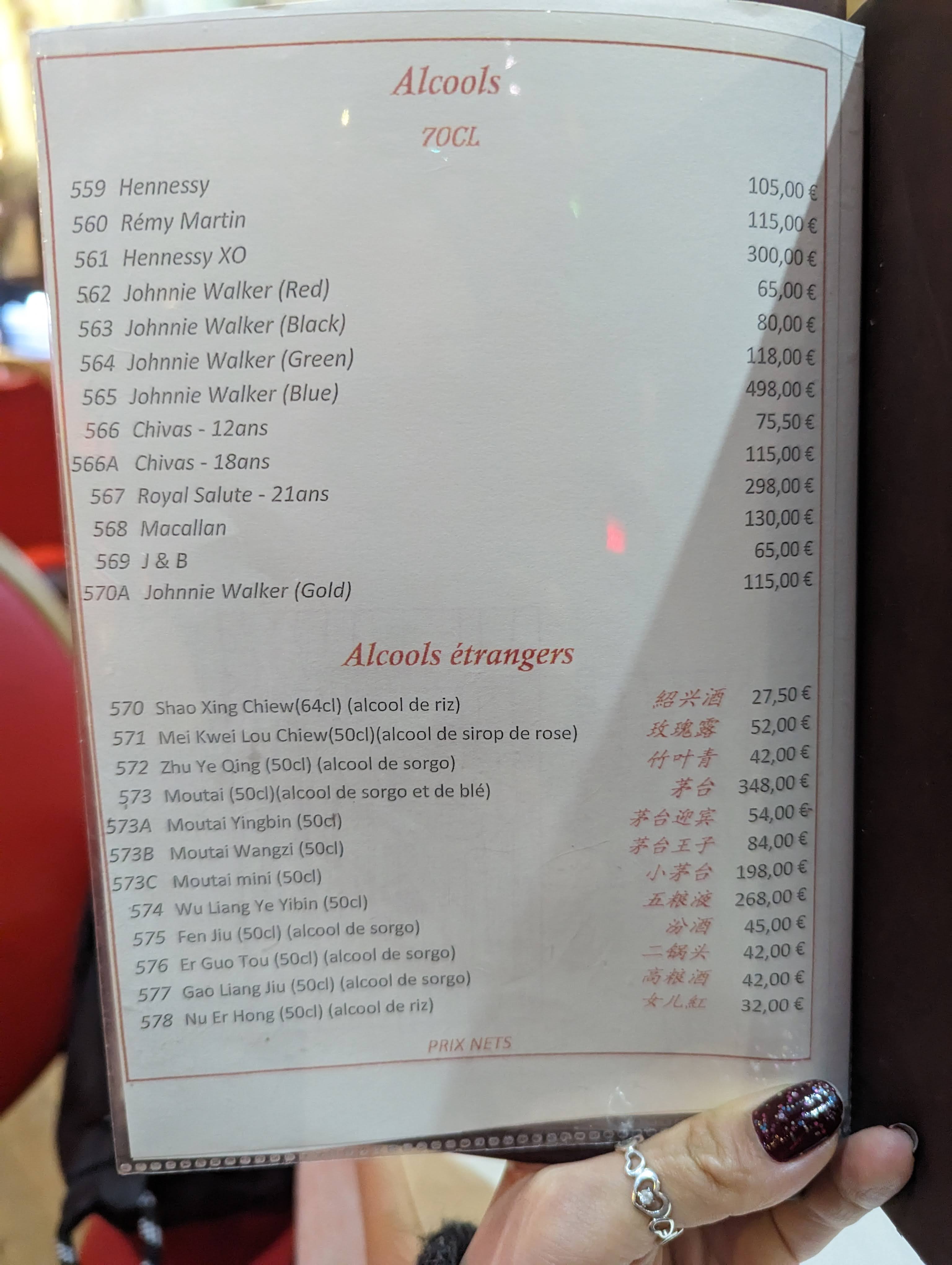 Les prix sont plutôt élevés : 26€ le petit barre sauce aigre-douce. Les nouilles aux bœufs (quelques morceaux sur le dessus) sont à 12€ et très salées. Le riz cantonais était également trop salé à mon goût. 3* pour l’espace car il est grand.