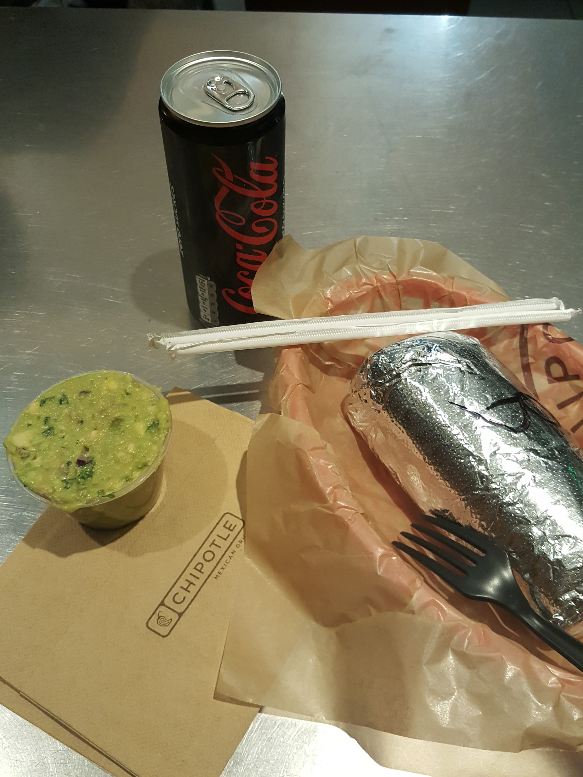 Tu as envie d'observer le travail à la chaîne viens chez Chipotle ! Je sais pas si c'est partout pareil mais à la Défense c'est une sacrée turbine ! La file d'attente était interminable il y avait bien 20 personnes devant moi (de quoi rebrousser chemin mais les avis semblaient dire que ça allait vite) et je n'ai attendu que 5 minutes avant d'être servie. La dernière fois que j'ai mangé un burrito c'était aux Etats-Unis, j'avais 17 ans et j'en garde encore un bon souvenir tellement c'était bon ! Je ne m'attendais pas du tout donc en allant chez Chipotle à retrouver ce genre d'émotion, c'est un fast food qui décline exactement les mêmes produits dans différents formats (salade, burrito, tacos). C'est pas du tout mon genre d'endroits mais bon parfois on a envie d'un gros truc un peu consistant qui réconforte (ahah pardon n'aies pas l'esprit mal placé !). J'ai pris un burrito, je ne sais même plus à quoi, tellement l'usine, pardon le service, est expéditif. Mieux vaut connaitre la carte sur le bout des doigts sinon ton burrito est déjà emballé et à la caisse avant que t'aies eu le temps de dire un truc. Pour finir c'est très cher. Plus de 9€ pour ça et vu qu'ils en vendent minimum 4 par minute fais le calcul !