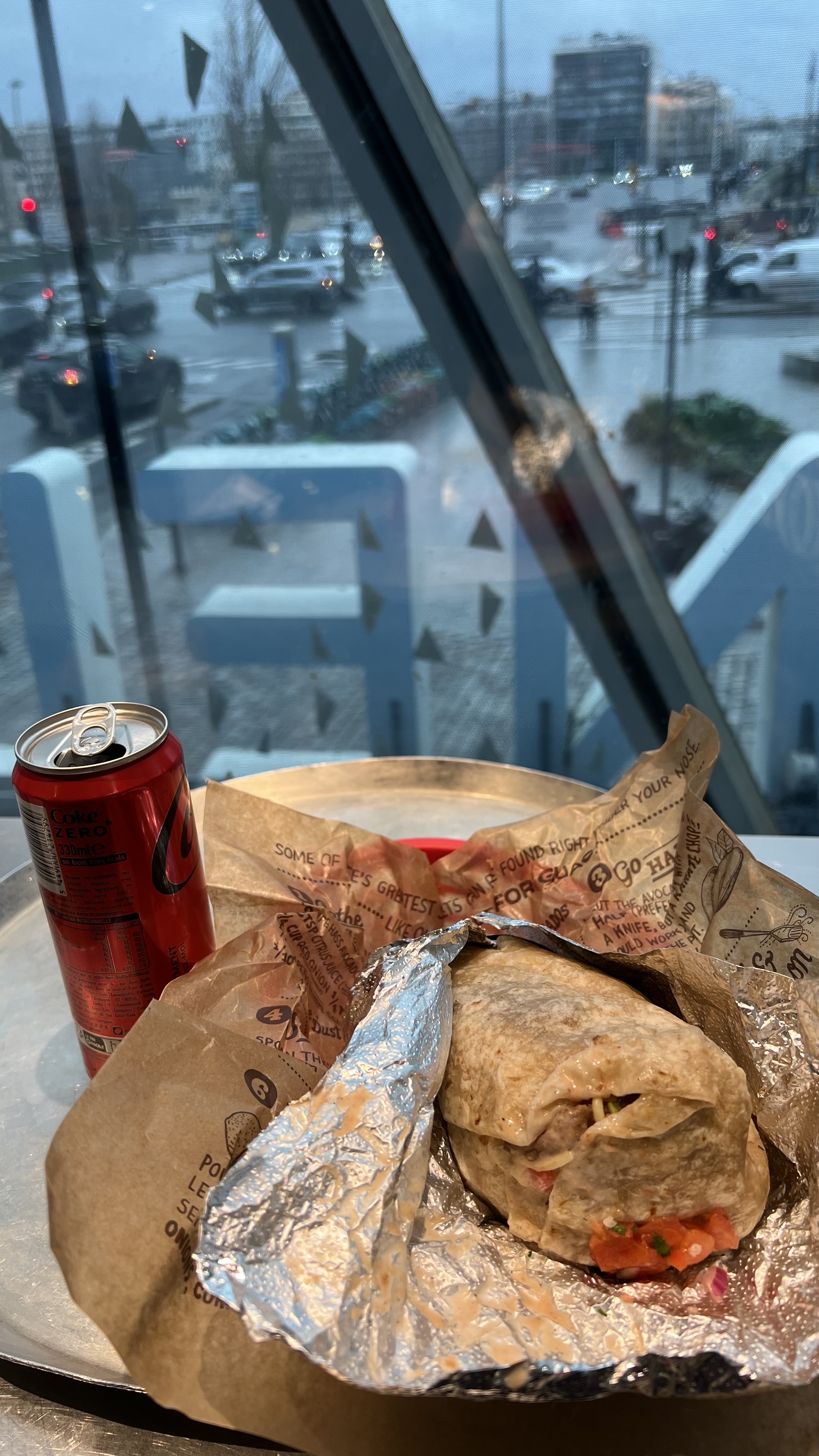17 balles … franchement, le burrito est froid et un peu éclaté, le coca est tiède. Présentation de la composition qui fait pas voyager, Les touches de la machine à carte bleue pleine de graisse. Première et dernière içi. Vaut pas le coup. Deux étoile pour la vue.