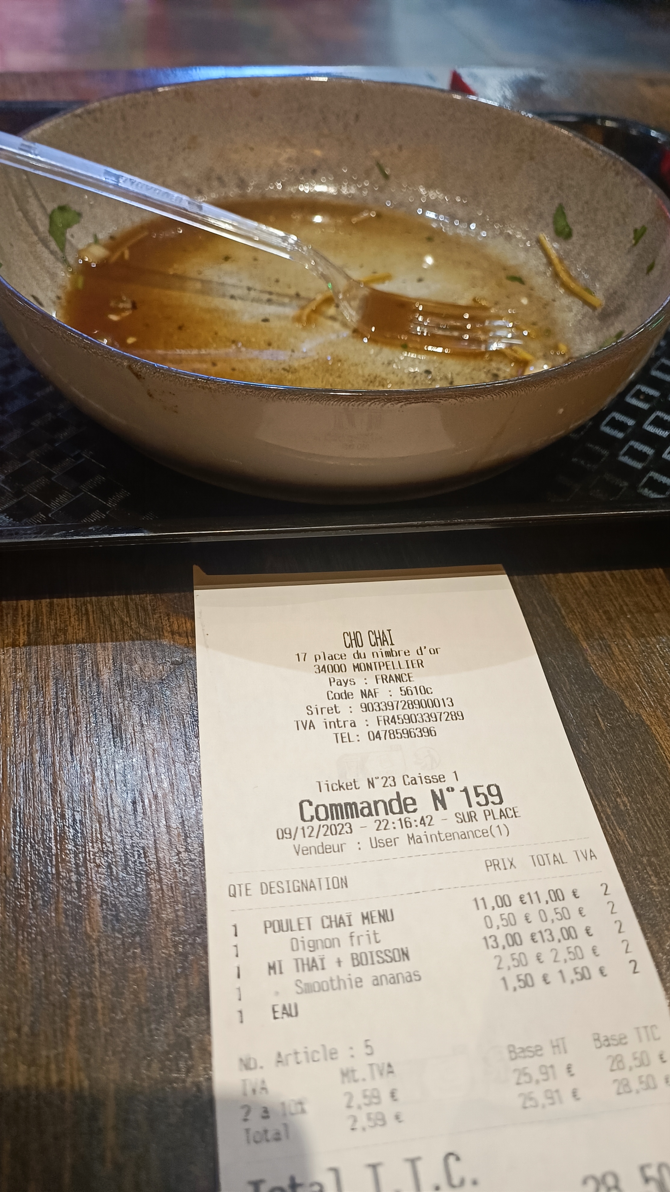 Mauvaise expérience : Je suis partie manger las bas le 24/09/23. Déjà les bornes ne marche pas... De plus le plat était froid, fade et le pire de tout a la fin j'ai eu une intoxication alimentaire dans la même journée sachant que cho chai était le seule repas de ma journée... Vomissement etc... A fuir.