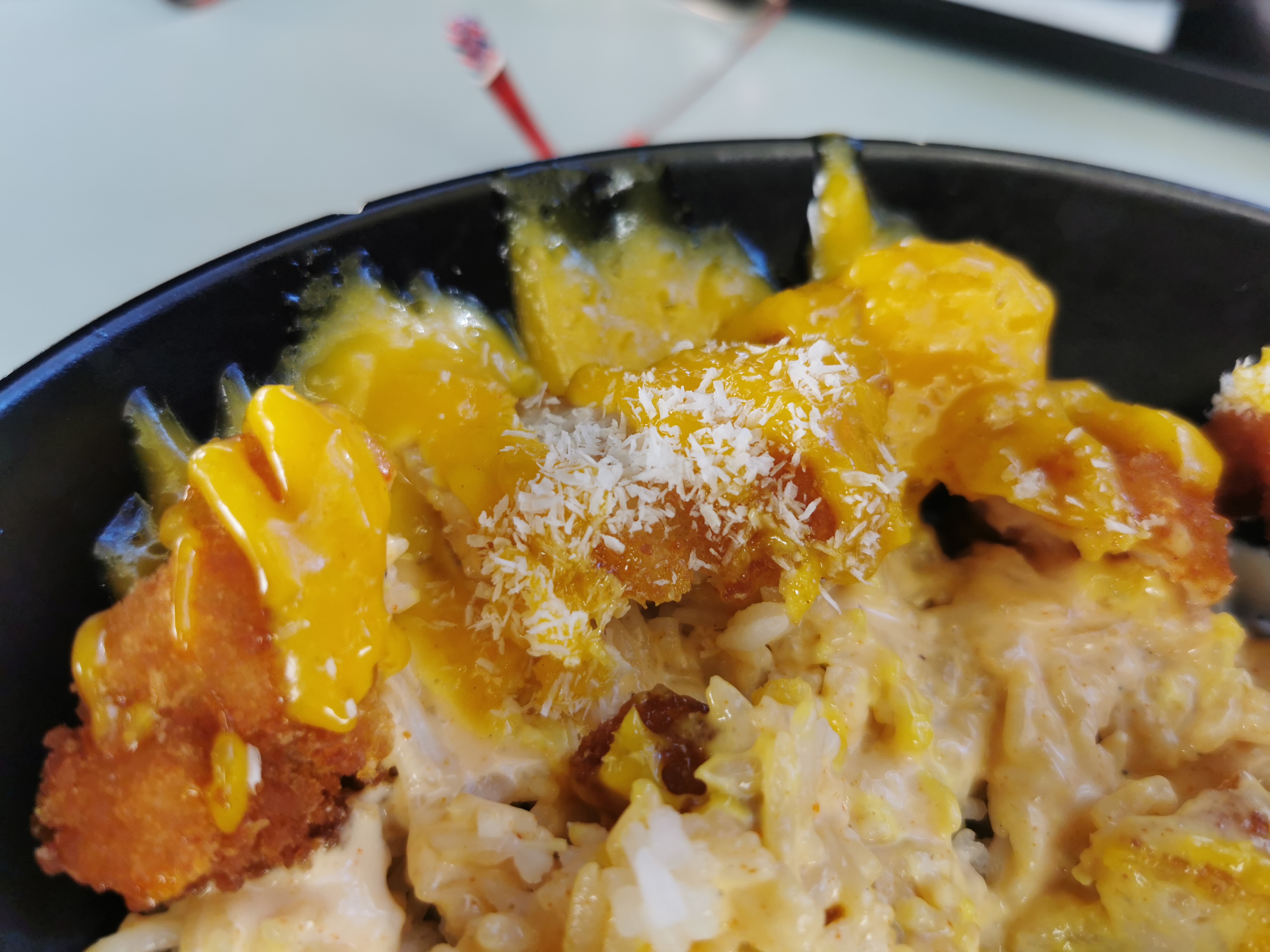 Les nems sont mous et humides. Le poulet / riz est loin d’être raffiné ; très peu de poulet (pas croustillant de surcroît), sauce curry industrielle, plat sec et sans saveur. La promo 1+1 n’est aucunement une raison de bâcler les plats ; j’ai bénéficié de cette promo dans bien d’autres restaurants, sans pour autant que la saveur soit laissée de côté.