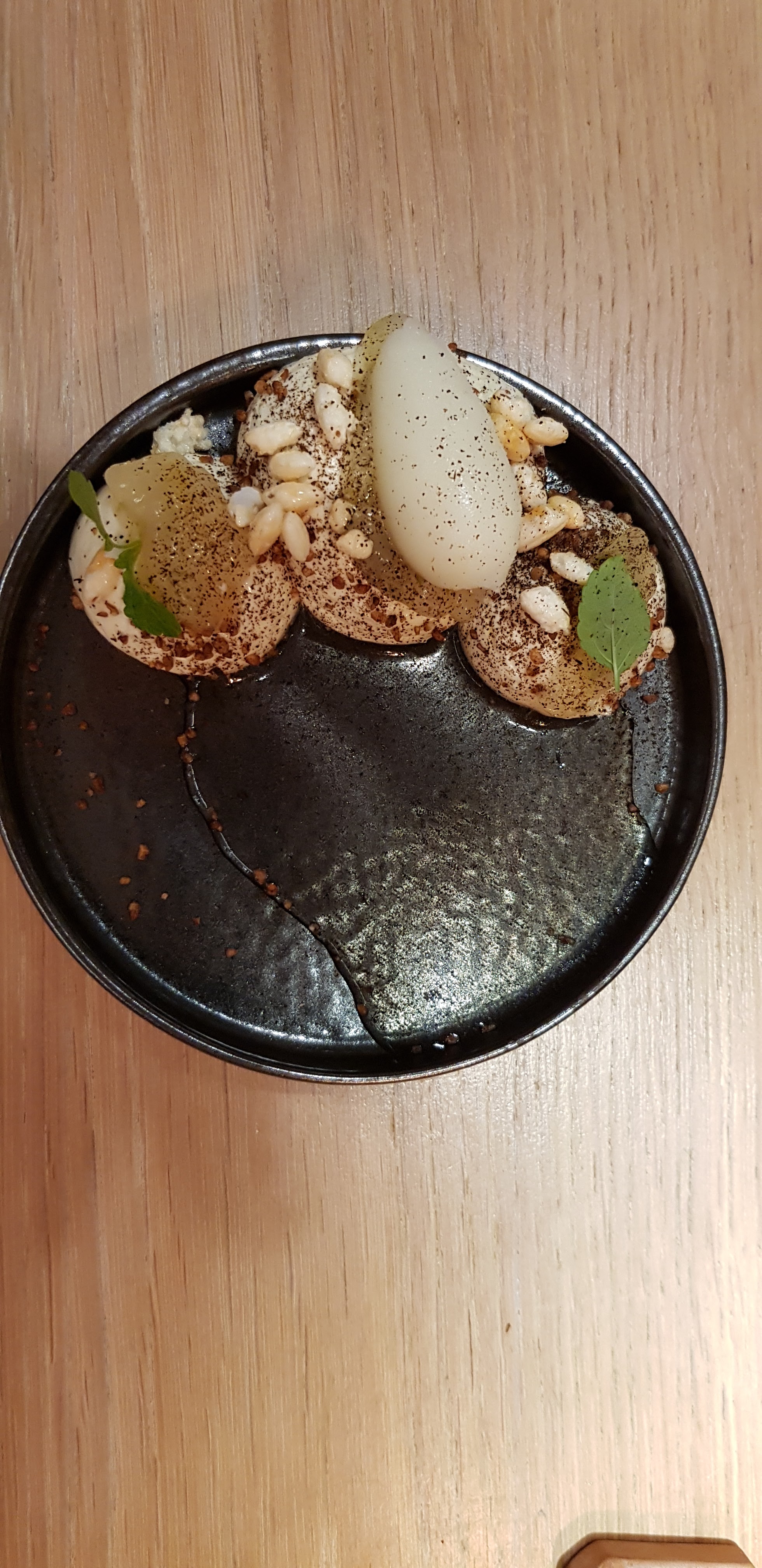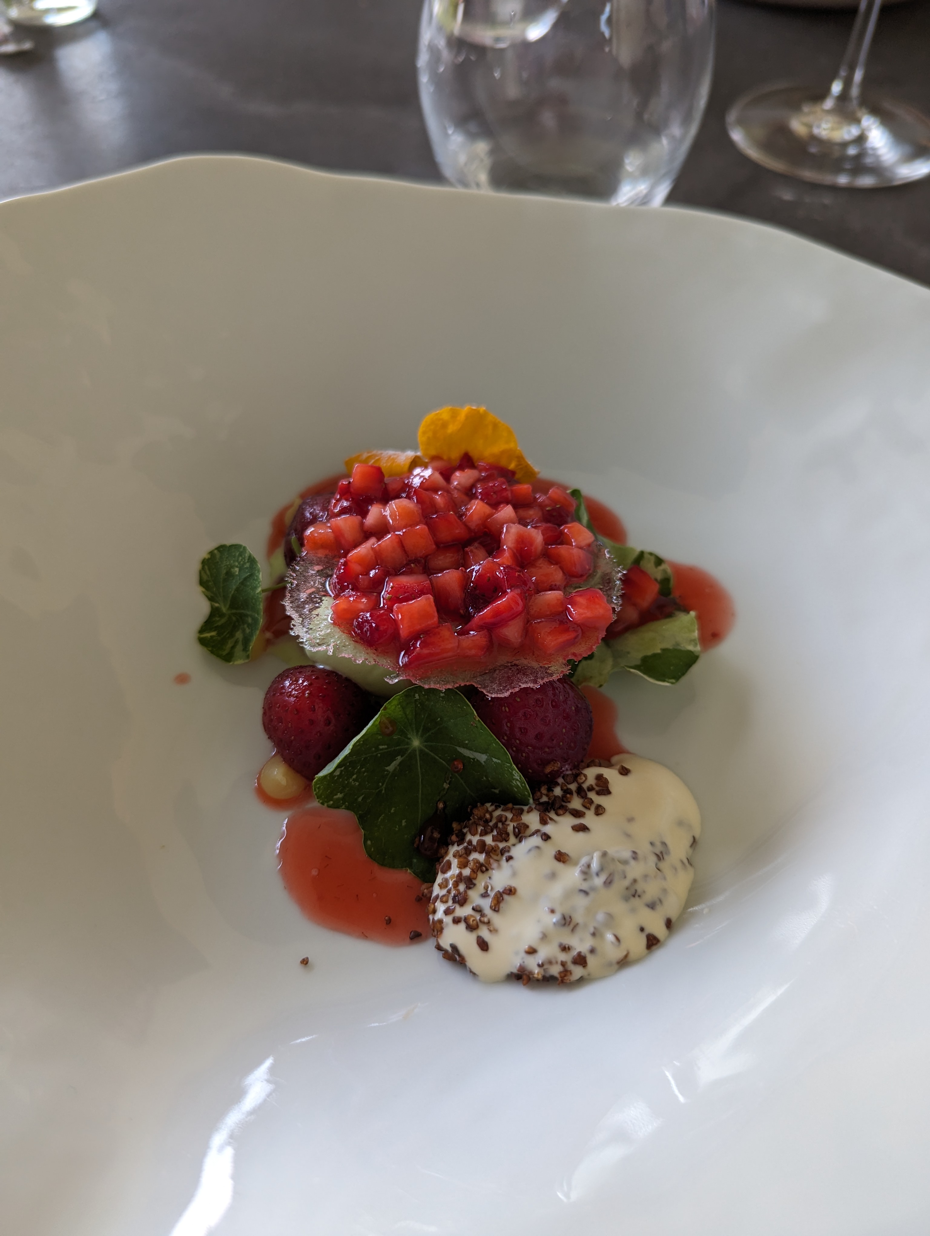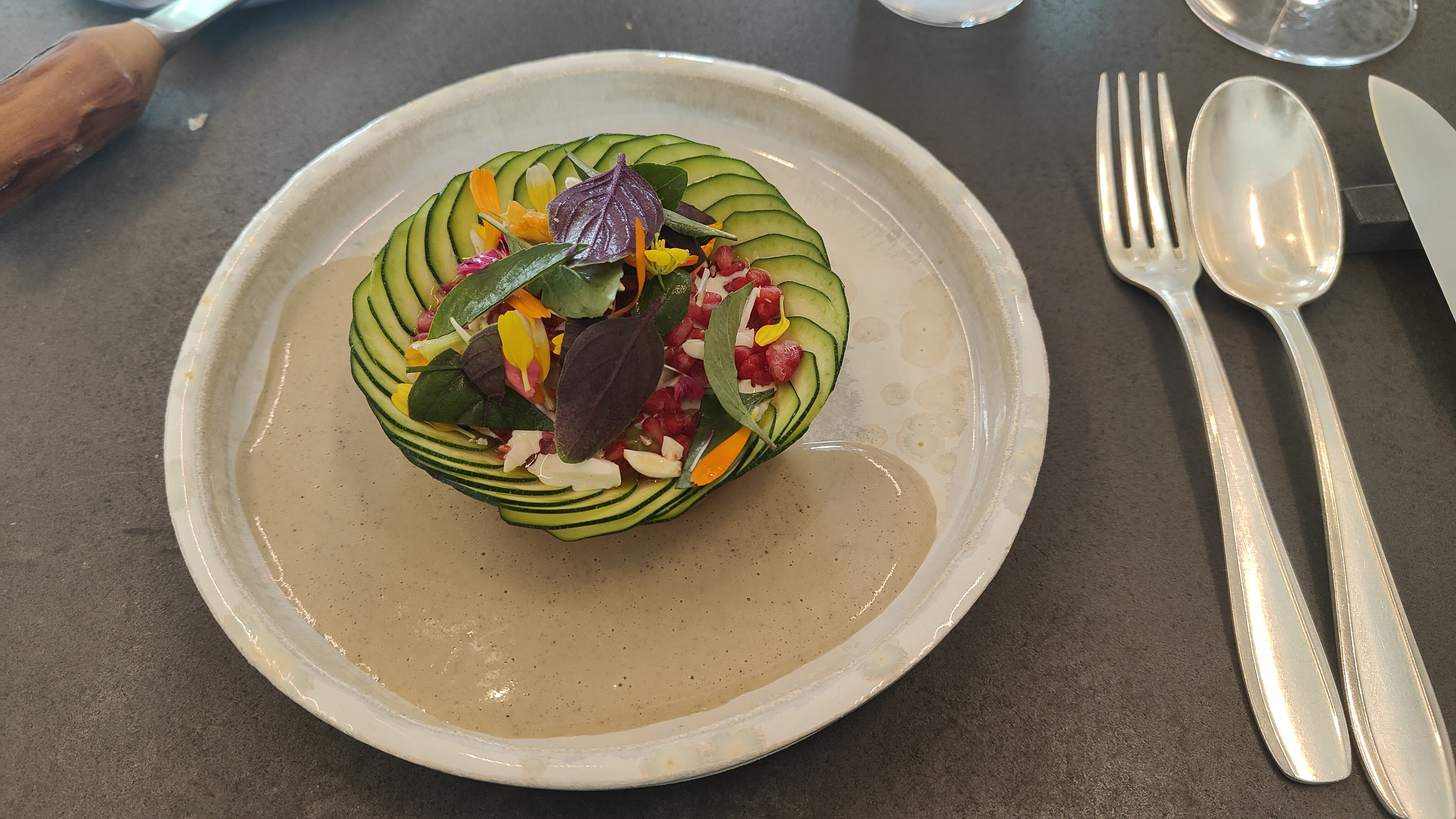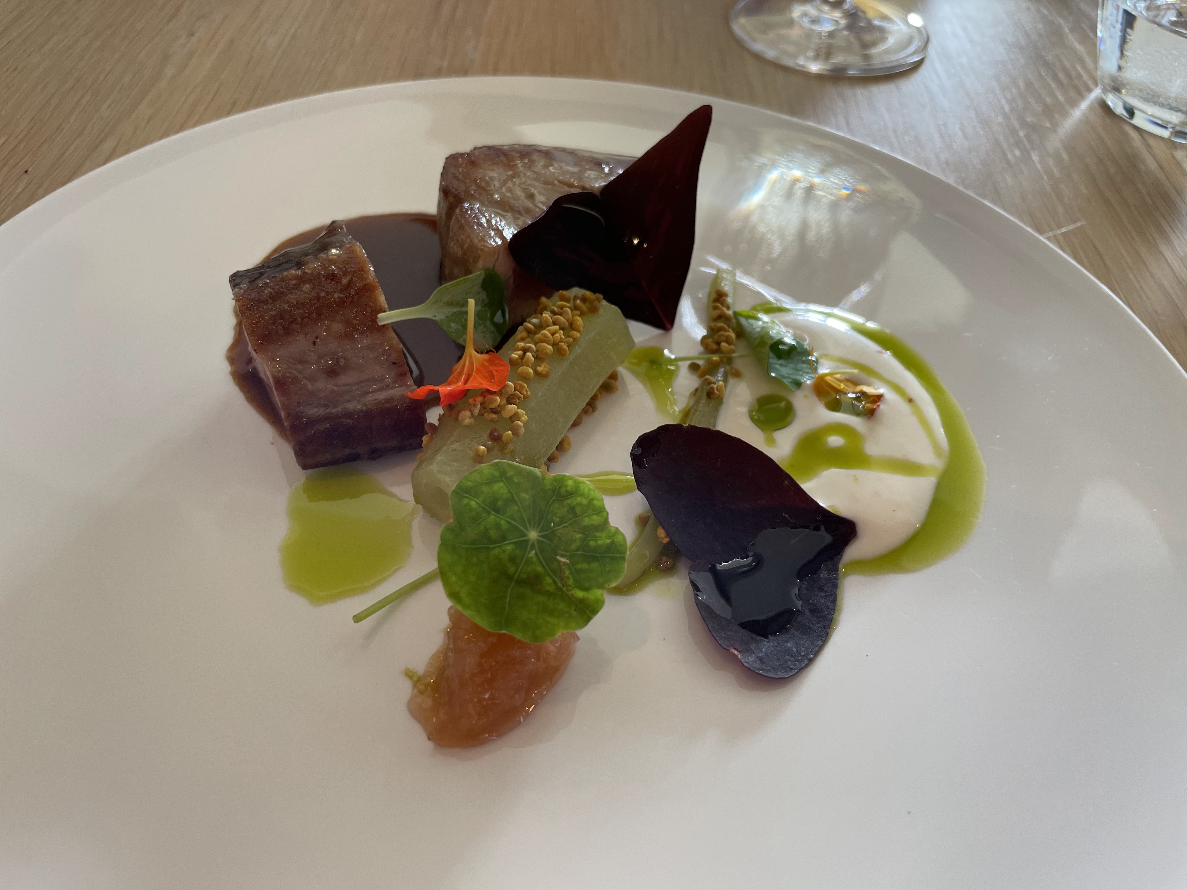 Eh bien magnifique travail super bien présenté(voire photos ) mais ...fort déçu : les plats sont tellement sophistiqués avec des tas d'ingrédients que le goût y est ....insipide fade ..c'est le pb de ces restaurants gastronomiques qui en font trop et le résultat est là ! Très cher et ..décevant souvent Bien sûr leur travail est remarquable mais comme j'ai entendu dire très souvent et c'est le reflet de la vérité : LA MEILLEURE CUISINE C'EST LA PUS ..SIMPLE ..!