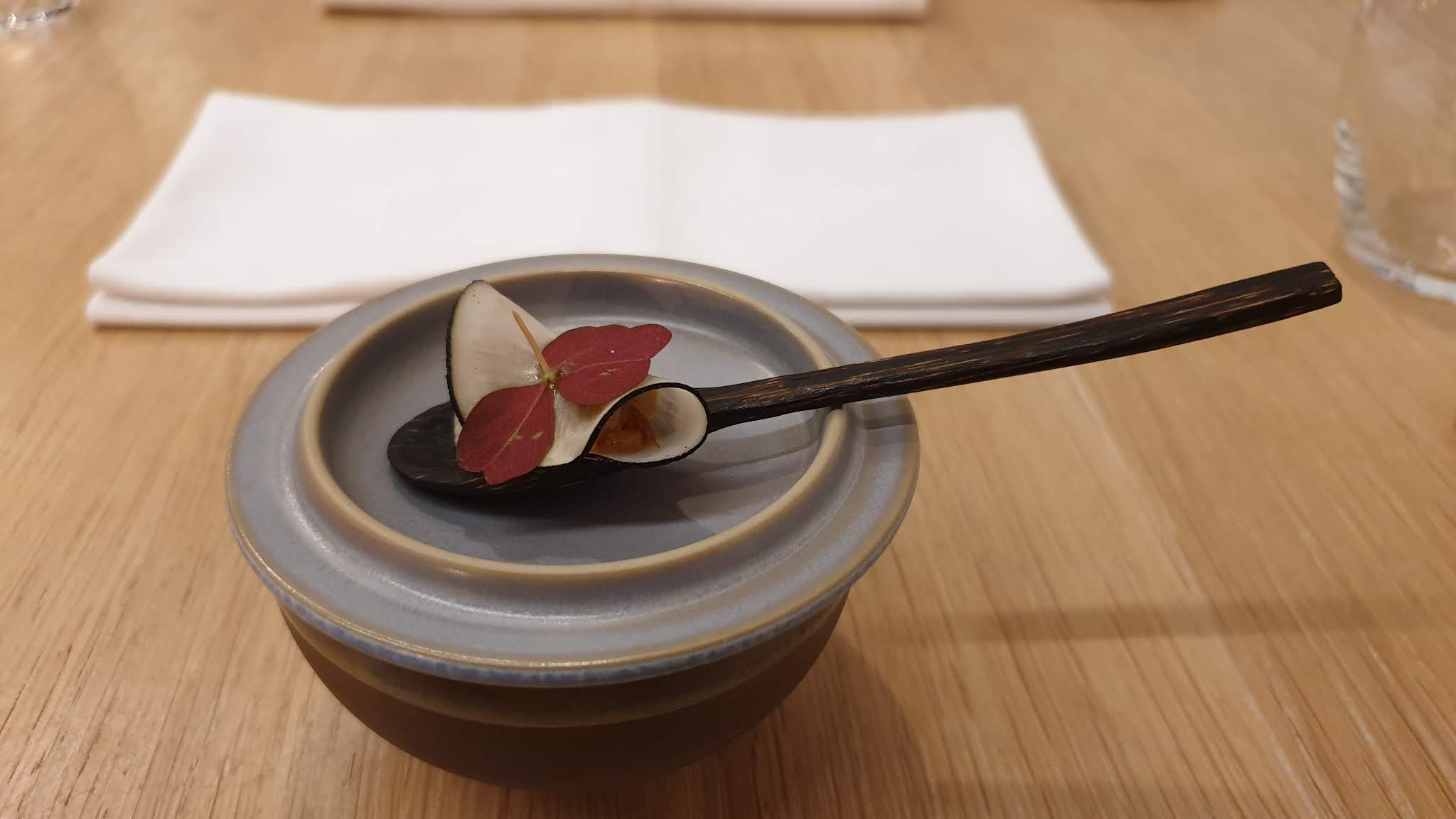 Première restaurant étoilé pour ma part et très content de découvrir ça chez Choko ona. Menu en 6 dégustation pour ma part, je retrouve de la justesse, précision et finesse dans chacun des mets. Les plats vont à l’essentiel mais mettent parfaitement en valeur les produits et c’est ce que j’espérais trouver chez vous. Merci pour cette expérience, service et décoration parfaite aussi. Gros coup de cœur sur la sauce au safran et les moules du bouchot.