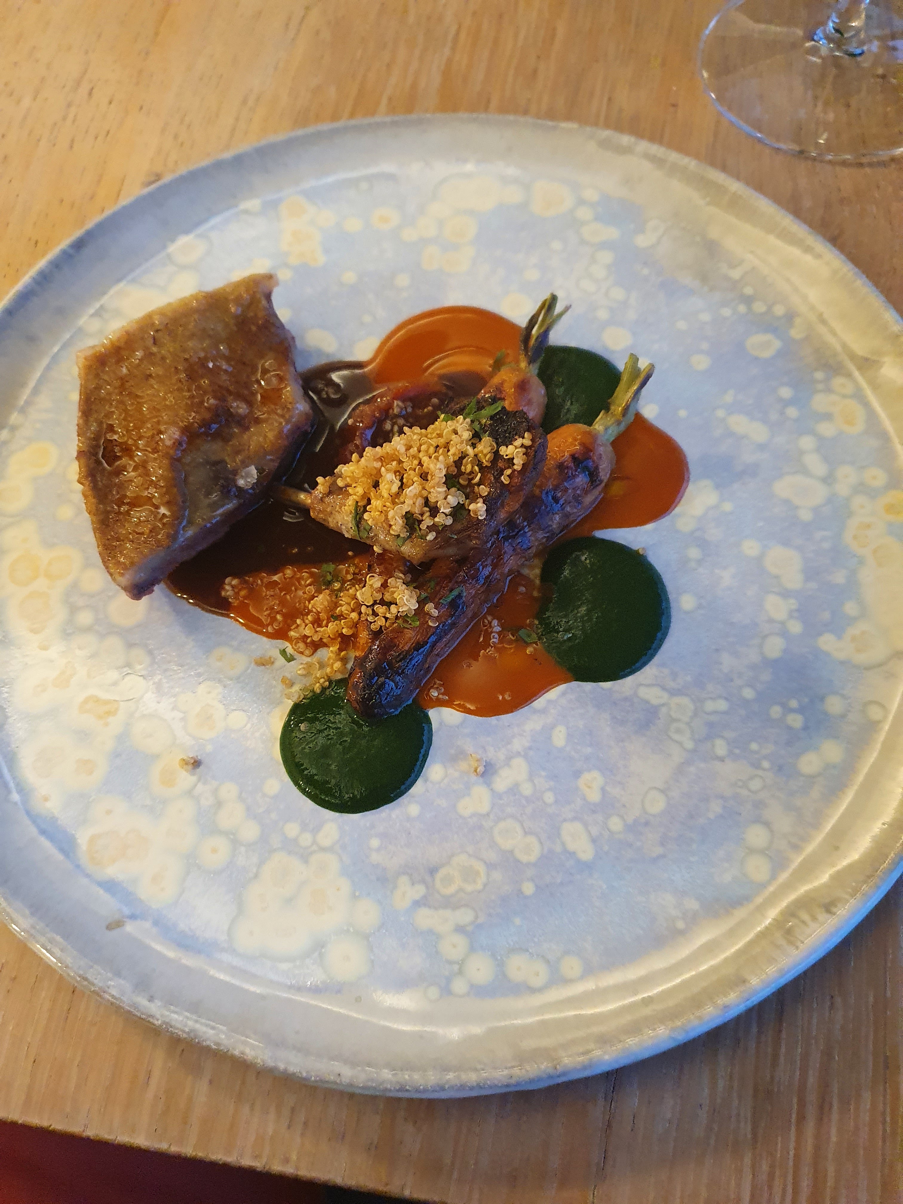 Le cadre du restaurant est très appréciable, le service est aimable et attentionné 👌 D'un point de vu général, les plats sont savoureux avec un mélange de texture, de saveur et de couleur 😋 🦊Concernant le menu à 6 plats, on apprécie nettement le travail et la recherche des plats, mais le manque de produit plus noble est à regretter 🍽On note que les 2 plats de poisson et viande ont été faible en quantité... Excellent idée de mettre 2 façons de travailler le bœuf ( cuisson et tartar) mais le Quinoa torréfié présent dans l'un et l'autre ne marque pas la différence de texture. Manque de fraîcheur dans le tartar.. J'ai particulièrement apprécié de finir sur une note fraîche et légère à la place de mignardises 😊 Nous avons passé un agréable moment je vous recommande de faire le détour ! 😉