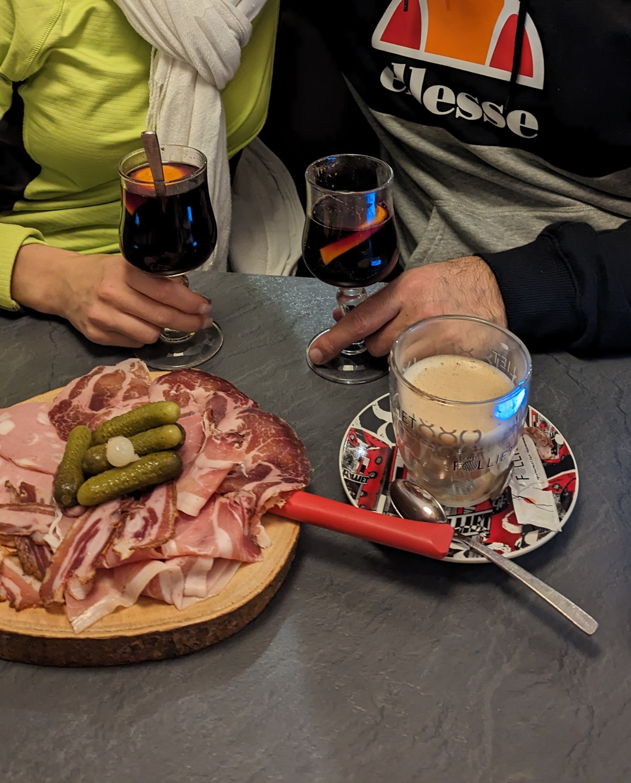 Nous sommes allés au bar boire du vin chaud... Au final nous avons aussi commandé de la charcuterie !) Le vin chaud et la charcuterie étaient très savoureux ! Un merci spécial pour le service - rapide et avec le sourire ! Nous avons été très heureux d'être venus à cet endroit !