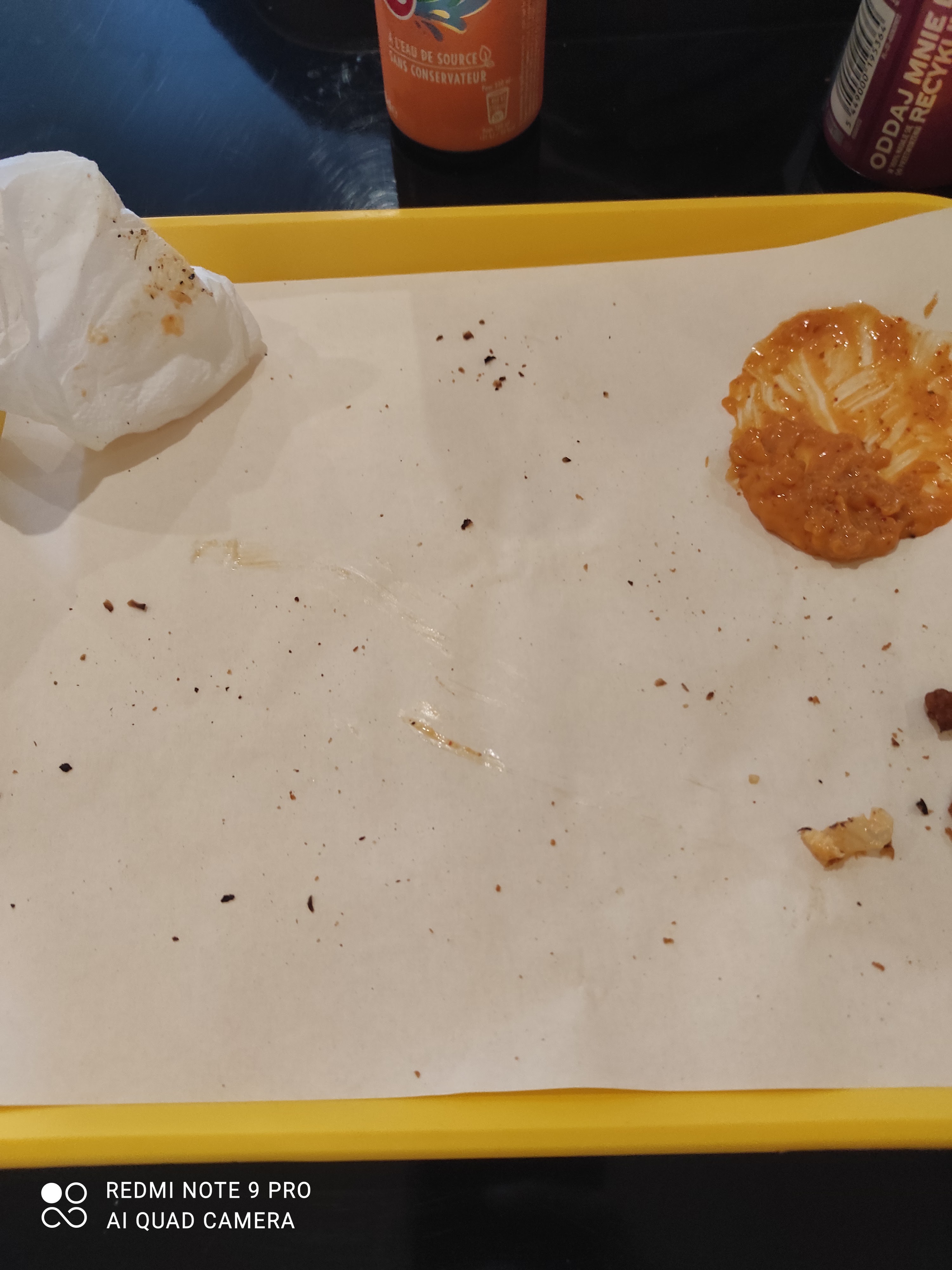 Repas éclaté dans la boîte comme si j'étais un chien pas de boisson donc le gars allez retour pour ramener les mauvaises boissons .... rien dans le sandwich... même la sauce c'est pas la bonne au bout d'un moment quand t'es incapable de faire un simple sandwich arrête....