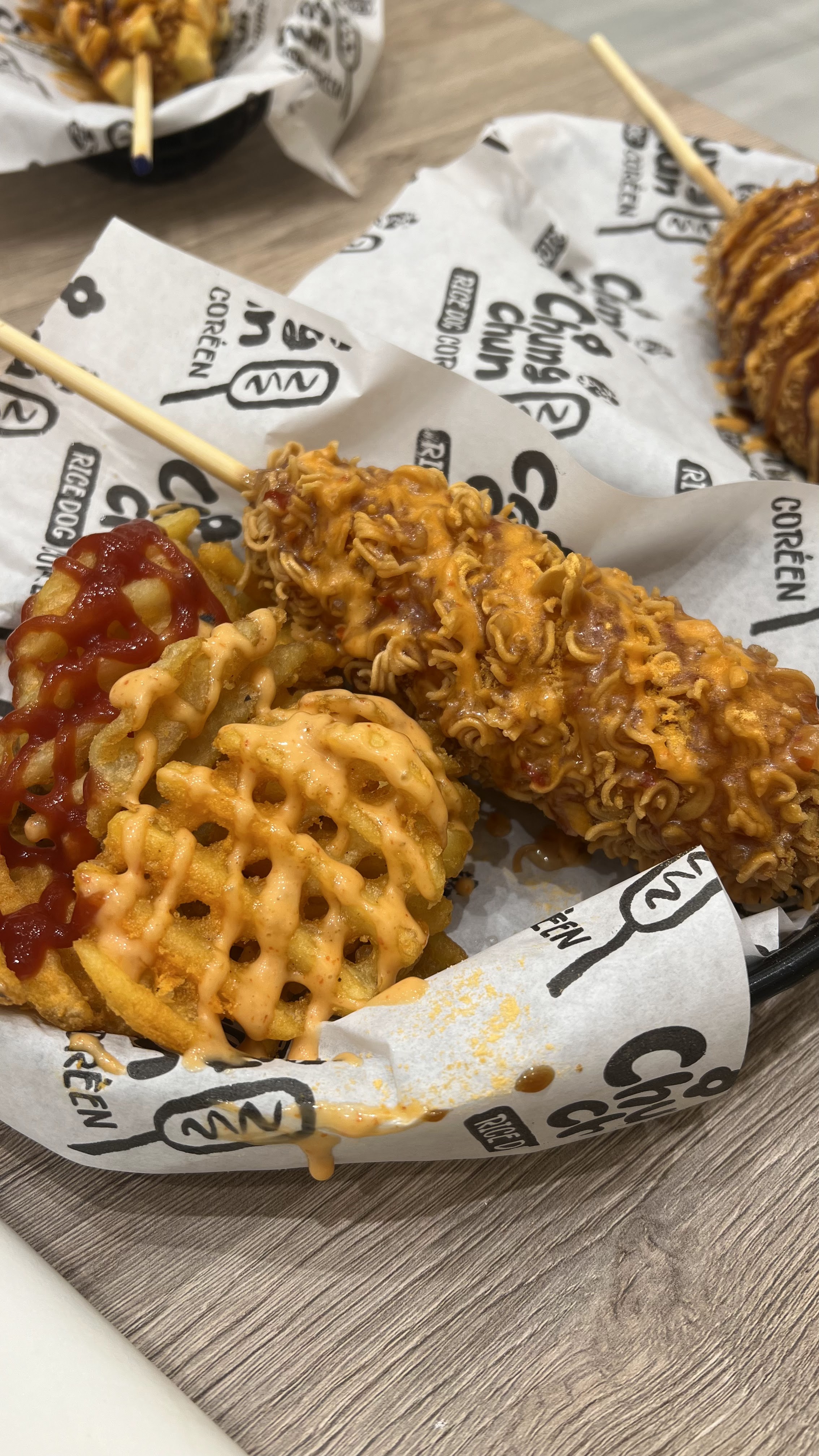 C’était génial !! Je cherchais justement un restaurant coréen qui propose des corn dogs, je n’en avais jamais mangé auparavant mais l’idée me donnait très envie ! Et je n’ai pas été déçue 🤤 accueil très sympathique, on commande sur une borne et une fois que c’est prêt on vous appelle pour choisir les sauces, il y en a pour tous les goûts. Fromage bien fondant et chapelure croustillante, je recommande !