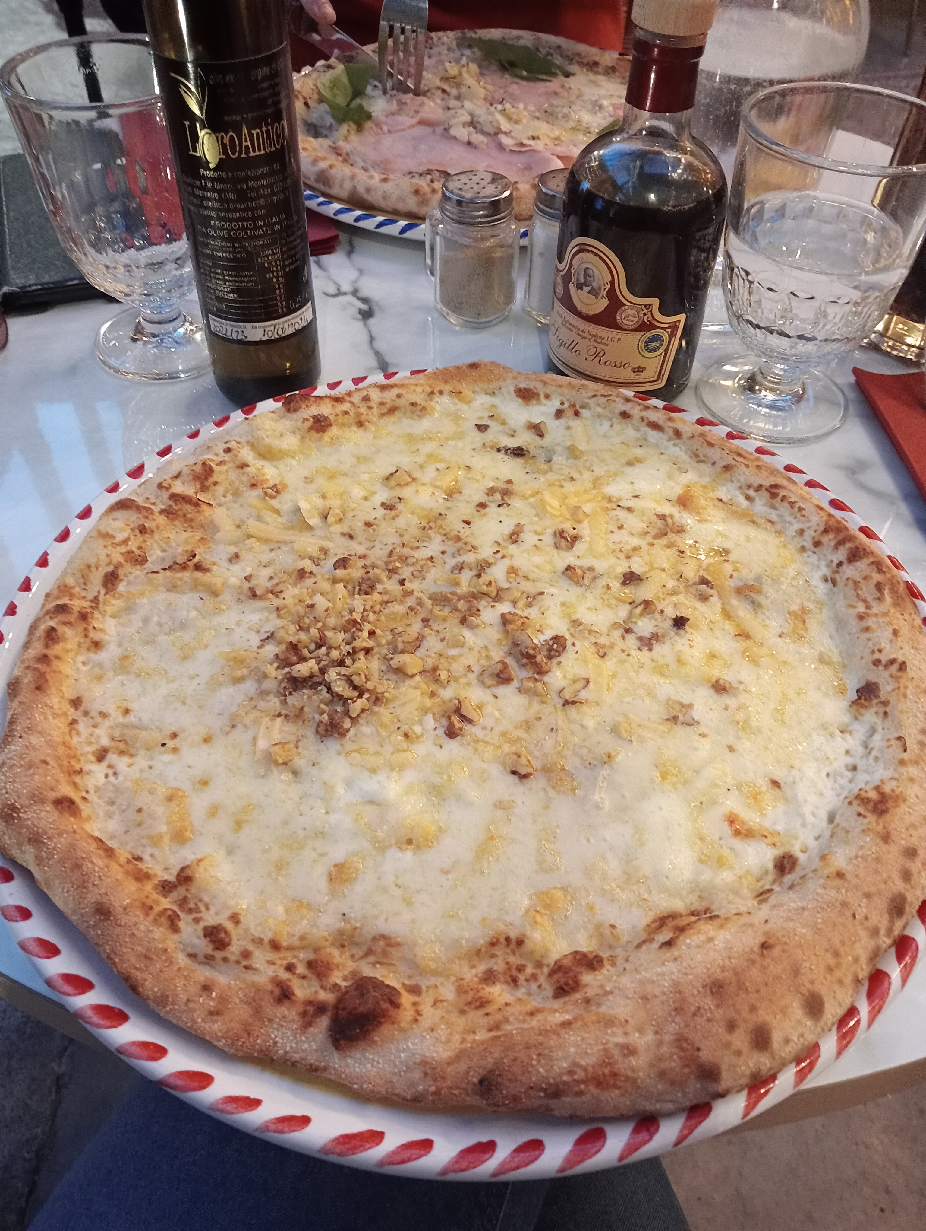 Pris du vin avec menu midi, sans doute tourné / ouvert depuis longtemps. Verre changé par le même. Aucune excuses ni geste commercial malgré la remarque en caisse. 5 serveurs différents nous ont servis, c’est très impersonnel. Hormis cela les pizzas sont bonnes, avec des prix élevés (14€ minimum jusqu’à 19€ la pizza) et le cadre fidèle à l’Italie 🇮🇹 Tips: privilégiez le fond de la salle, plus calme et cosy, qui vous évitera le bruit incessant du téléphone qui sonne sur le comptoir…
