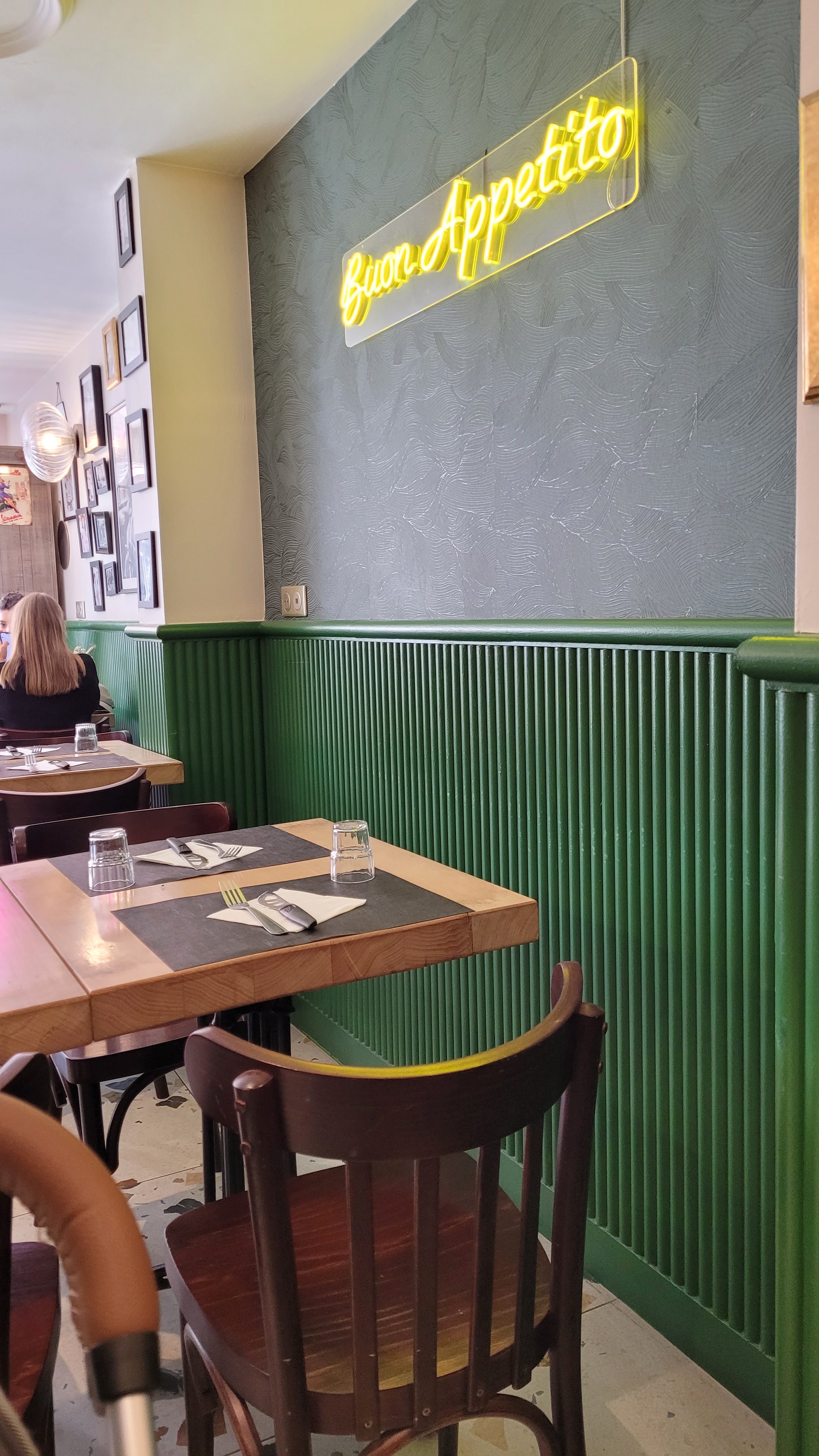 Petite salle avec quelques tables mais une carte qui donne envie! Je me suis régalée avec les gnocchis à la bolognaise et le tiramisu spéculoos ! Je conseille 😉