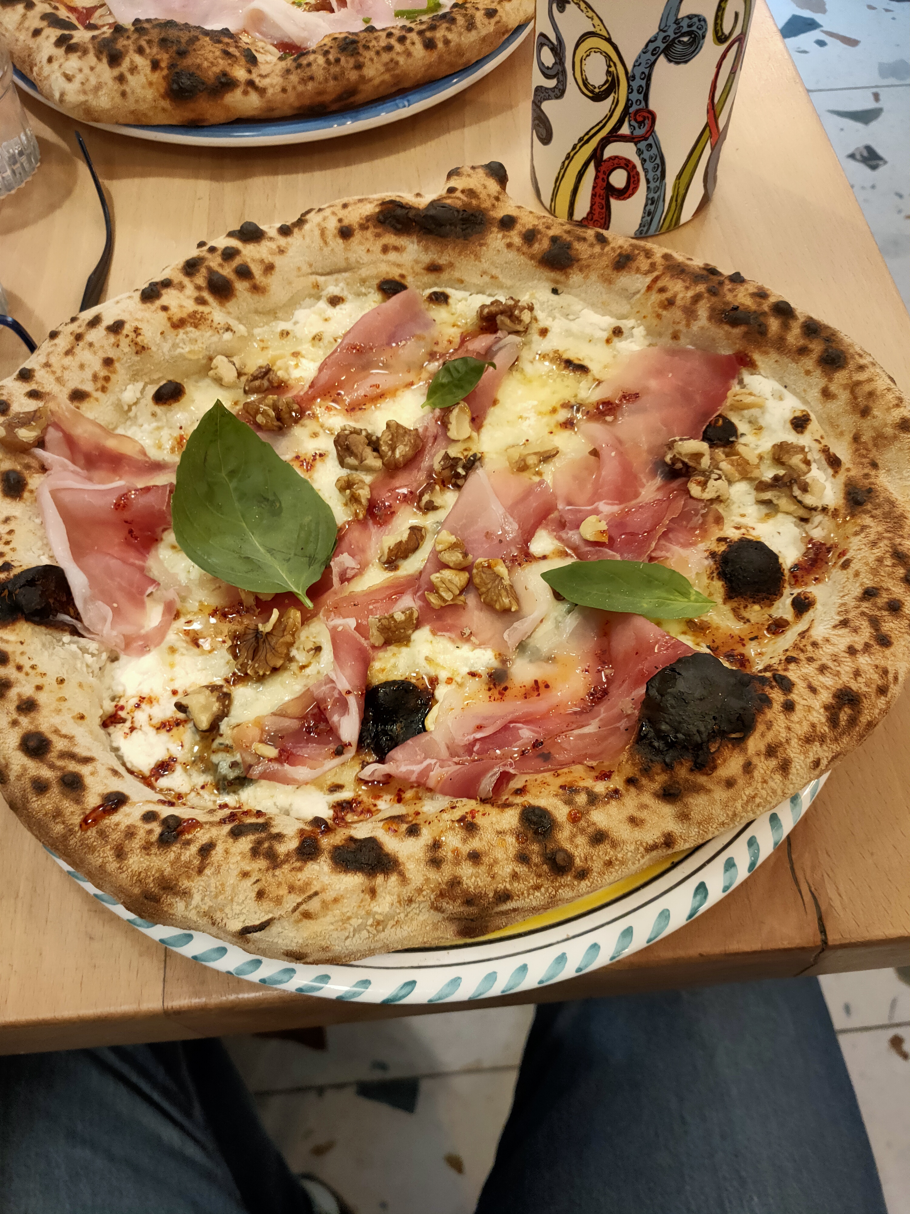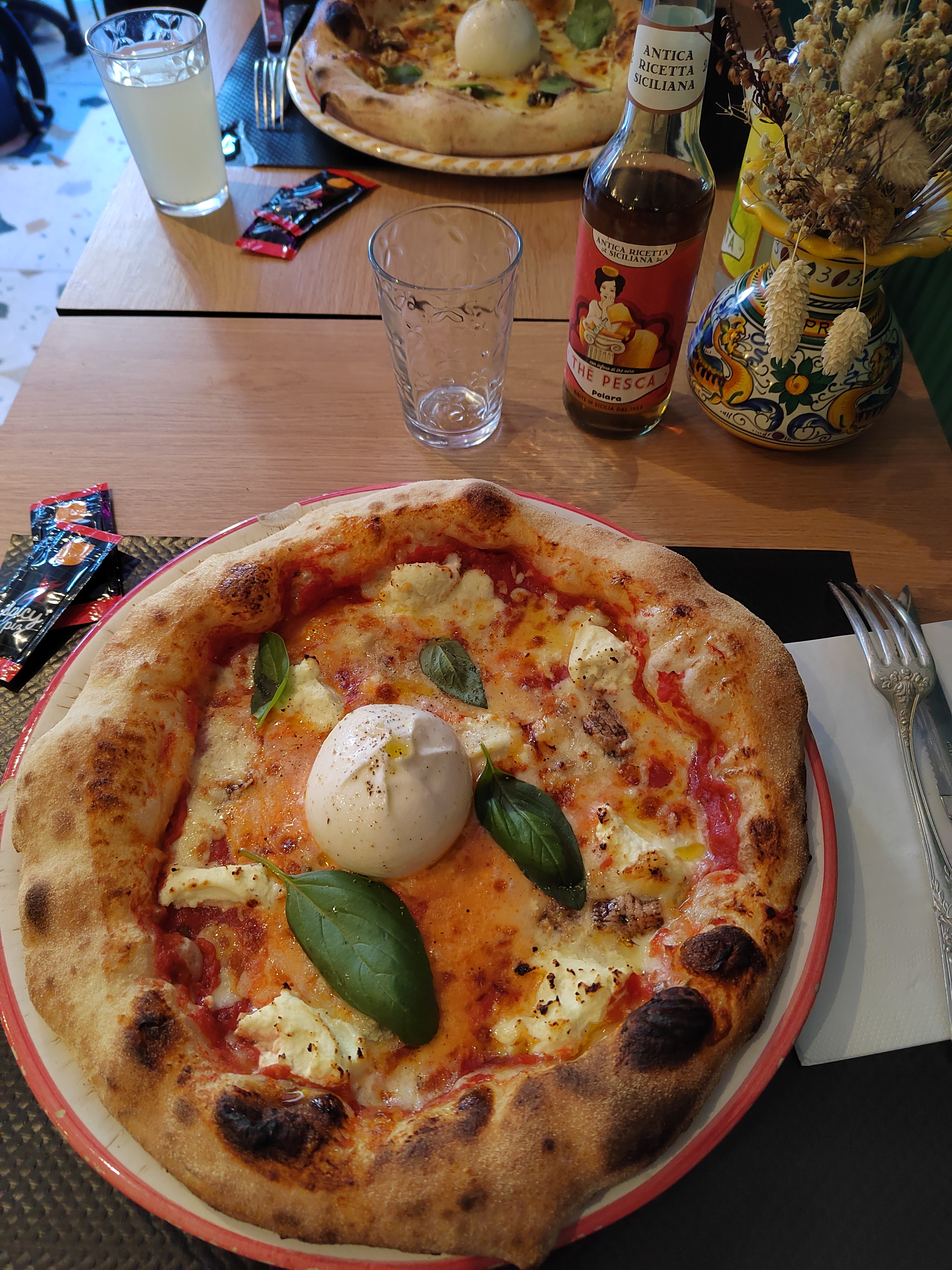 Les pizze sont très bonnes, de style napolitain (pâte qui repose 48h, trottoir épais et un peu cramé), de taille fort respectable pour leur prix. Les cannoli en dessert étaient top également. Le service est ultra sympathique et les assiettes rappellent la Sicile : un sans faute !
