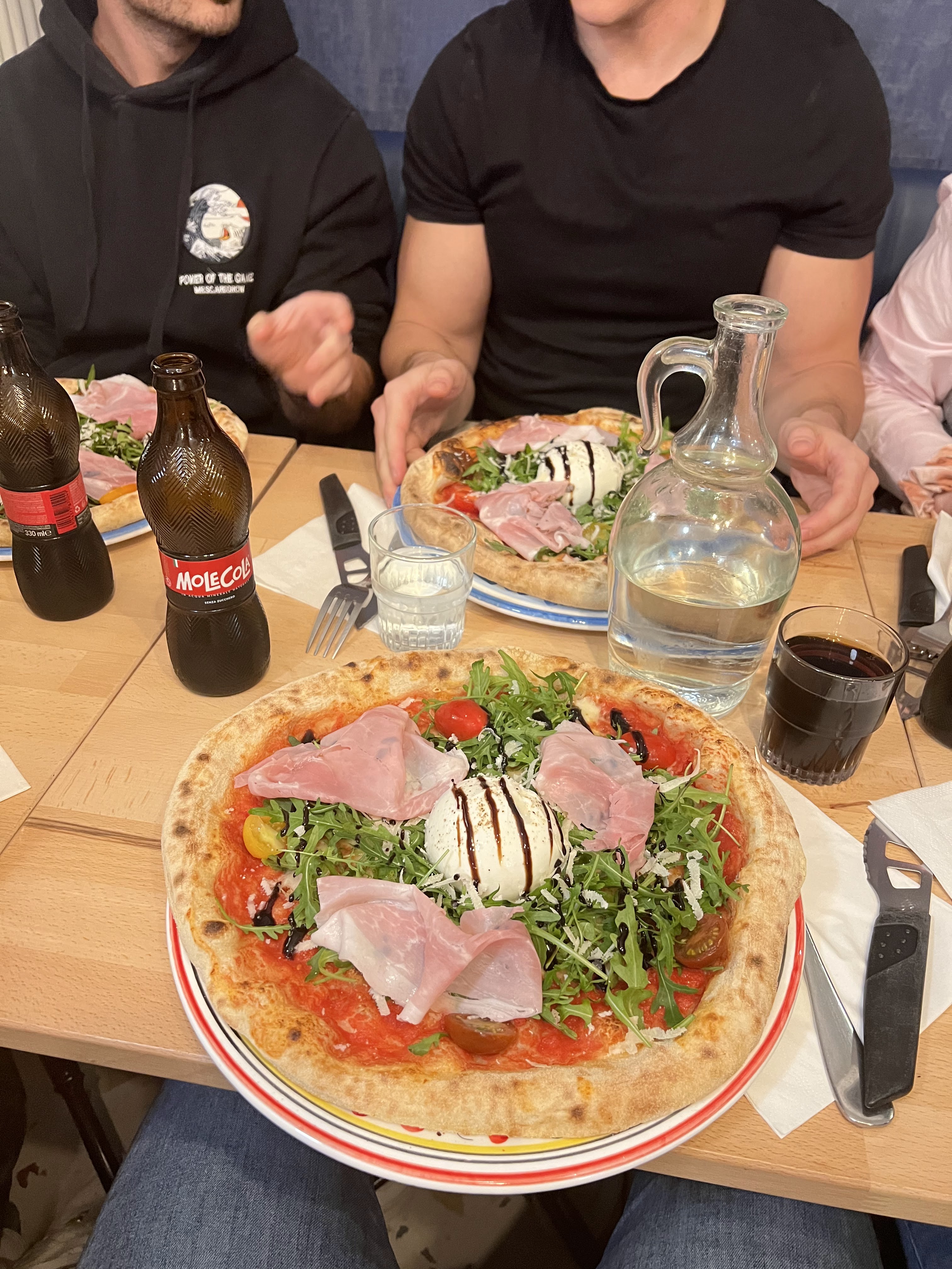 Agréablement surprise par la nourriture : gnocchis à la bolognaise très bon (d’après mes amis) et pizzas excellentes (Monica) Prix correspondants à la qualité de ce que vous avons mangé !